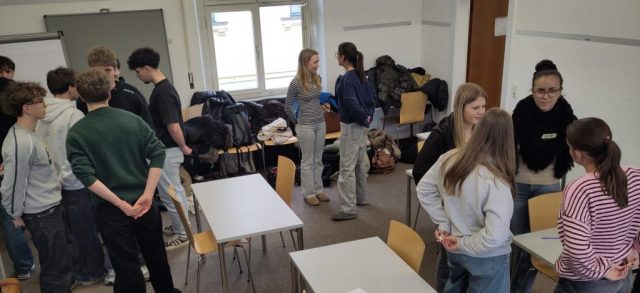Der Kurs „Politik und Gesellschaft“ der Q12 unter Leitung von Janina Fast durchlief beim Besuch an der Universität den von Studierenden unterschiedlicher Studiengänge unter der Leitung von Dr. Annekatrin Meißner (Institut Ethik WAW), PD Dr. Martina Maletzky de García (Lehrstuhl für Interkulturelle Kommunikation) und Dr. Julia Blanc (Lehrstuhl für Theologische Ethik) entwickelten Parcours. Ziel ist es, Nachhaltigkeit durch praxisnahe Erfahrungen, Reflexionen und kulturelle Vergleiche zu fördern. Der Parcours umfasst verschiedene Übungen, die jeweils einen anderen Aspekt der Inner Development Goals adressieren: