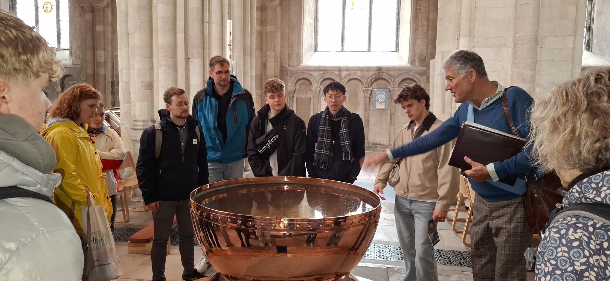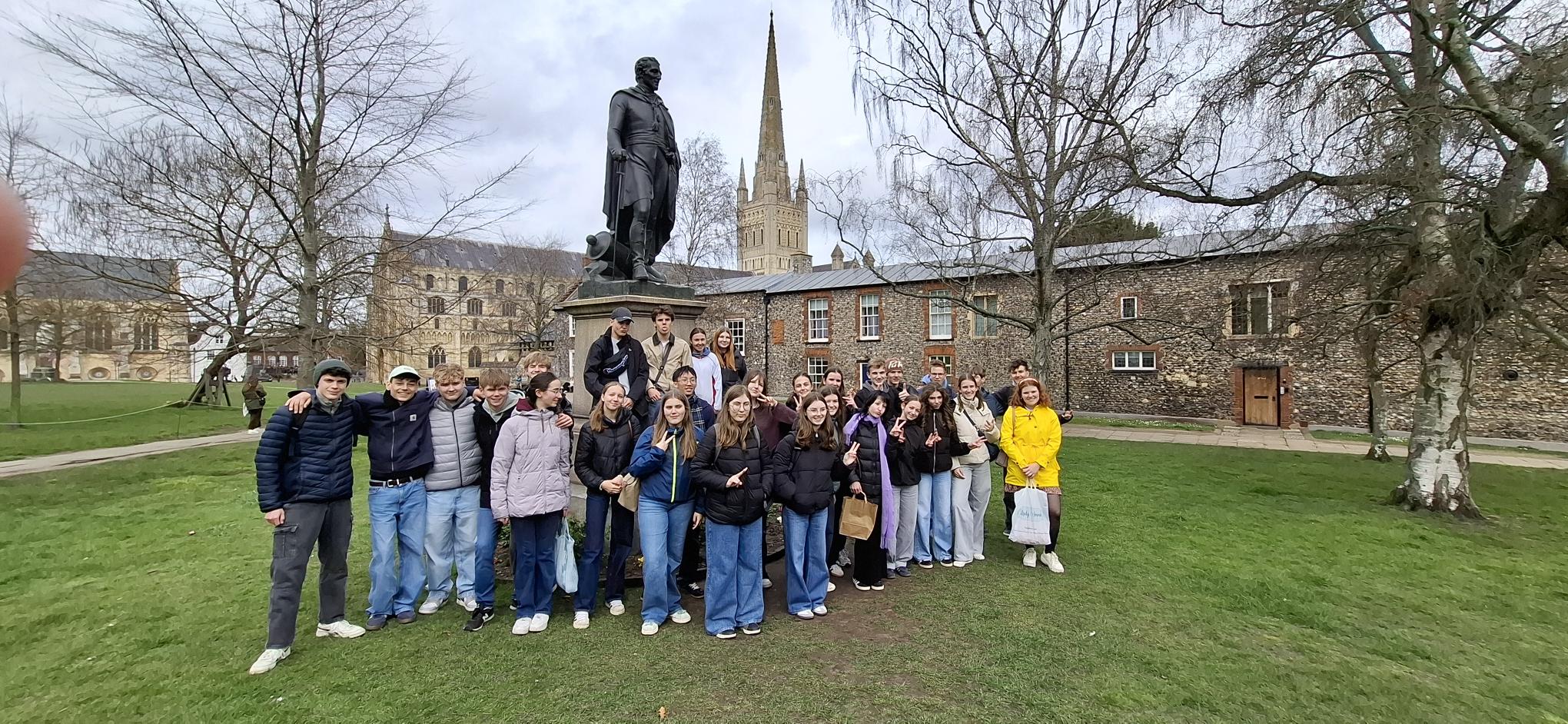 Am ersten offiziellen Exkursionstag ging es nach Norwich in der Grafschaft Norfolk. Da Christian Schöttner dort ein Jahr an der University of East Anglia (UEA) studiert hatte, konnte er die Stadt fachkundig präsentieren. Die Route führte vorbei am normannischen Castle und elisabethanischen Gebäuden hin zur beeindruckenden Kathedrale. Während einer anschließenden Führung erfuhren die Schüler viel Wissenswertes über das vorwiegend romanische Bauwerk. Ein besonderer Liebling der Gruppe war die Kathedralen-Katze „Budge“, die den Anekdoten der Guides ebenso aufmerksam zu lauschen schien wie die Gäste aus Passau. Dank der klaren Sprache der Tourguides fiel es den Schülern leicht, den Ausführungen zu folgen und eigene Fragen zu stellen.