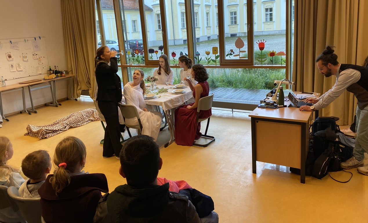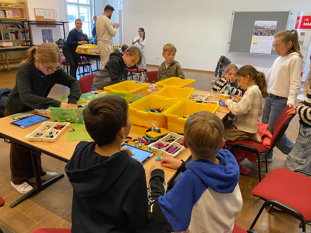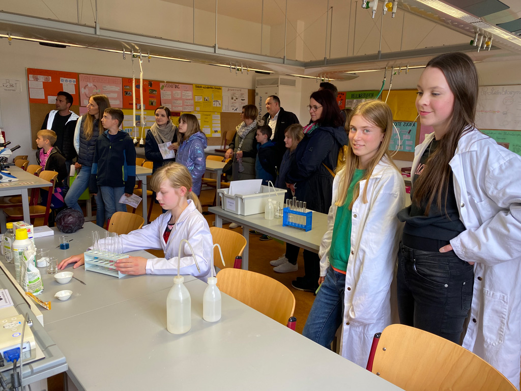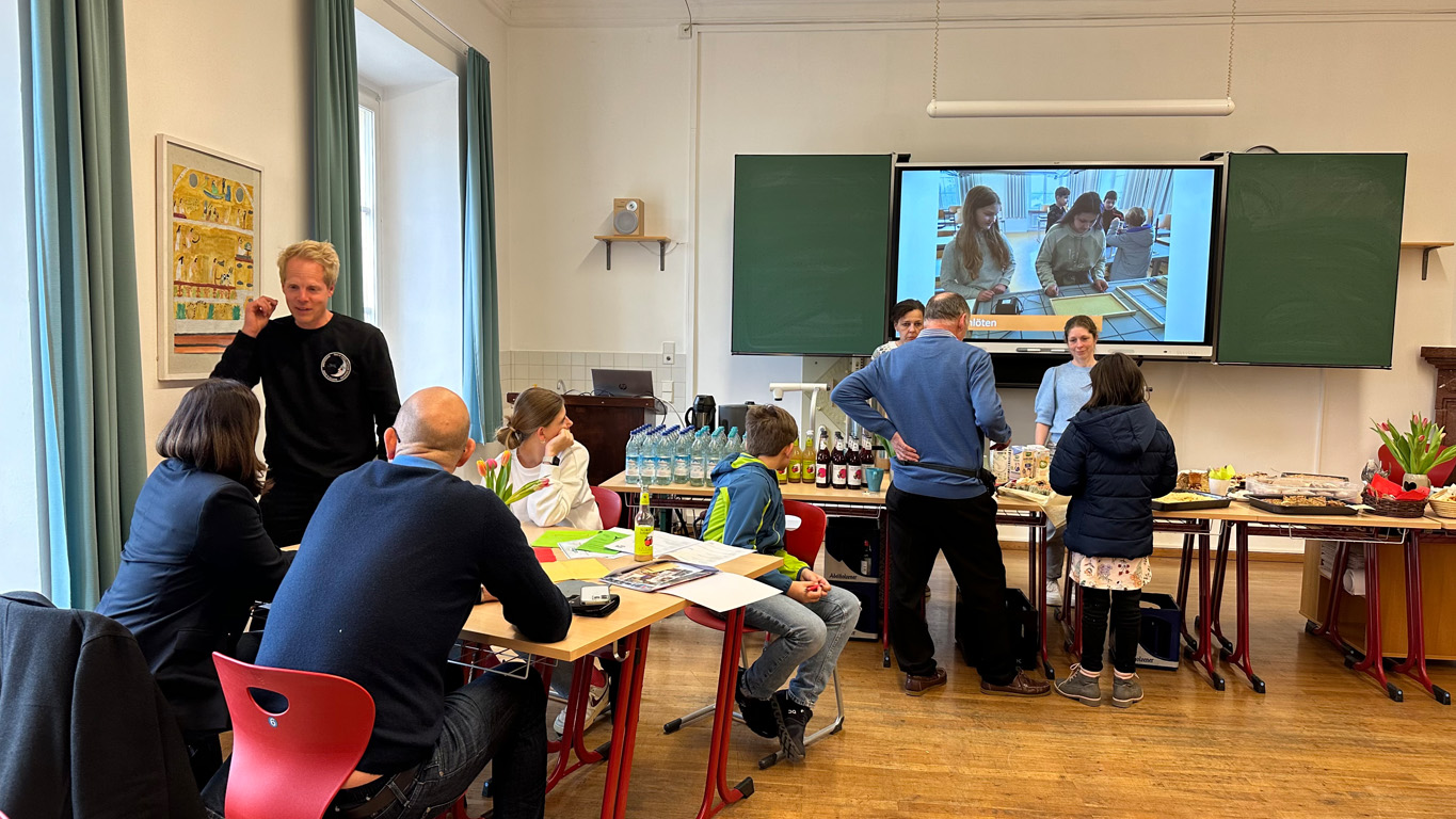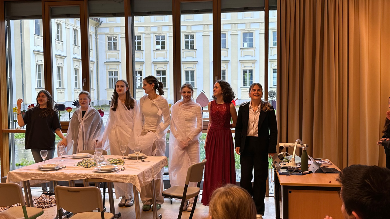 Das weitläufige Schulgelände hinter dem Hauptbau bietet einen kleinen Park zum Erholen, einen Fußballplatz und einen Schulgarten – alles gerne genutzt von den Kindern des Offenen Ganztags. Einen besonderen Charme besitzt das historische Schulgebäude mit Festsaal, eigener Schlosskirche und Rosengarten. In vielen Räumen waren besondere Aktivitäten für die Kinder vorbereitet, z.B. ein Sportparcours, kleine chemische Versuche, Ratespiele, ein Instrumente-Schnuppern, Bauen und Programmieren von Legorobotern und vieles mehr. Nach den Führungen konnte der Nachwuchs seine Lieblingsaktivitäten vertiefen, während sich die Eltern im vom Elternbeirat betreuten Café austauschten. Einen besonderen Leckerbissen bot Lateinlehrer Quirin Würfl am ersten Besuchsnachmittag mit sechs Schülerinnen der 9a, die „Dinner for One“ auf Lateinisch aufführten und großen Applaus ernteten. Ihre Freude an der Musik zeigten musizierende Schüler quer durch alle Klassen, die als Solisten, in kleinen Ensembles oder mit der Bigband im Festsaal oder in den Gängen auftraten. Bis in den frühen Abend hinein blieben manche Familien, um das breitgefächerte Angebot zu genießen.