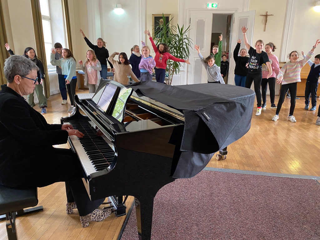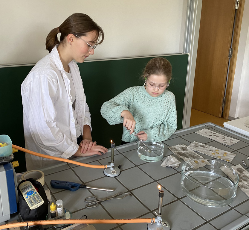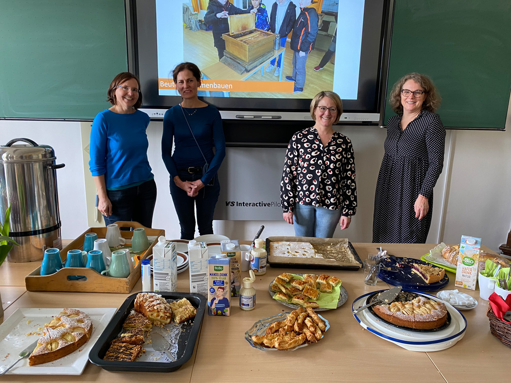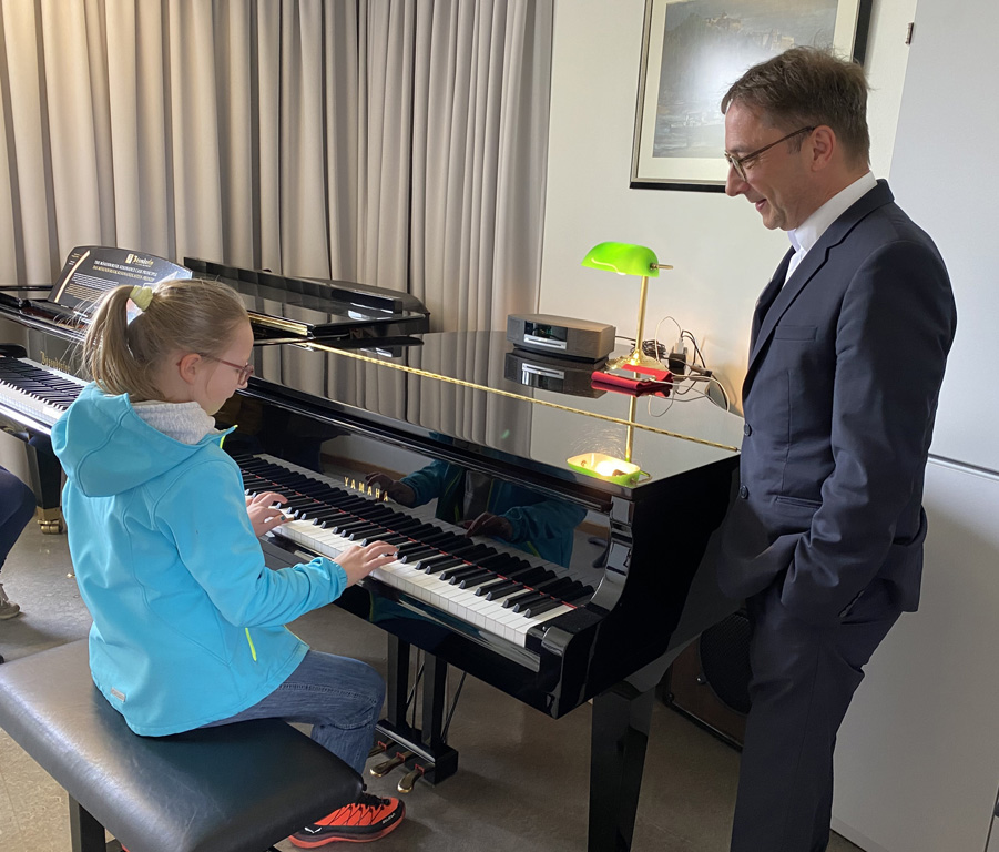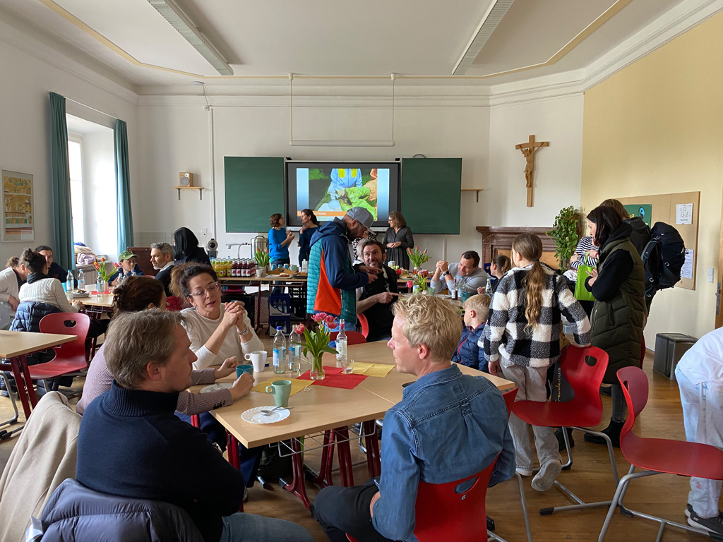 Das weitläufige Schulgelände hinter dem Hauptbau bietet einen kleinen Park zum Erholen, einen Fußballplatz und einen Schulgarten – alles gerne genutzt von den Kindern des Offenen Ganztags. Einen besonderen Charme besitzt das historische Schulgebäude mit Festsaal, eigener Schlosskirche und Rosengarten. In vielen Räumen waren besondere Aktivitäten für die Kinder vorbereitet, z.B. ein Sportparcours, kleine chemische Versuche, Ratespiele, ein Instrumente-Schnuppern, Bauen und Programmieren von Legorobotern und vieles mehr. Nach den Führungen konnte der Nachwuchs seine Lieblingsaktivitäten vertiefen, während sich die Eltern im vom Elternbeirat betreuten Café austauschten. Einen besonderen Leckerbissen bot Lateinlehrer Quirin Würfl am ersten Besuchsnachmittag mit sechs Schülerinnen der 9a, die „Dinner for One“ auf Lateinisch aufführten und großen Applaus ernteten. Ihre Freude an der Musik zeigten musizierende Schüler quer durch alle Klassen, die als Solisten, in kleinen Ensembles oder mit der Bigband im Festsaal oder in den Gängen auftraten. Bis in den frühen Abend hinein blieben manche Familien, um das breitgefächerte Angebot zu genießen.