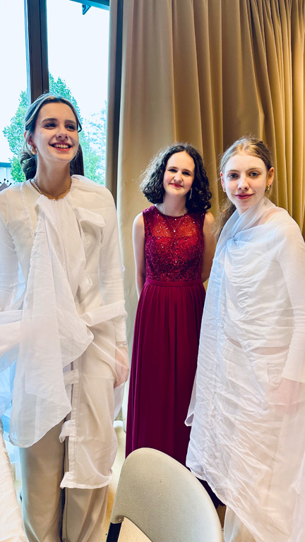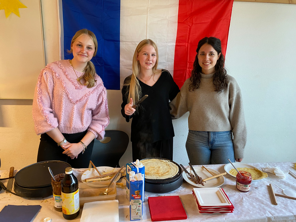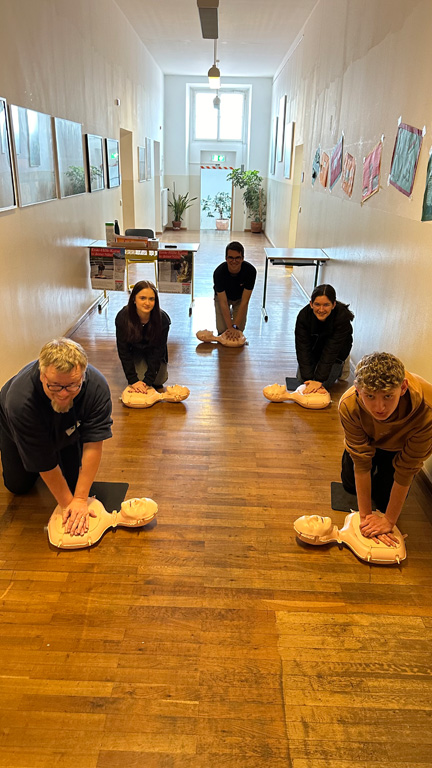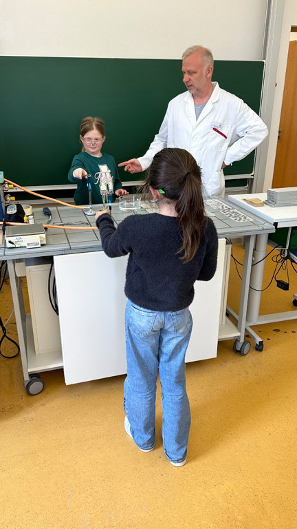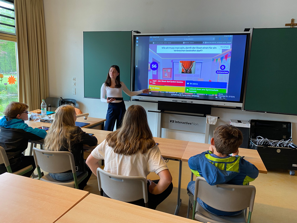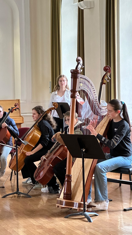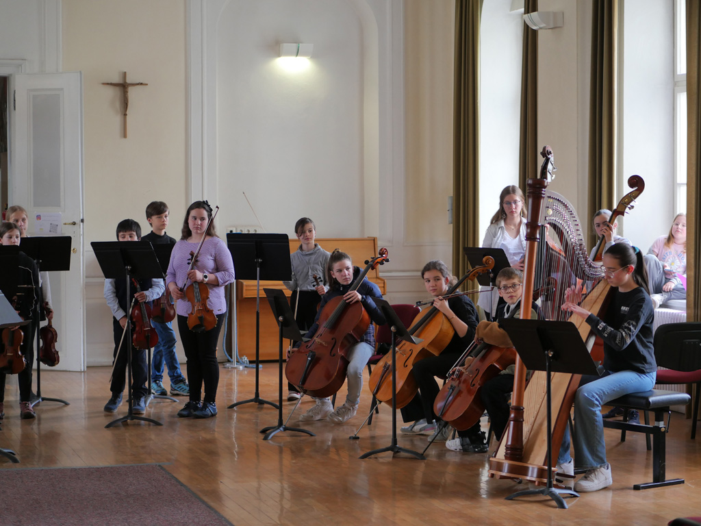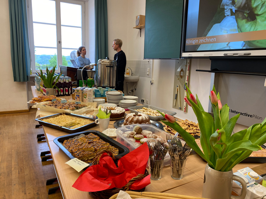 Das weitläufige Schulgelände hinter dem Hauptbau bietet einen kleinen Park zum Erholen, einen Fußballplatz und einen Schulgarten – alles gerne genutzt von den Kindern des Offenen Ganztags. Einen besonderen Charme besitzt das historische Schulgebäude mit Festsaal, eigener Schlosskirche und Rosengarten. In vielen Räumen waren besondere Aktivitäten für die Kinder vorbereitet, z.B. ein Sportparcours, kleine chemische Versuche, Ratespiele, ein Instrumente-Schnuppern, Bauen und Programmieren von Legorobotern und vieles mehr. Nach den Führungen konnte der Nachwuchs seine Lieblingsaktivitäten vertiefen, während sich die Eltern im vom Elternbeirat betreuten Café austauschten. Einen besonderen Leckerbissen bot Lateinlehrer Quirin Würfl am ersten Besuchsnachmittag mit sechs Schülerinnen der 9a, die „Dinner for One“ auf Lateinisch aufführten und großen Applaus ernteten. Ihre Freude an der Musik zeigten musizierende Schüler quer durch alle Klassen, die als Solisten, in kleinen Ensembles oder mit der Bigband im Festsaal oder in den Gängen auftraten. Bis in den frühen Abend hinein blieben manche Familien, um das breitgefächerte Angebot zu genießen.