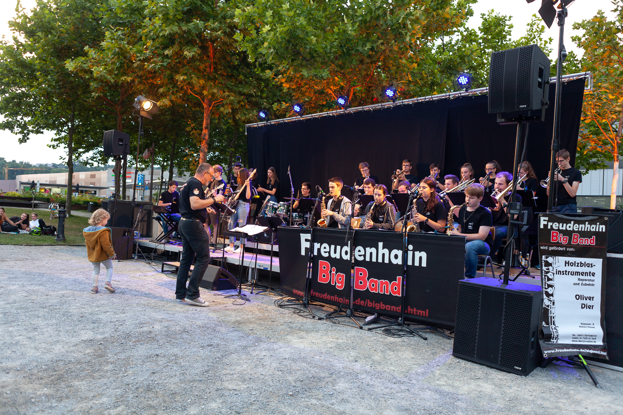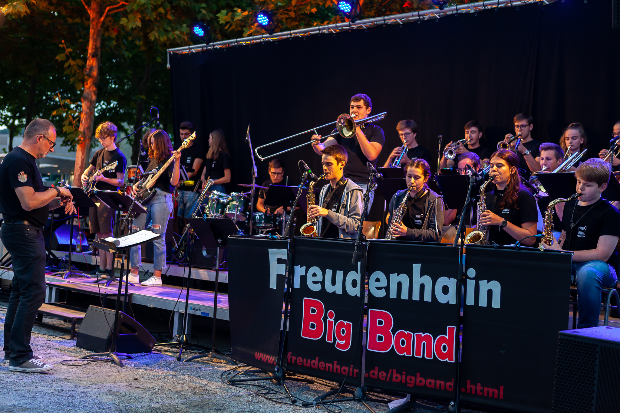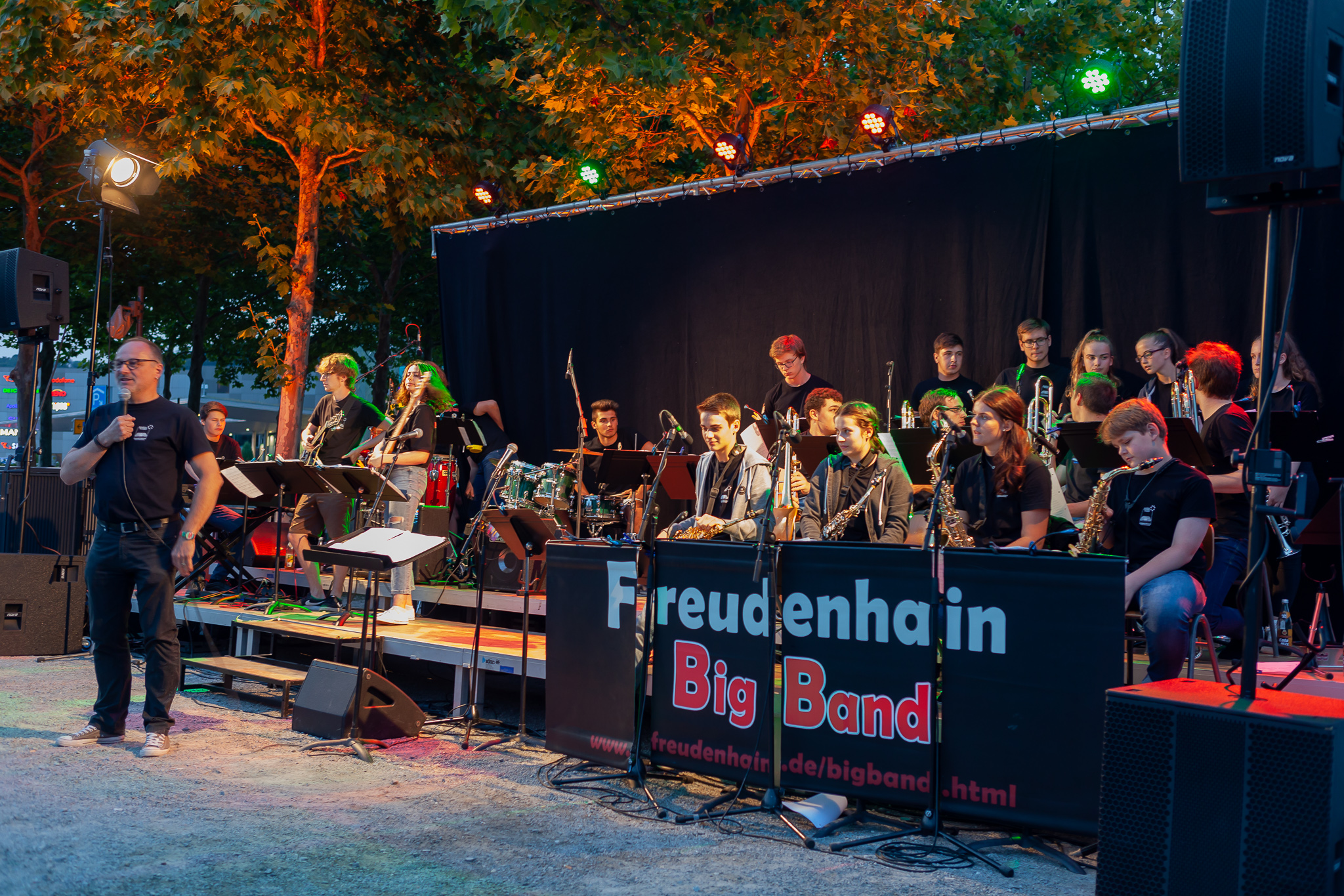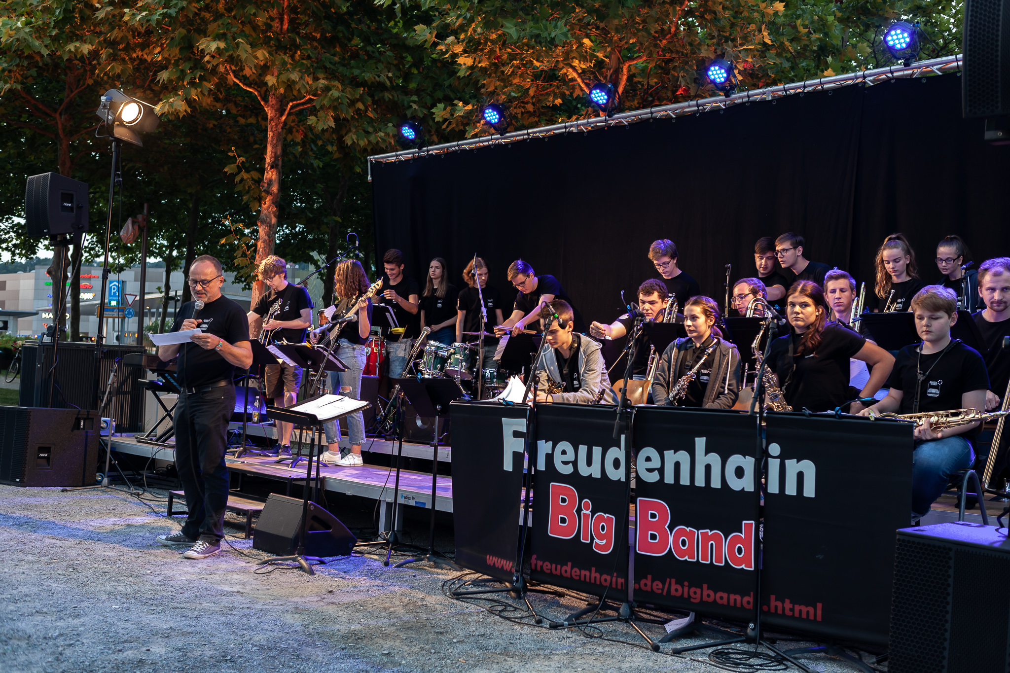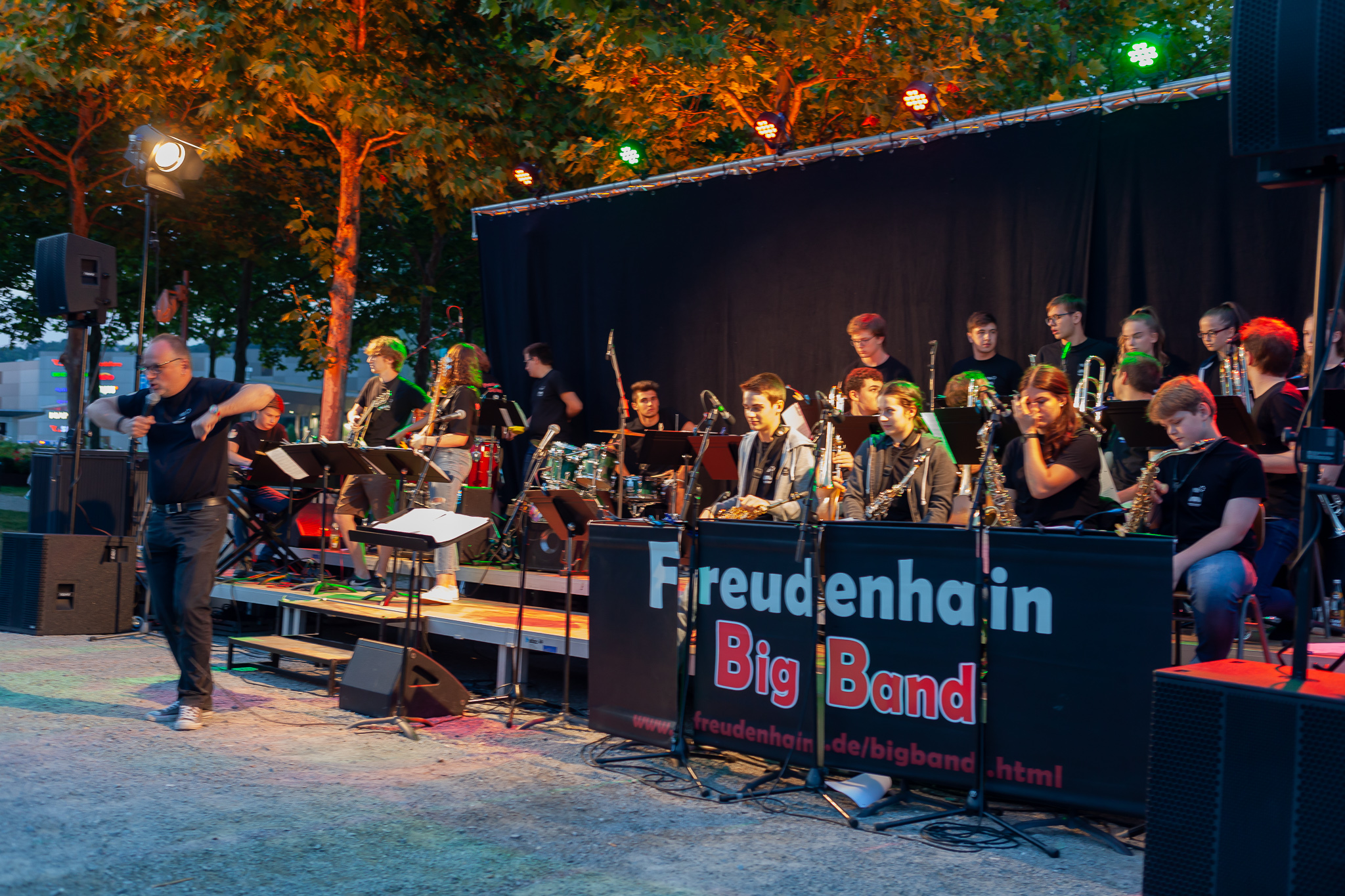 Großer Tag für die Big Band: Bei der „Blue night“ am Montagabend machte das Gymnasium Freudenhain wieder einmal seine musische Ausrichtung deutlich. Das Besondere daran ist der Ort, denn nicht hinter den schützenden Mauern des Schul-Schlosses präsentieren sich die Schüler-Musiker, sondern an einem der öffentlichsten Orte der Stadt, im Klostergarten. Damit ist klar, dass nicht nur Eltern, Geschwister und andere Angehörige im Publikum sitzen, sondern auch Passanten, fremde Zuhörer also. Umso höher steigt natürlich die Herzfrequenz bei den Schülern auf der Bühne, vor allem denen, die zum ersten Mal in der Big Band mitspielen. „Es müssen sich aber alle trauen zu improvisieren, auch die Neuen“, verrät Bandleader Christoph Rose ein Grundprinzip. Den Weg zum Selbstvertrauen meisterte denn auch jeder.