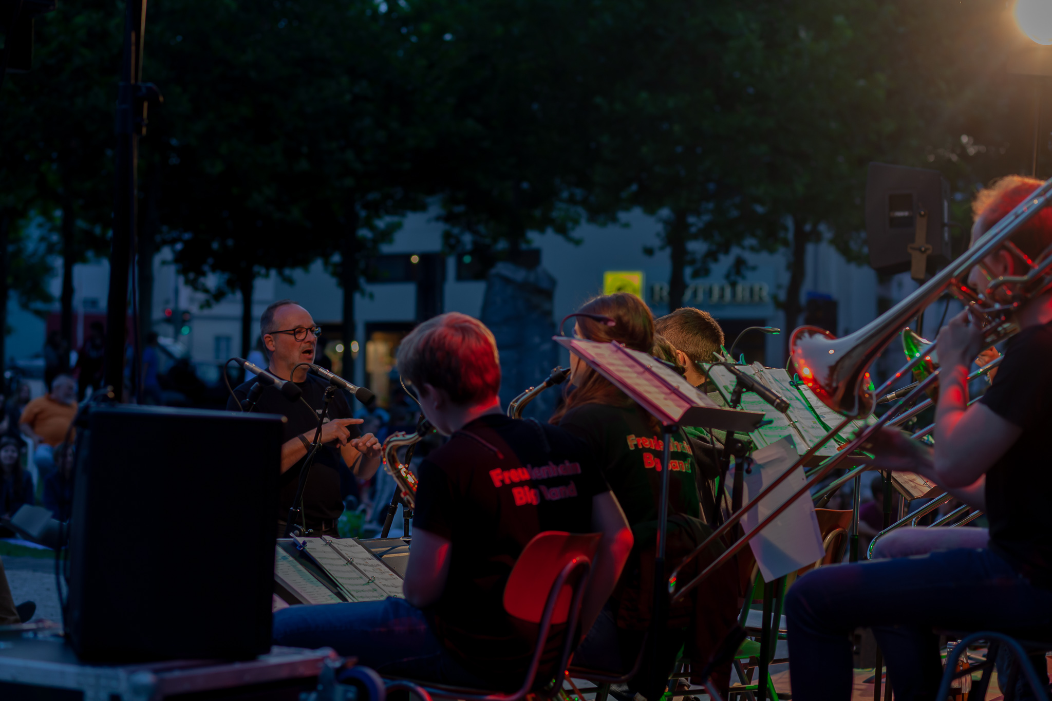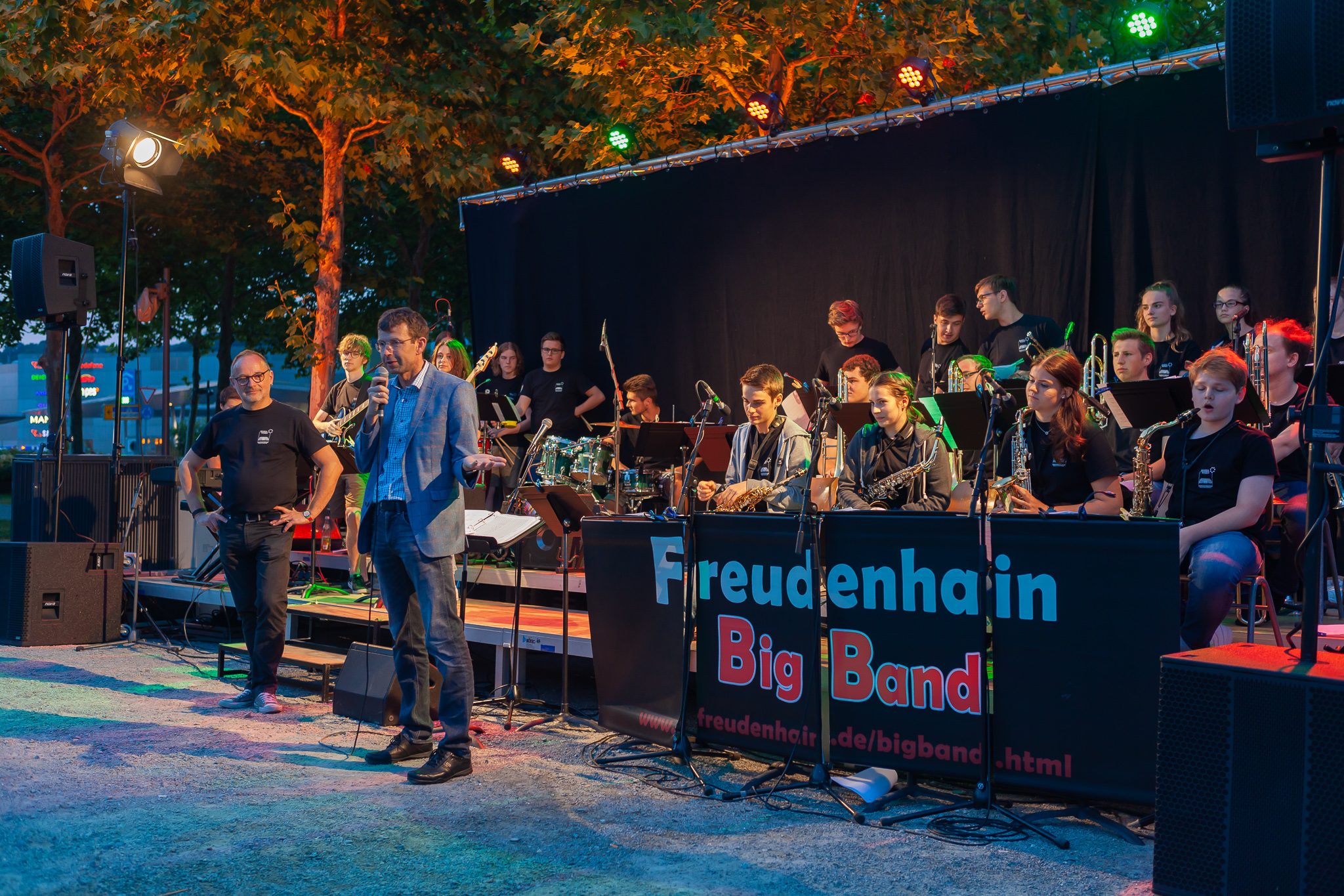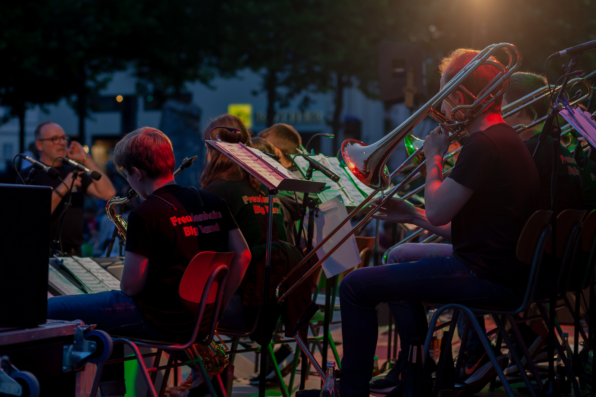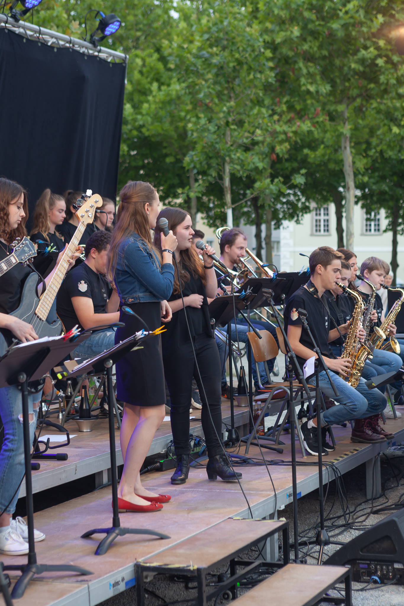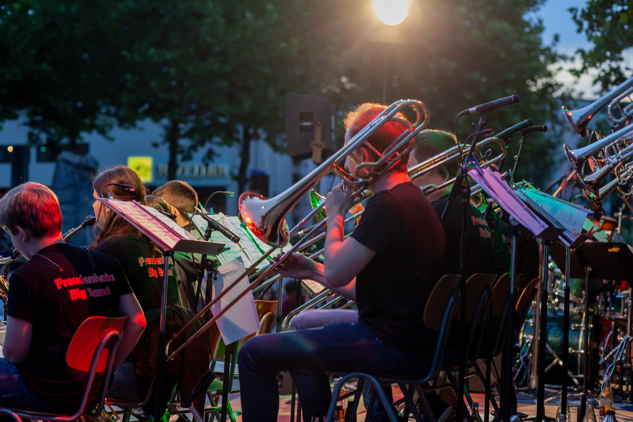 Großer Tag für die Big Band: Bei der „Blue night“ am Montagabend machte das Gymnasium Freudenhain wieder einmal seine musische Ausrichtung deutlich. Das Besondere daran ist der Ort, denn nicht hinter den schützenden Mauern des Schul-Schlosses präsentieren sich die Schüler-Musiker, sondern an einem der öffentlichsten Orte der Stadt, im Klostergarten. Damit ist klar, dass nicht nur Eltern, Geschwister und andere Angehörige im Publikum sitzen, sondern auch Passanten, fremde Zuhörer also. Umso höher steigt natürlich die Herzfrequenz bei den Schülern auf der Bühne, vor allem denen, die zum ersten Mal in der Big Band mitspielen. „Es müssen sich aber alle trauen zu improvisieren, auch die Neuen“, verrät Bandleader Christoph Rose ein Grundprinzip. Den Weg zum Selbstvertrauen meisterte denn auch jeder.