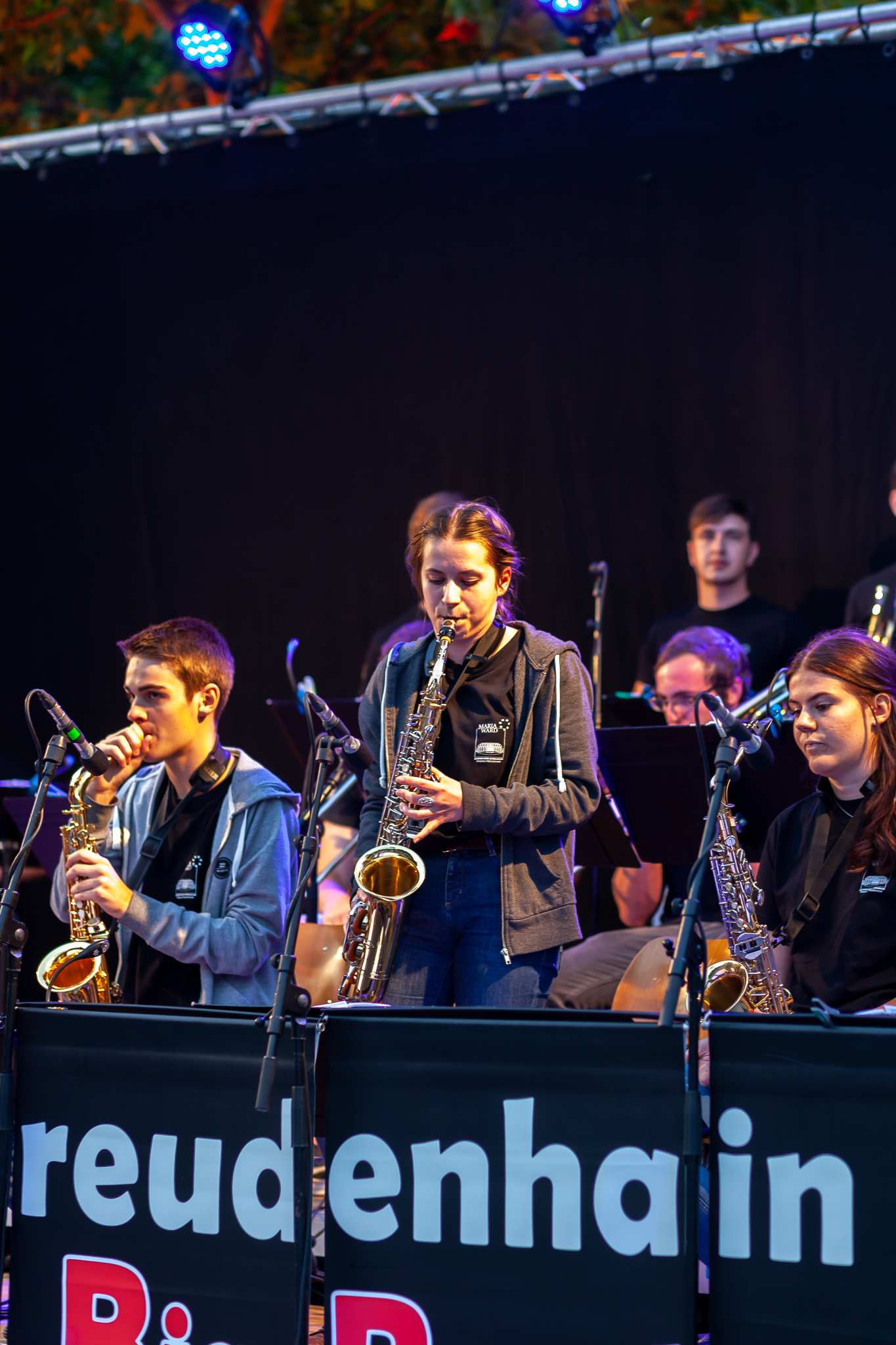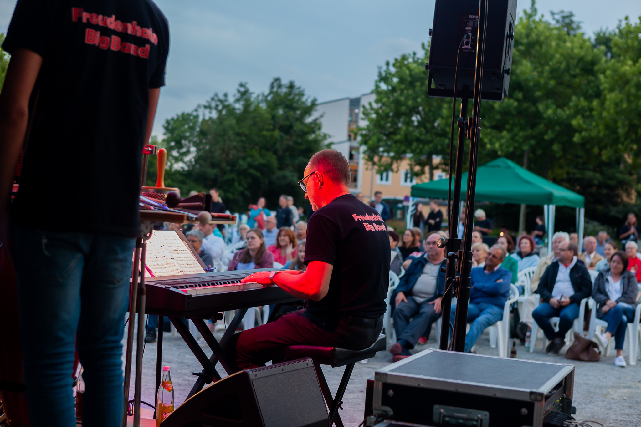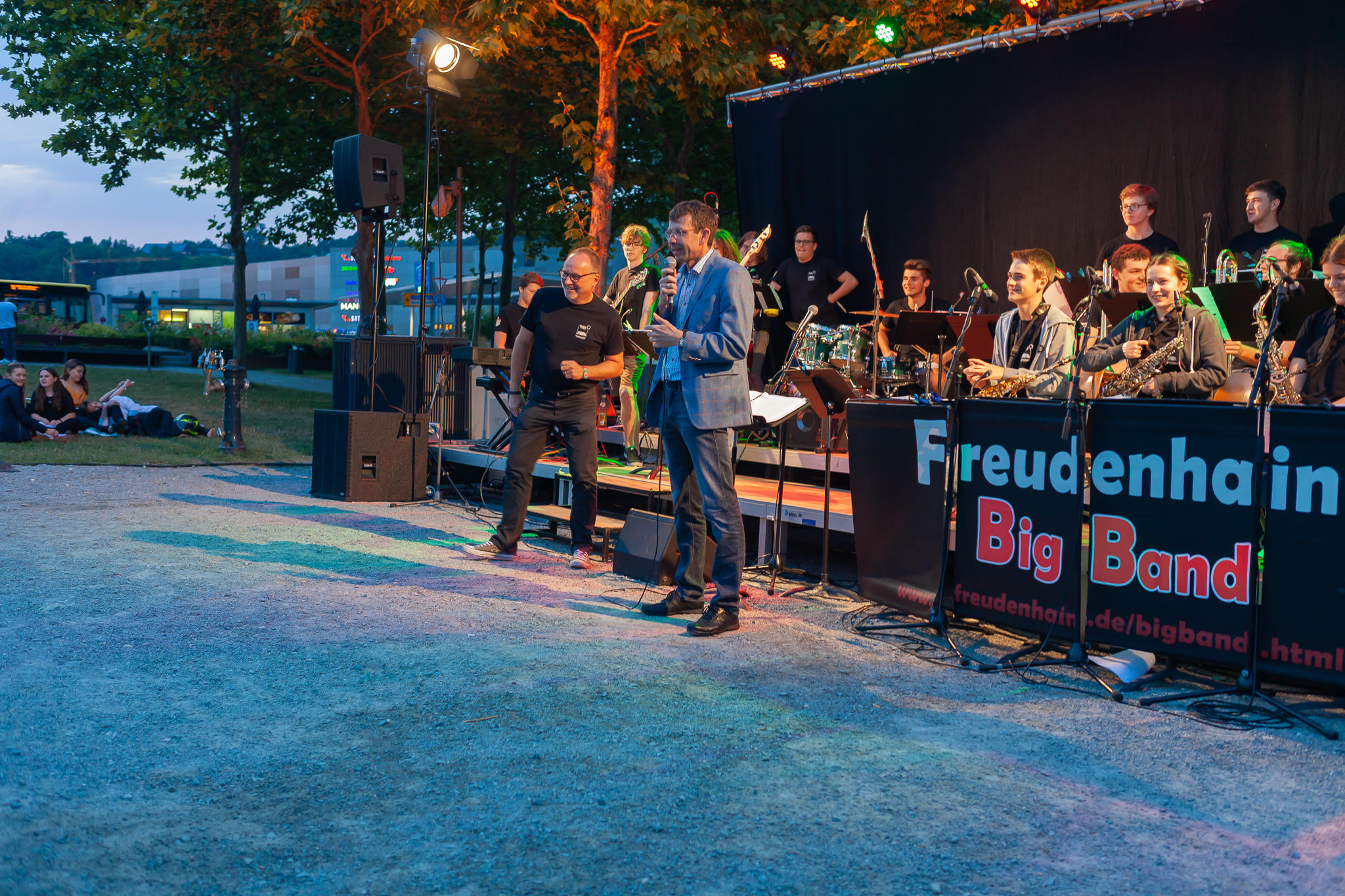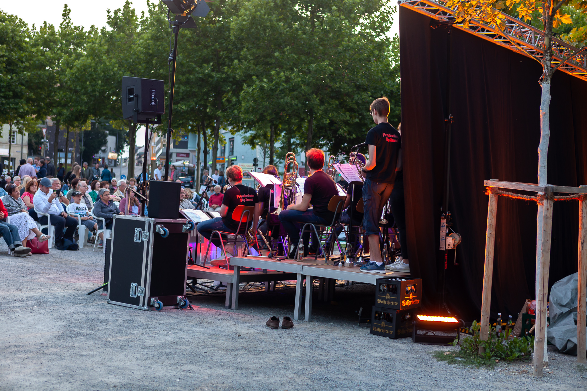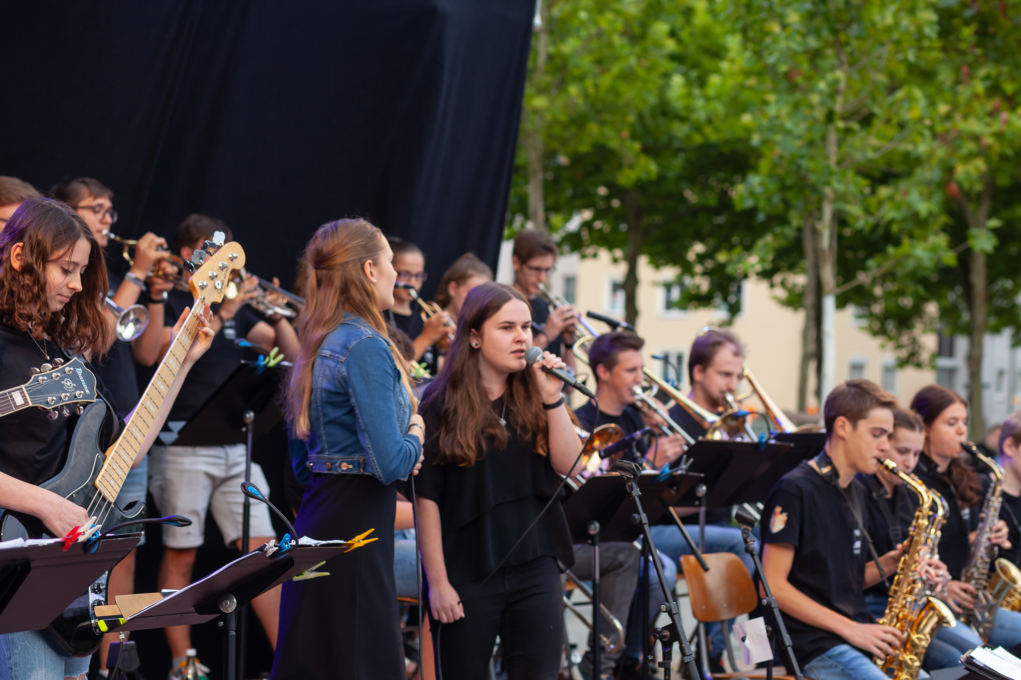 Großer Tag für die Big Band: Bei der „Blue night“ am Montagabend machte das Gymnasium Freudenhain wieder einmal seine musische Ausrichtung deutlich. Das Besondere daran ist der Ort, denn nicht hinter den schützenden Mauern des Schul-Schlosses präsentieren sich die Schüler-Musiker, sondern an einem der öffentlichsten Orte der Stadt, im Klostergarten. Damit ist klar, dass nicht nur Eltern, Geschwister und andere Angehörige im Publikum sitzen, sondern auch Passanten, fremde Zuhörer also. Umso höher steigt natürlich die Herzfrequenz bei den Schülern auf der Bühne, vor allem denen, die zum ersten Mal in der Big Band mitspielen. „Es müssen sich aber alle trauen zu improvisieren, auch die Neuen“, verrät Bandleader Christoph Rose ein Grundprinzip. Den Weg zum Selbstvertrauen meisterte denn auch jeder.
