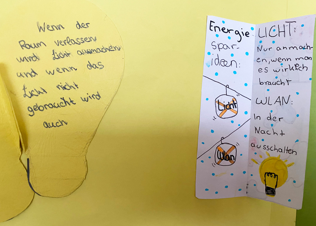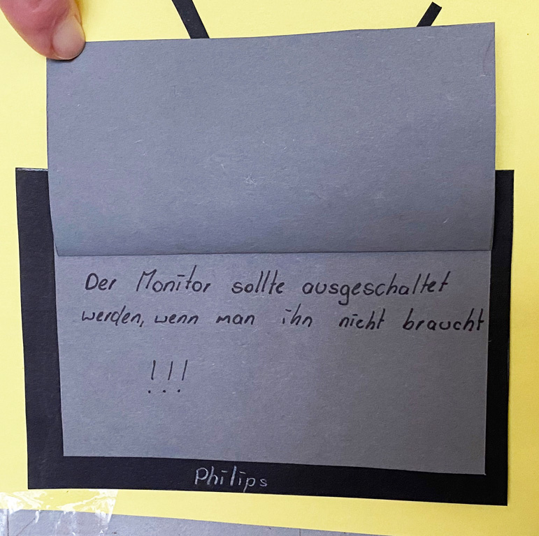 Viele Einsendungen gab es zum Energiespar-Wettbewerb, der zu Jahresbeginn von der Schulleitung ausgelobt worden war. Am originellsten und umfassendsten war der Beitrag der Klasse 6a. Sie hatte zusammen mit ihrer Klassleiterin Julia Fuchs viele Ideen zum Energiesparen gesammelt und auf einem Lapbook präsentiert, einer Art aufklappbarem Plakat. Wie ein Buch lässt es sich öffnen und unter den vielen Klappen im Inneren verbergen sich Ratschläge speziell für Nachhaltigkeit in der Schule, aber auch für daheim.