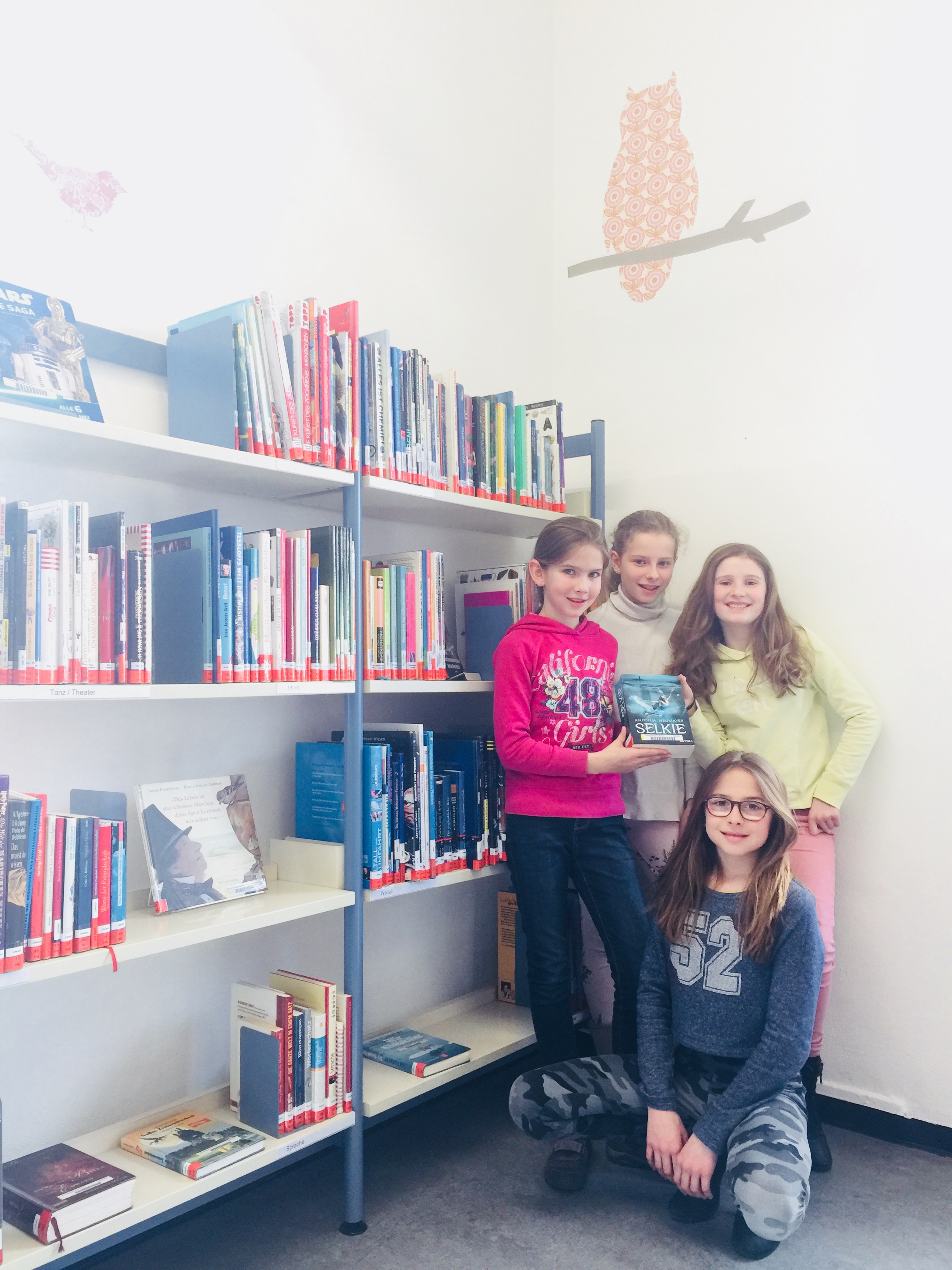 Neben Kinder- und Jugendbüchern, so erfuhren wird, bietet die Europa-Bücherei natürlich auch Literatur für Erwachsene, Zeitschriften, eine große DVD Sammlung, CDs, Spiele und gut verwahrt im „Gruselkabinett“ die Literatur, vor der sich Schüler besonders fürchten: Lernhilfen für Deutsch, Mathe, Englisch, Physik, Chemie und alles, was das Herz meist nicht begehrt, das Hirn doch manchmal fordert. Dass hier auch Ausstellungen stattfinden, das bewies uns schon der Schaukasten im Eingangsbereich. Aktuell ist eine „Patchworkausstellung“ über die Hausetagen verteilt und das genähte, weiße Steckenpferd-Einhorn stellte sich bei den Schülerinnen gleich zu Beginn der Hausrunde als großer Favorit heraus.