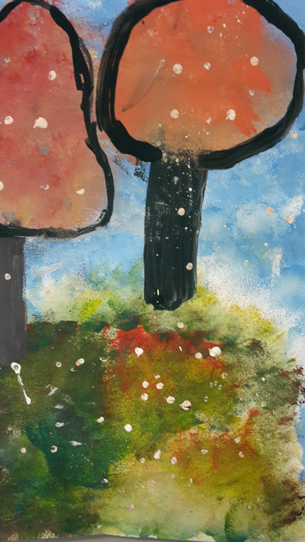 Die Schüler/-innen gestalteten ihre Bilder in Acryl und experimentierten hierbei mit Schwamm- und Tupftechnik . Obwohl es für die meisten aus dem Kurs das erste Mal war, dass sie mit dieser Art von Farben malten, mischten die Schüler mit großer Experimentierfreude und verblüffender Leichtigkeit die Farben - ausgegeben wurden nämlich nur die drei Grundfarben plus Weiß und Schwarz - und fast im Handumdrehen entstanden diese stimmungsvollen Winterlandschaften.