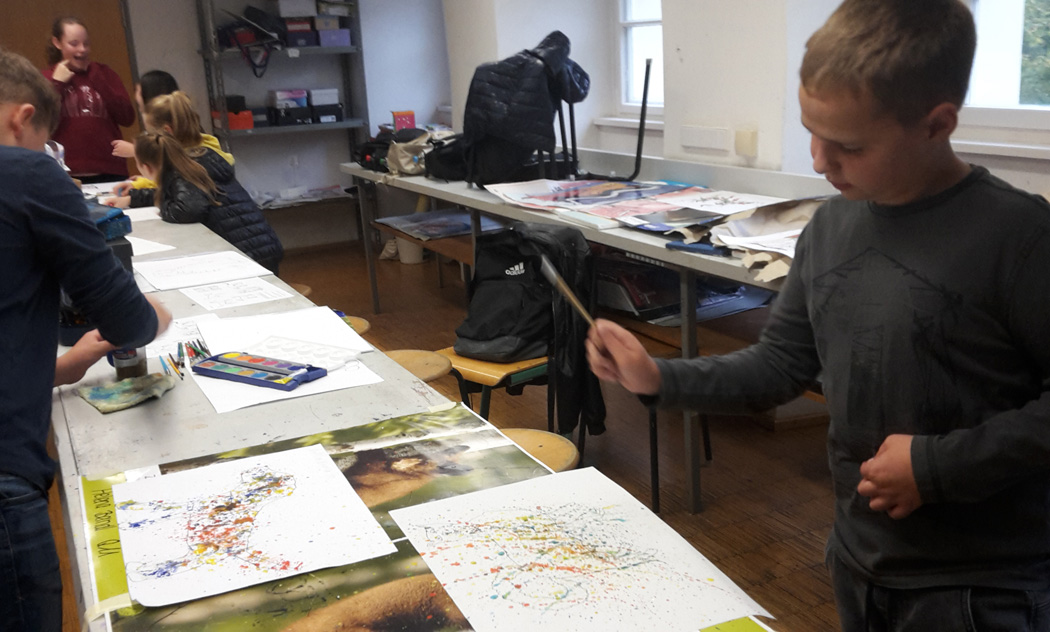 Drei Farbeimer in Rot, Gelb und Blau auf einer Leiter vor einer Passauer Metzgerei, eine Passantin mit einem großen weißen Hund, und ein kleiner Junge, der mit Leberkassemmel aus der Tür kommt ... Können Sie sich denken, wie es weitergeht ...? Die Schüler/-innen der 7a hatten da so einige Ideen, wie der große weiße Hund am Ende der Geschichte aussehen könnte, und setzten diese mit viel Fantasie und Farbe um. Nebenbei bot das Thema einen wunderbaren Einstieg für das Thema Farbe, da die subtraktive Farbmischung der Grundfarben hier ganz praktisch erlebt werden konnte.