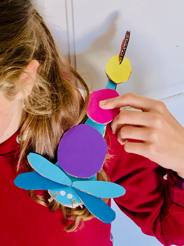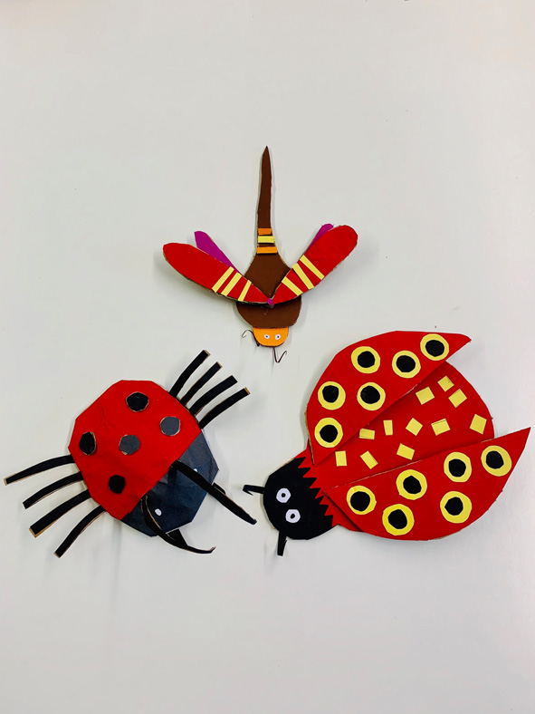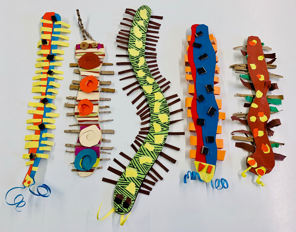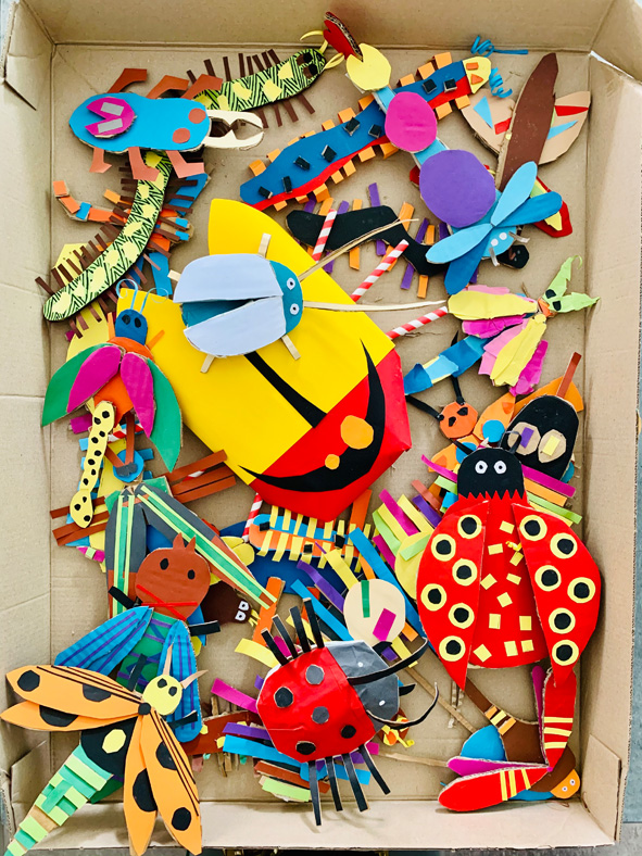Wenn es draußen kälter wird, dann krabbeln sie bevorzugt in unsere Wohnungen. Wenn man aber Glück hat, bleiben ein paar von ihnen draußen im Freien und fliegen noch eine Runde, sofern sie Flügel haben. Mit allem, was kriecht und fliegt, haben wir uns in Kunst die ersten Wochen beschäftigt. Aus Karton und Tonpapier sind so Käfer, Libellen, Schaben und Tausendfüßler entstanden. Auch wenn wir sie in unseren vier Wänden nicht so gerne haben, so werden sie nachgebildet und in Farbe fast zum Schmuckstück. Und dann ist es auch gar nicht „ekelig“, sie mal im Haar oder auf der Schulter rasten zu lassen… doch jetzt lassen wir sie wieder frei… Ursel Kraft
