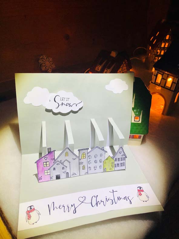 gestalteten unsere Schüler/-innen aus dem Distanzunterricht: Beim Auffalten der Weihnachtskarten öffnet sich jeweils etwas Dreidimensionales - ein Geschenk, ein gemütlicher Kamin, oder sogar ein ganzes Weihnachtsdorf.