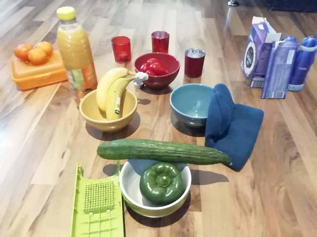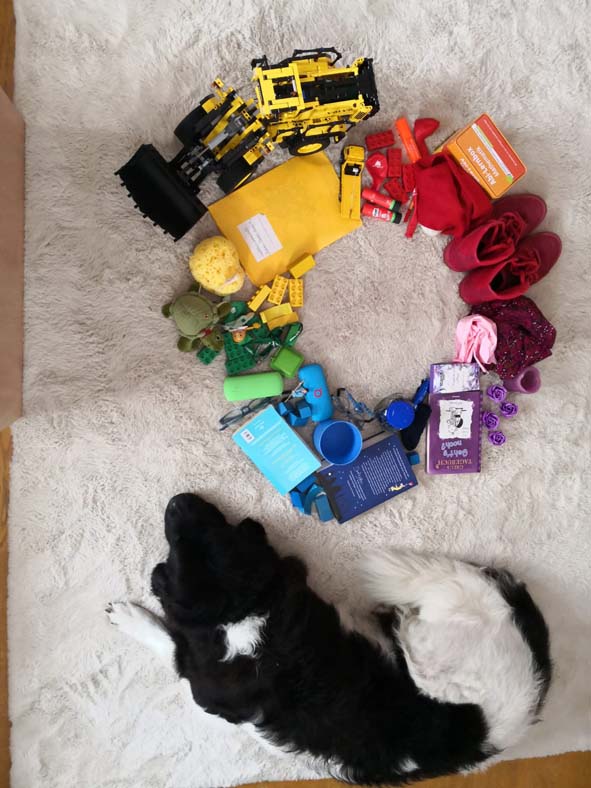 ging's im Distanzunterricht der Gruppe 7abc. Die Schüler zeigten viel Einfallsreichtum, um Ittens Farbkreis auf ihre ganz eigene Art und Weise umzusetzen, ob durch Plündern des Kühlschrankes oder Durchforsten des Spielzeugvorrats. Und Vierbeiner "Paula" setzte nebenbei noch ihr eigenes Statement zu den "unbunten" bzw. "Nicht-Farben" Schwarz und Weiß.