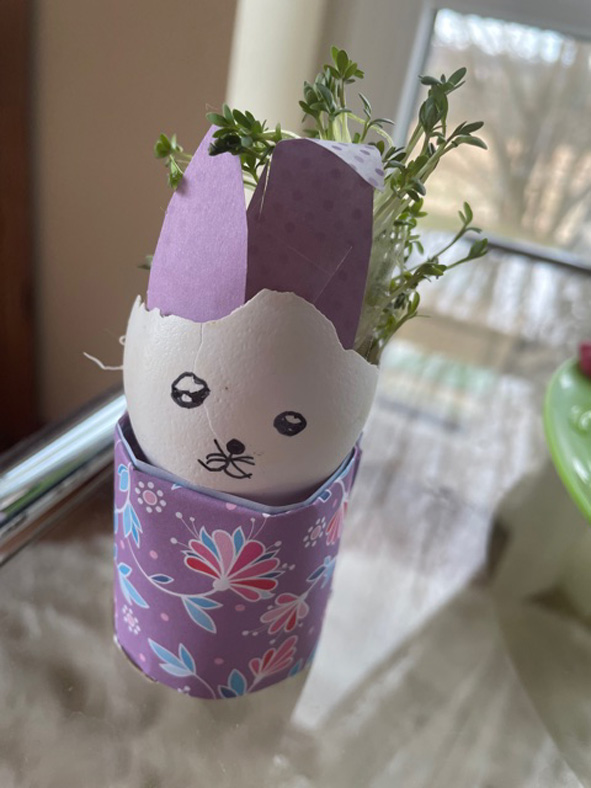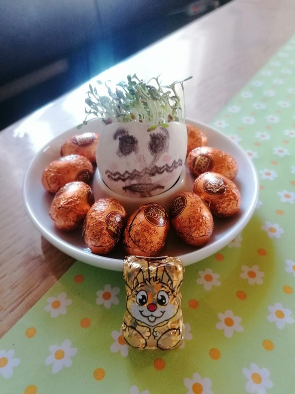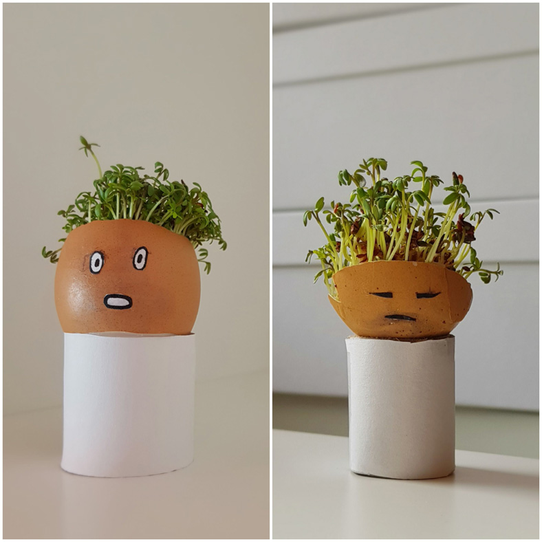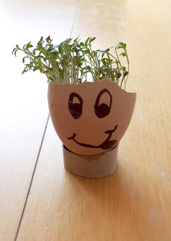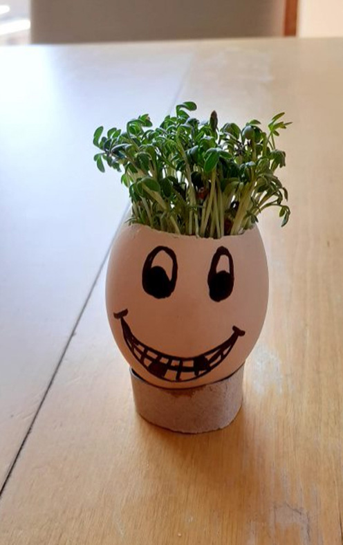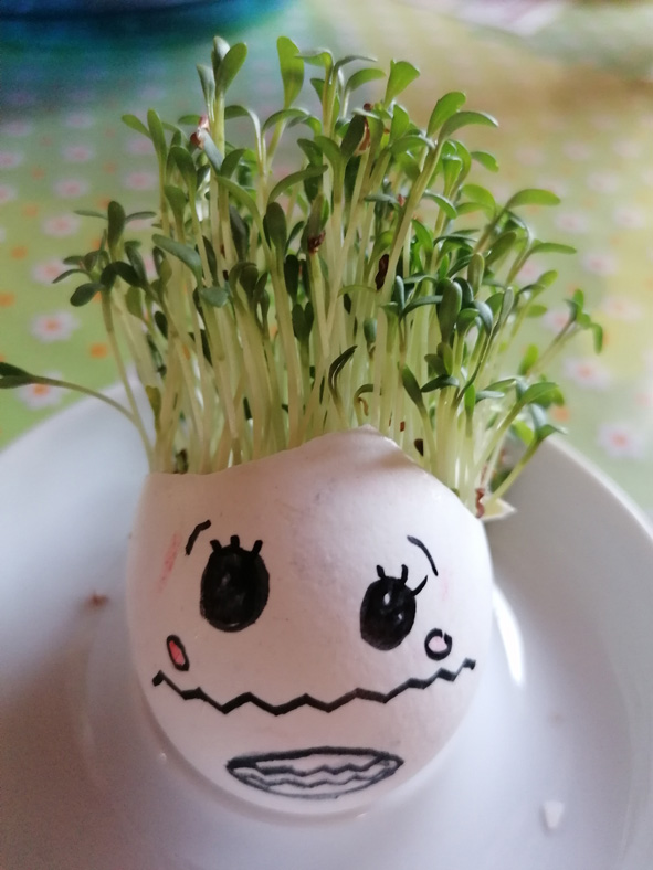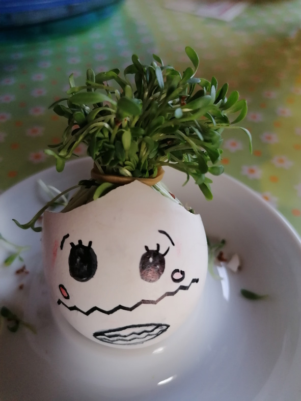 In einem kleinen Upcycling-Gärtner-Projekt bastelten die Schüler/-innen anschließend aus Eierschalen mit viel Fantasie punkige Ostereierköpfe und konnten beobachten, wie innerhalb kurzer Zeit lustige Frisuren wuchsen - vielleicht auch als Anregung für den nächsten Friseurbesuch ...?
