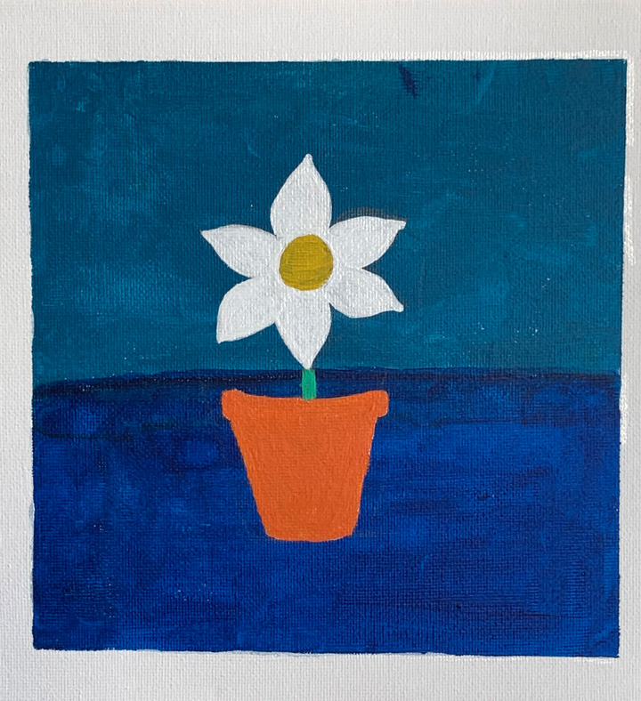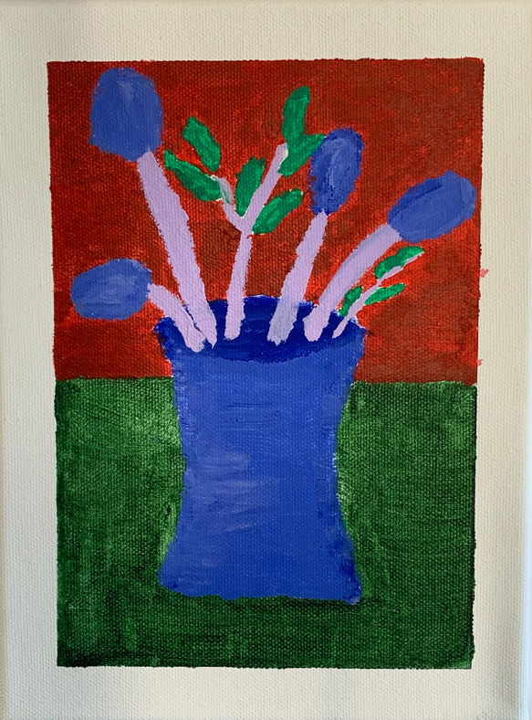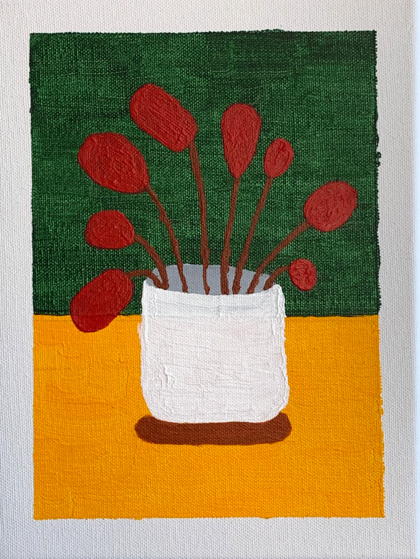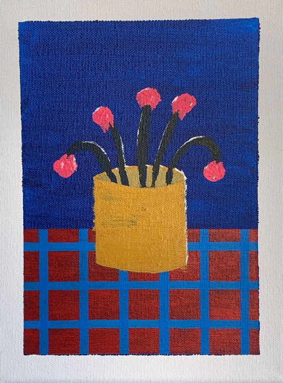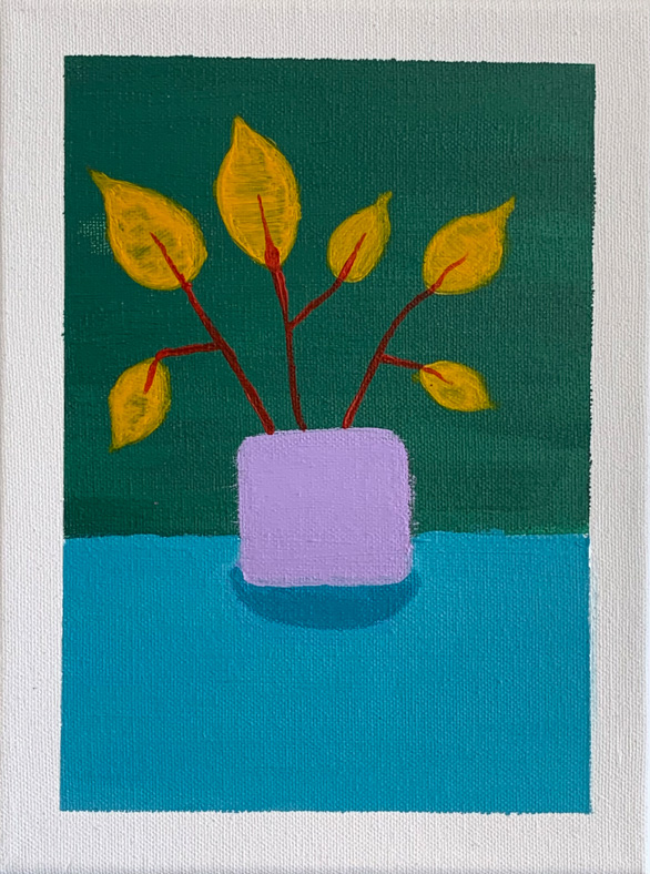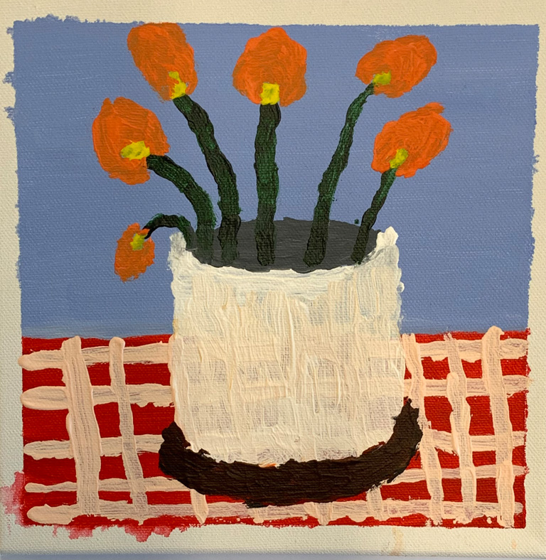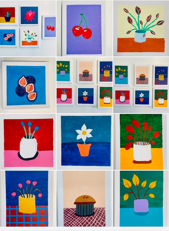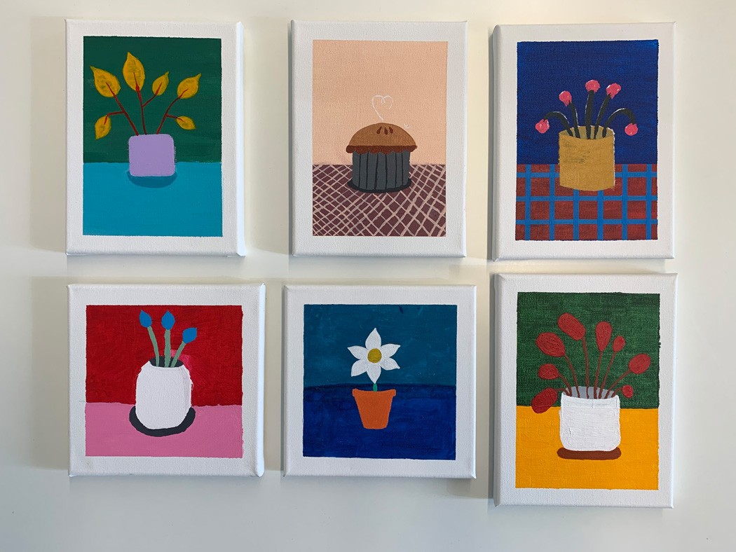 Damien French ist ein junger Maler, der seine kleinformatigen, bunten Acryl- und Gouachemalereien erfolgreich vermarktet. In Anlehnung an seine Kunst, Damien bildet mit Vorliebe Blumenarrangements oder Tierisches ab, hat sich der Kunstkurs 10bc an die Arbeit mit Acrylfarbe gemacht, soweit möglich mit Licht und Schatten gespielt und bunte, klare Stillleben umgesetzt.
