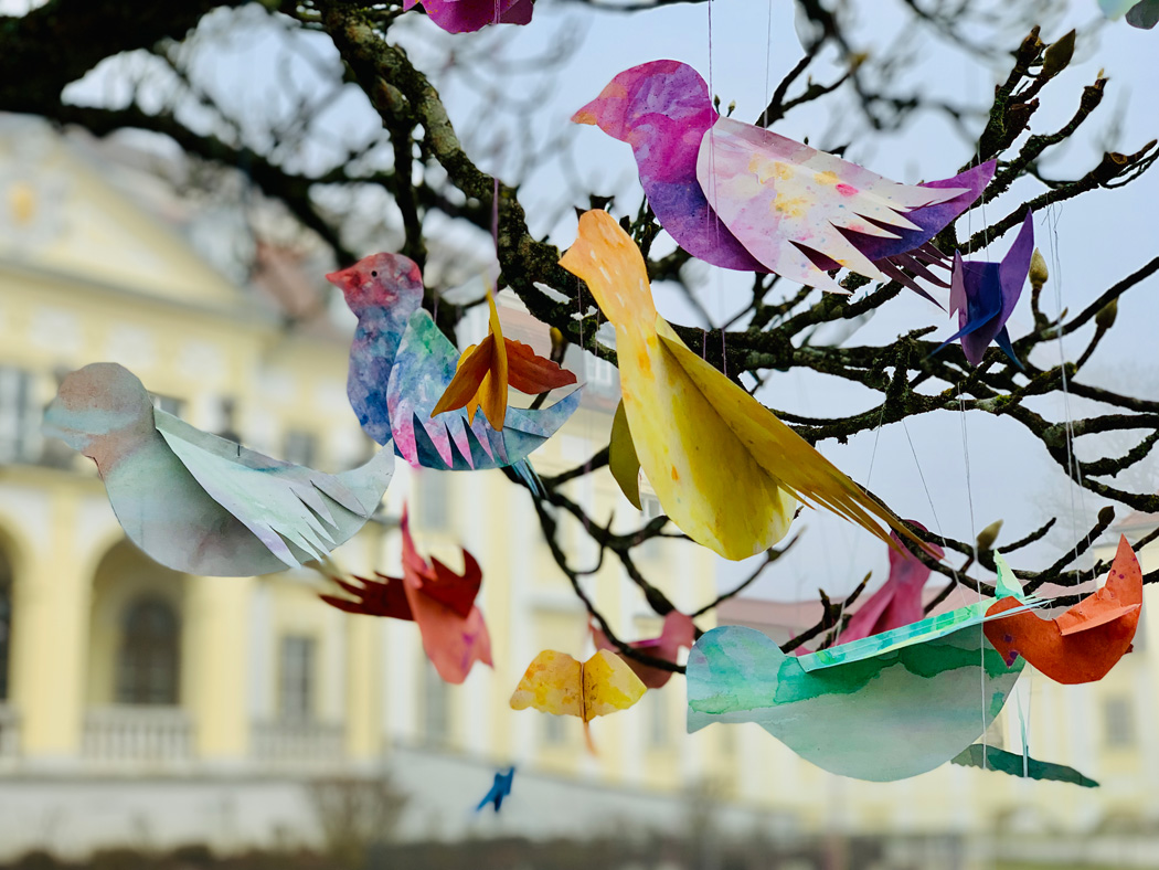 Der Winter war lang und grau. Wir brauchen wieder Farbe. Wir haben uns eine Schar bunter Zugvögel gebastelt. Papier marmoriert. Schablonen entworfen. Zwei Größen geschnitten. Alles zusammengeklebt. Mit Aufhängern versehen. Die Magnolie geschmückt. So ein Gezwitscher! Das hört sich nach Frühling an. Und so sieht es auch aus.