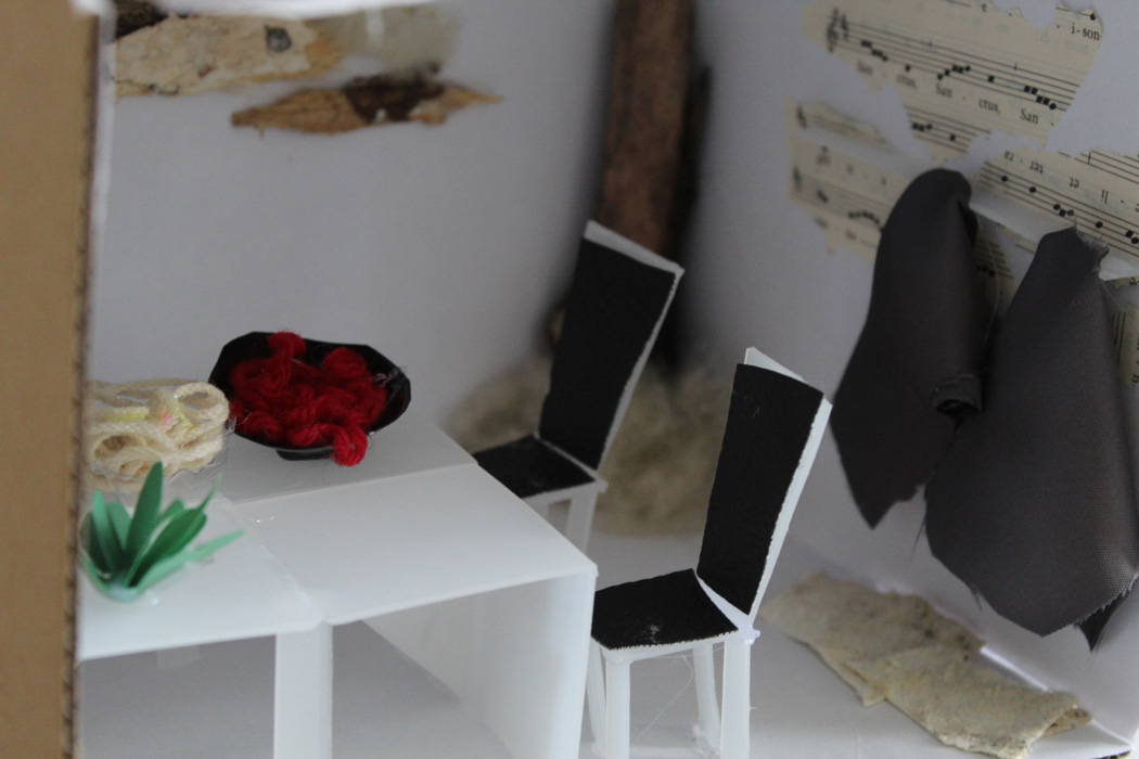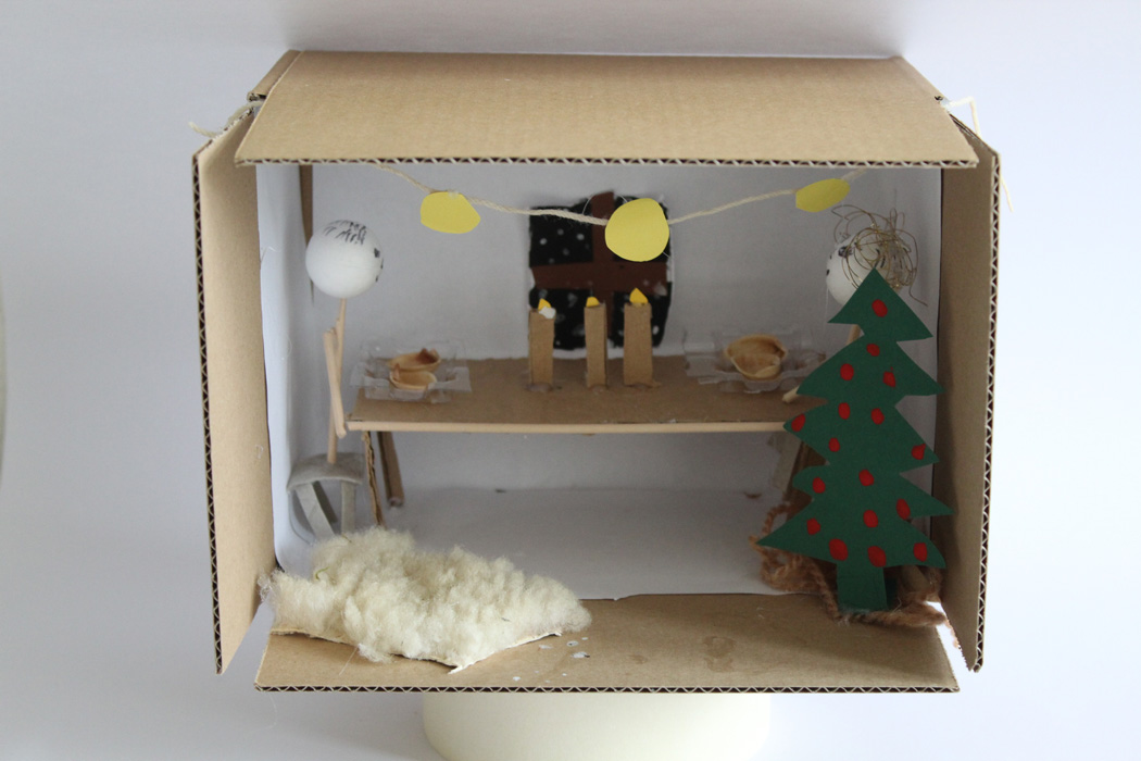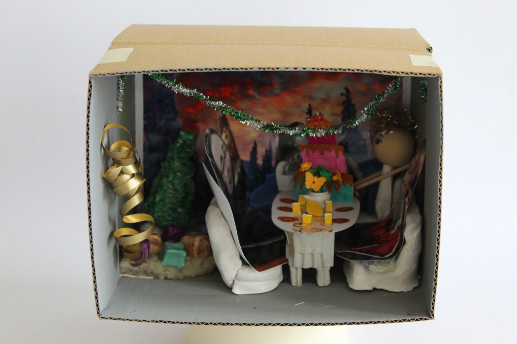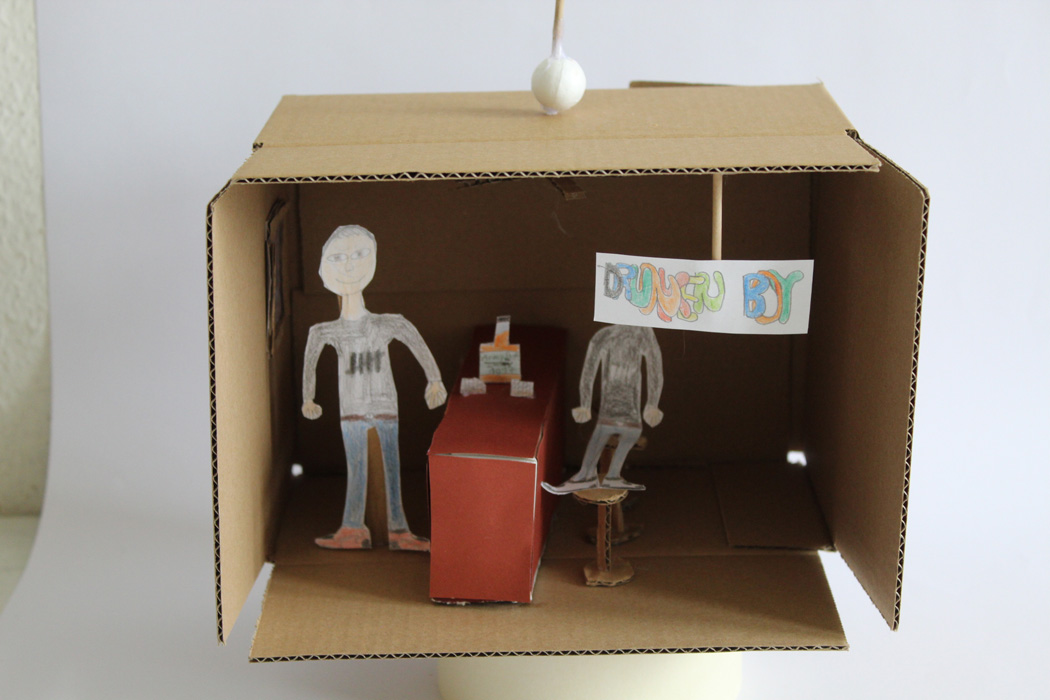 Die Klasse 8a hatte sich im Kunstunterricht zunächst mit unterschiedlichen Versionen des berühmten Bildmotives „Das Letzte Abendmahl“ beschäftigt, mit dem sich unterschiedliche Künstler/-innen immer wieder auseinandergesetzt haben - eines der bekanntesten Werke stammt von Leonardo da Vinci. Hierbei stellten die Schüler/-innen fest, dass unterschiedliche Anordnungen der Personen auch ganz unterschiedliche Bildwirkungen ergeben können. Ausgehend von da Vincis Werk erlernten die Schüler/-innen die Zentralperspektive und entwickelten davon ausgehend schließlich ihre ganz eigene Rauminszenierung – ein „Dinner in a box“.