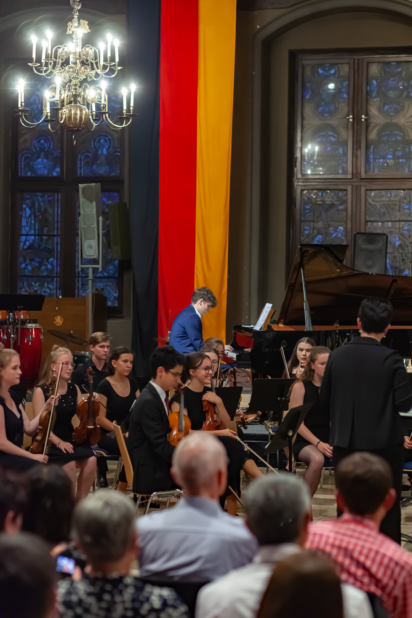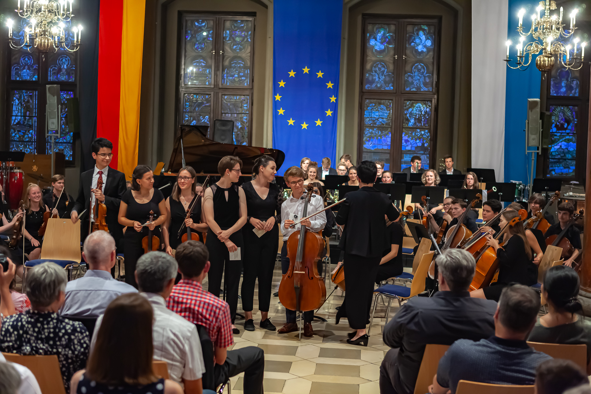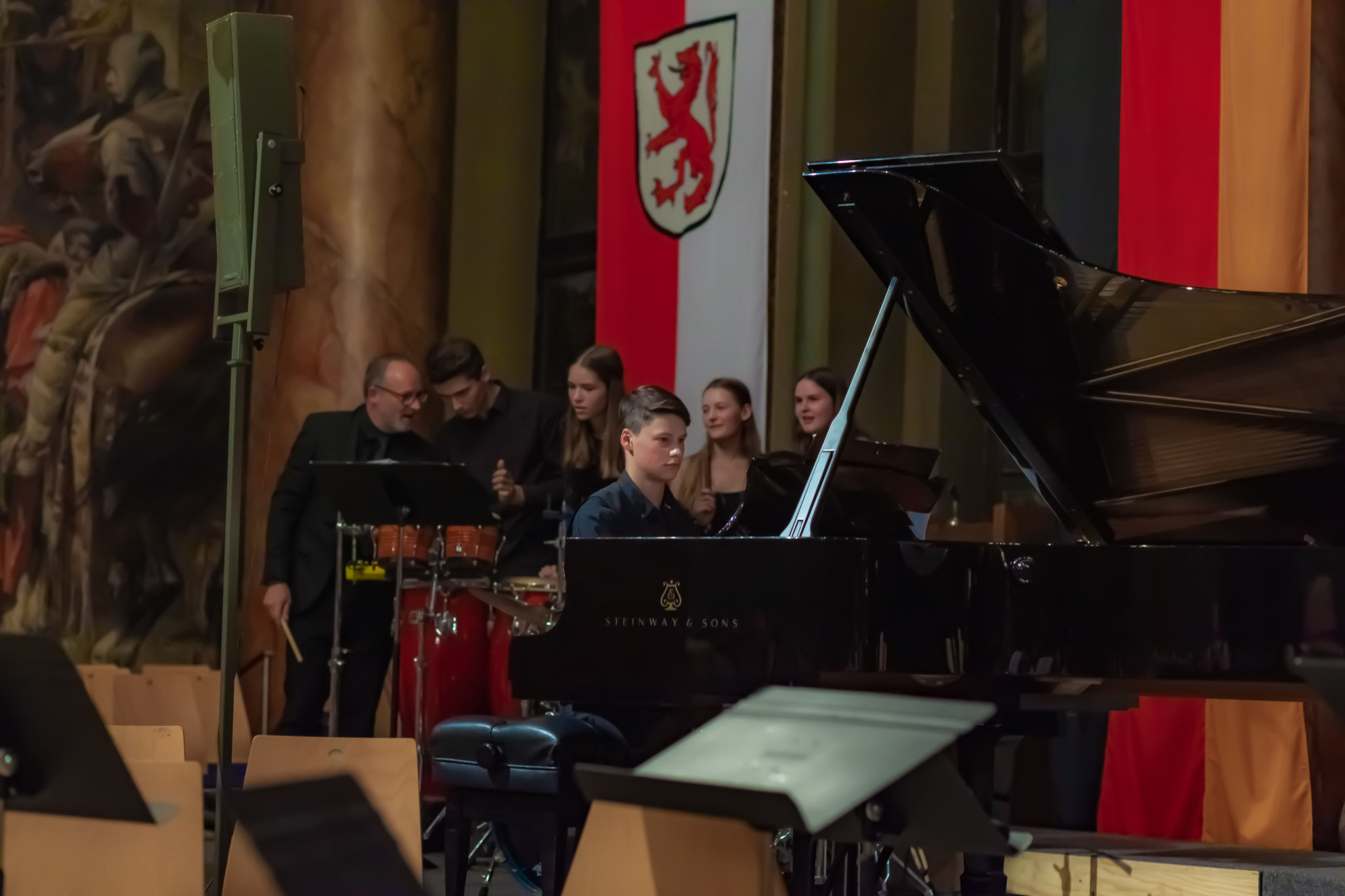 Korbinian Seibold und das klangstarke Oberstufenorchester unter der Leitung von Margit Weinberger, mit Jennifer Schäfer am Kontrabass, verzauberten die Besuchermit dem berührend vorgetragenen „Kol Nidrei op 47“ für Violoncello mit Orchester von Max Bruch. Das Stück basiere auf dem jüdischen Gebet „Kol Nidrei“, das am Vorabend des höchsten jüdischen Feiertags Jom Kippur gesprochen wird, erzählte Weinberger. Die eindringliche Melodie sei nach einer hebräischen Hymne komponiert worden. Die Zuhörer zeigten sich begeistert und spendeten stehende Ovationen. Auch Margit Weinberger war sichtlich ergriffen. Es sei ein großes Glücksgefühl, mit Schülern dies aufführen zu können. Mit virtuosem Solospiel faszinierte auch Simon Seidl am Klavier, der mit dem energiegeladenen Orchester die „Rhapsody in Blue“ von George Gershwin präsentierte. Für die erneut hohe Kunst gab es ebenfalls standing ovations.