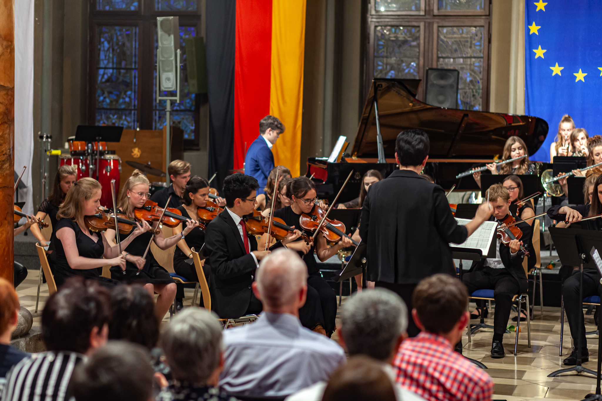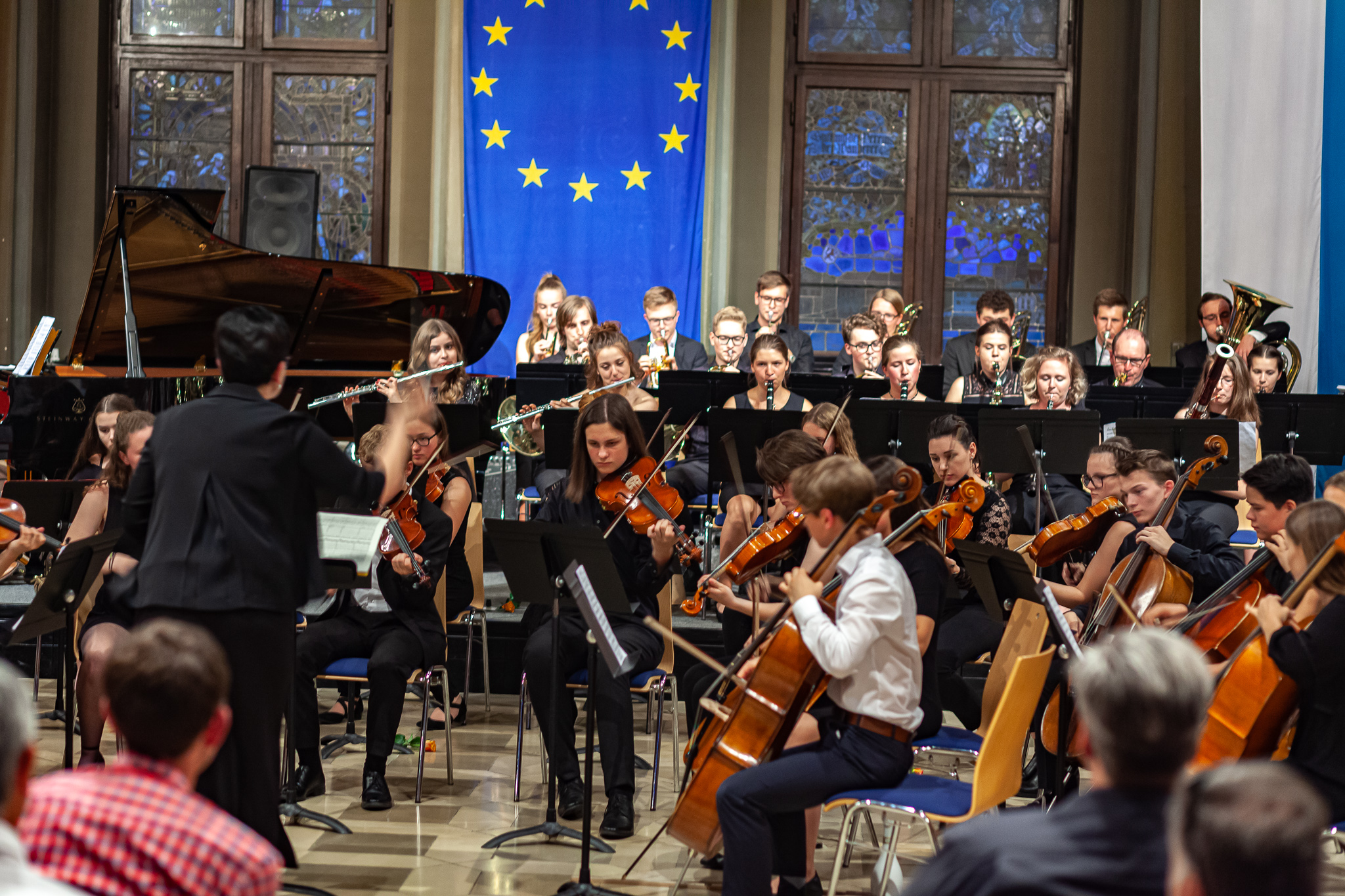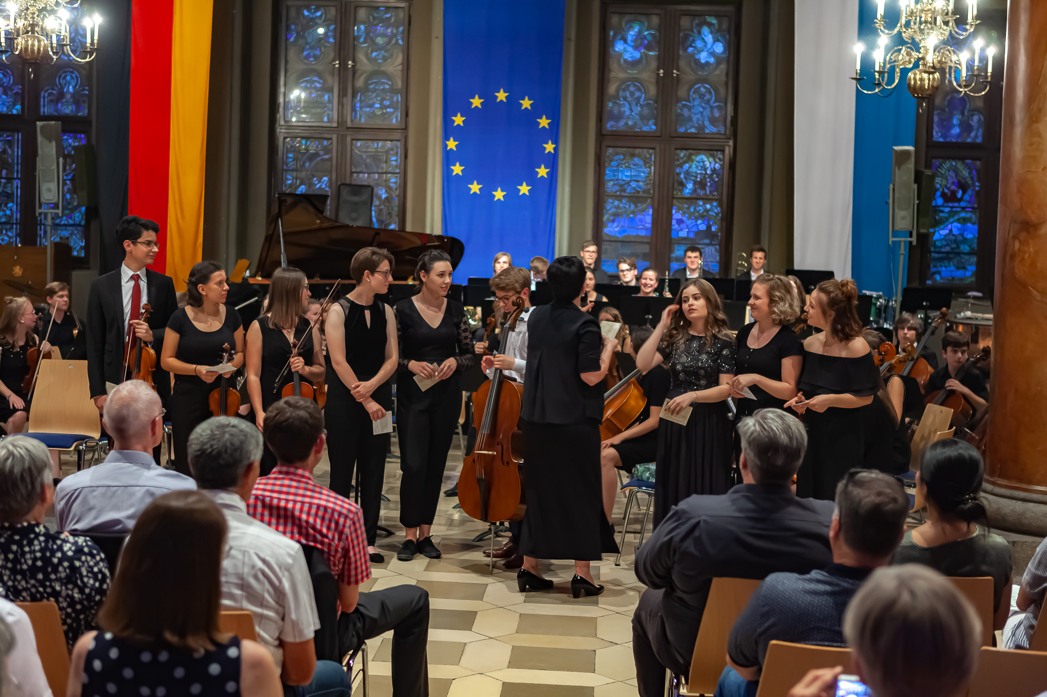 Korbinian Seibold und das klangstarke Oberstufenorchester unter der Leitung von Margit Weinberger, mit Jennifer Schäfer am Kontrabass, verzauberten die Besuchermit dem berührend vorgetragenen „Kol Nidrei op 47“ für Violoncello mit Orchester von Max Bruch. Das Stück basiere auf dem jüdischen Gebet „Kol Nidrei“, das am Vorabend des höchsten jüdischen Feiertags Jom Kippur gesprochen wird, erzählte Weinberger. Die eindringliche Melodie sei nach einer hebräischen Hymne komponiert worden. Die Zuhörer zeigten sich begeistert und spendeten stehende Ovationen. Auch Margit Weinberger war sichtlich ergriffen. Es sei ein großes Glücksgefühl, mit Schülern dies aufführen zu können. Mit virtuosem Solospiel faszinierte auch Simon Seidl am Klavier, der mit dem energiegeladenen Orchester die „Rhapsody in Blue“ von George Gershwin präsentierte. Für die erneut hohe Kunst gab es ebenfalls standing ovations.