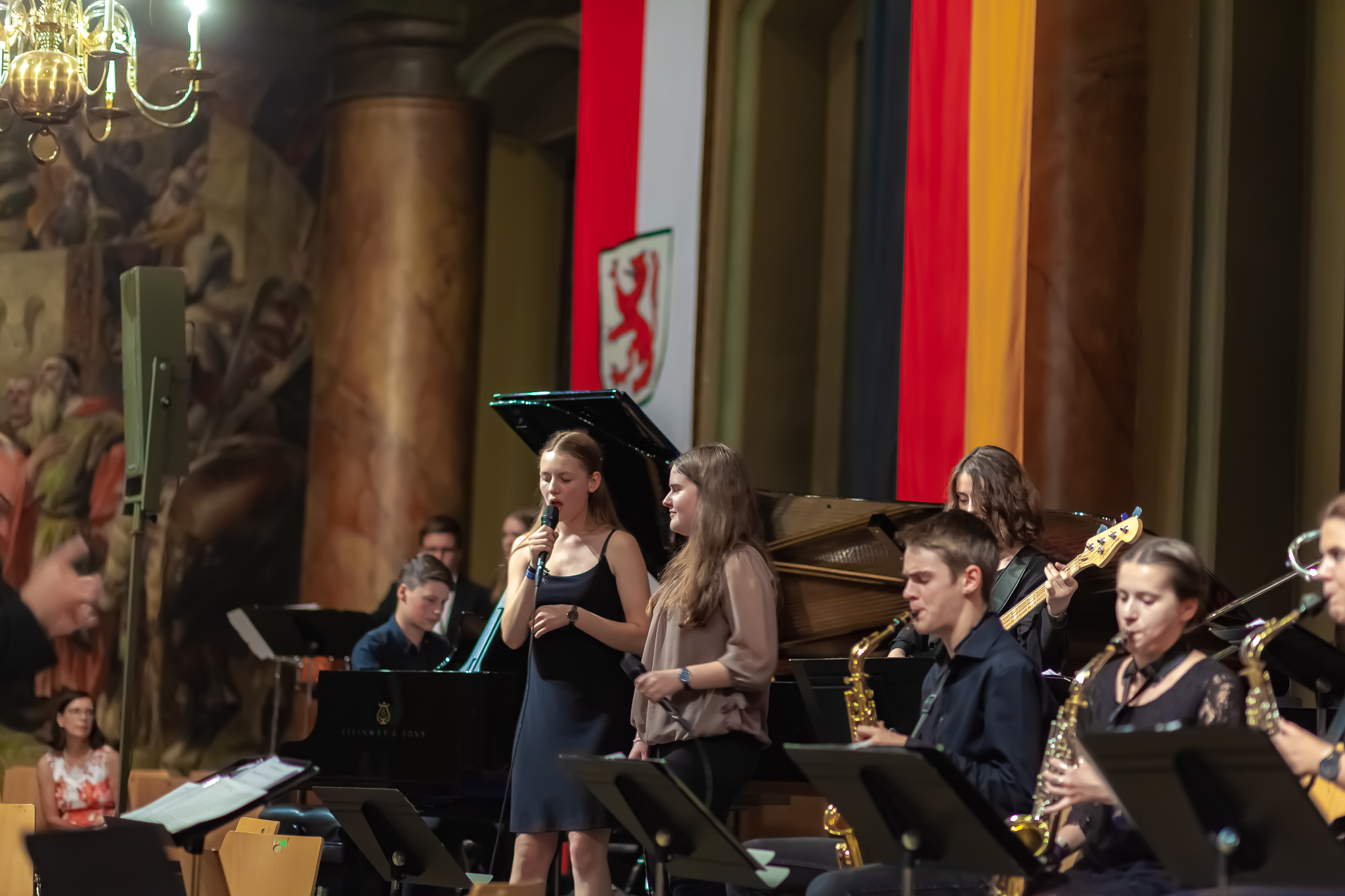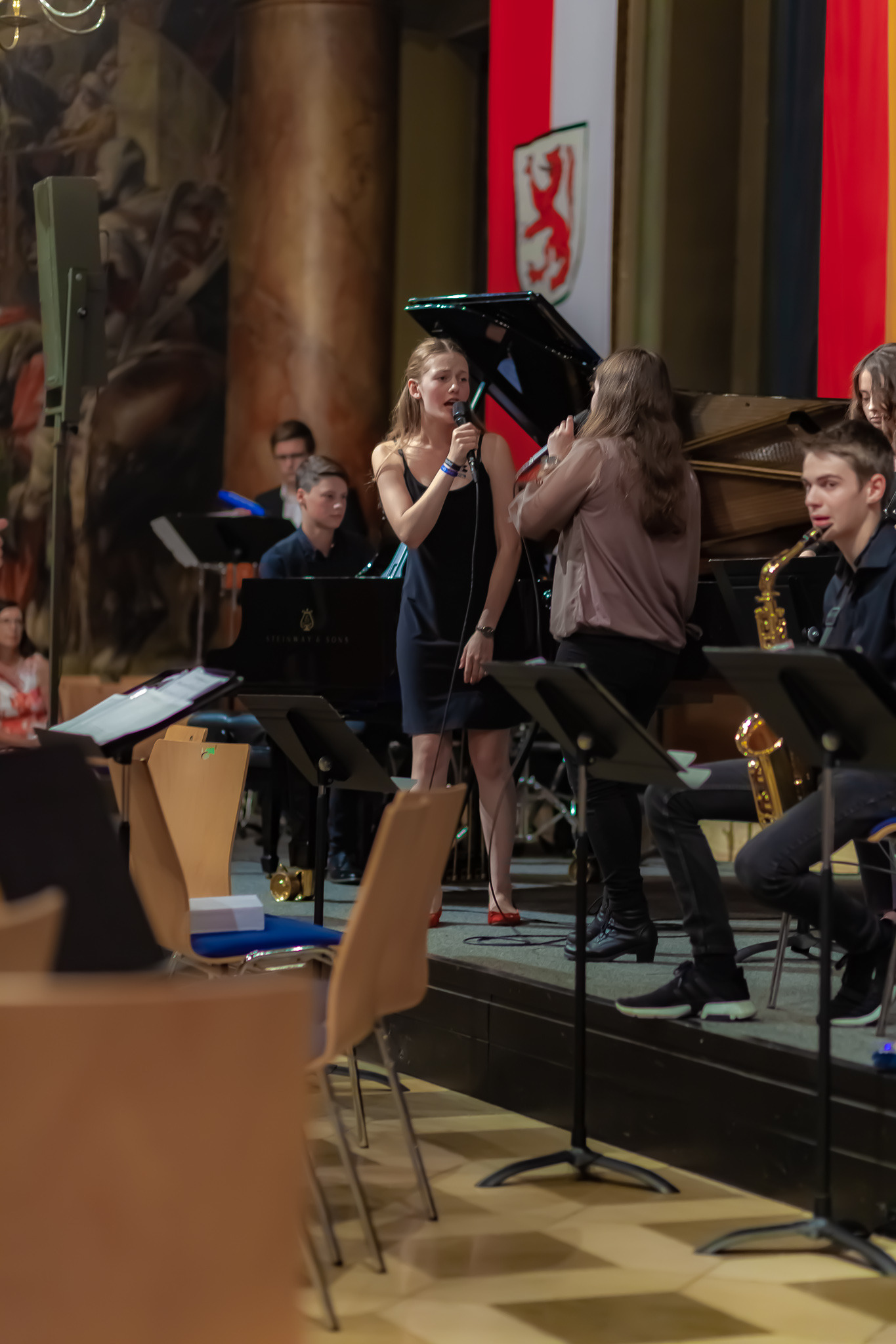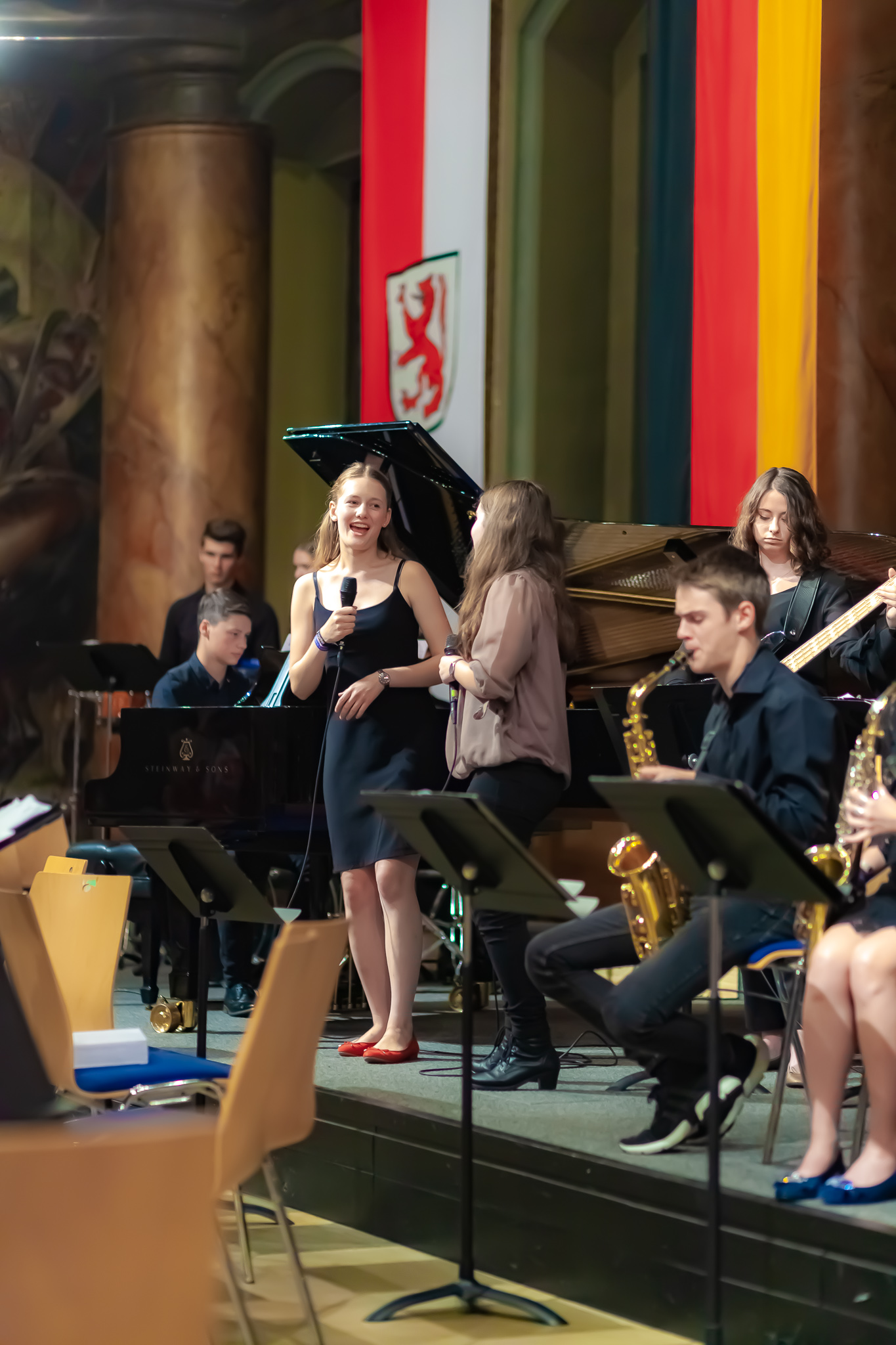 Der Chor der fünften und sechsten Klassen unter der Regie von Christoph Rose erfreute mit einem traditionellen bayerischen Lied und regte mit dem „Earth Song“ von Michael Jackson zum Nachdenken an. Maximilian Weiß beeindruckte mit einem Basssolo von Johann Sebastian Bach und der Mittelstufenchor unter der Leitung von Claudia Seibold brachte zeitgenössische Titel und „On the sunny side of the street“ zu Gehör. Das Querflötenensemble unter der Regie von Elisabeth Thoma ließ südländische Rhythmen von Astor Piazzolla erklingen und die Jazz-Combo 12 lud mit Duke Ellington zum Swingen ein. Die Bigband unter der Leitung von Christoph Rose brachte die Besuchermit den herrlichen Solostimmen von Alina Striedl und Antonia Lerchl zum Jubeln und die Rathauswände zum Zittern. Auch sie erntete nach der Zugabe „Birdland“ als „Rausschmeißer“ stehende Ovationen.