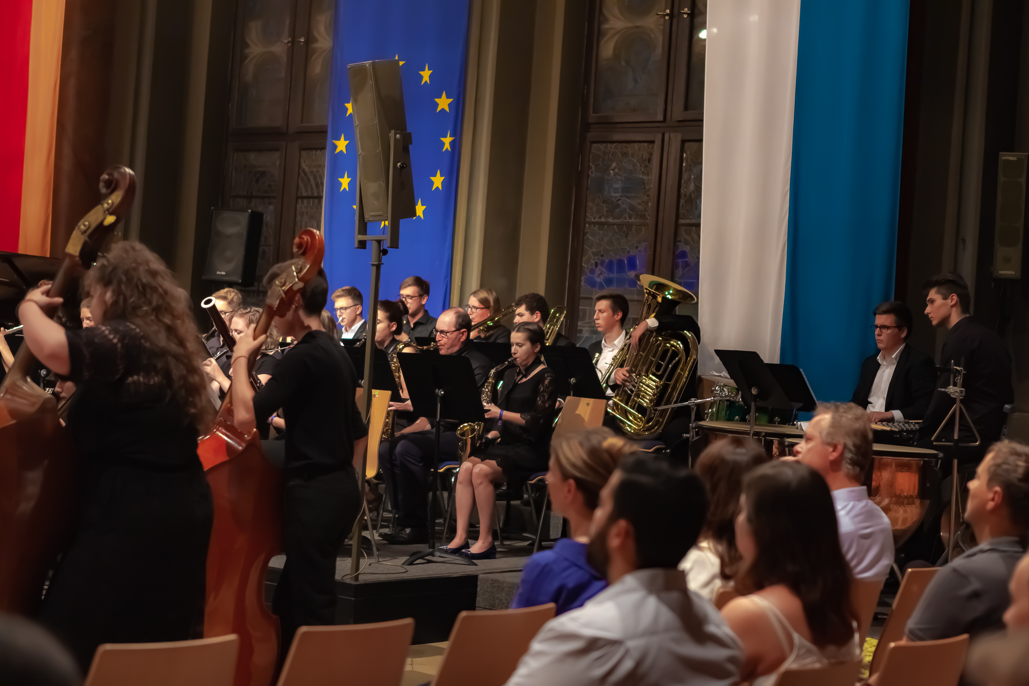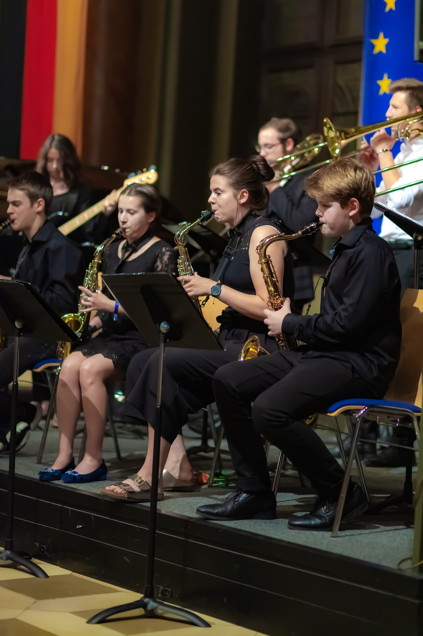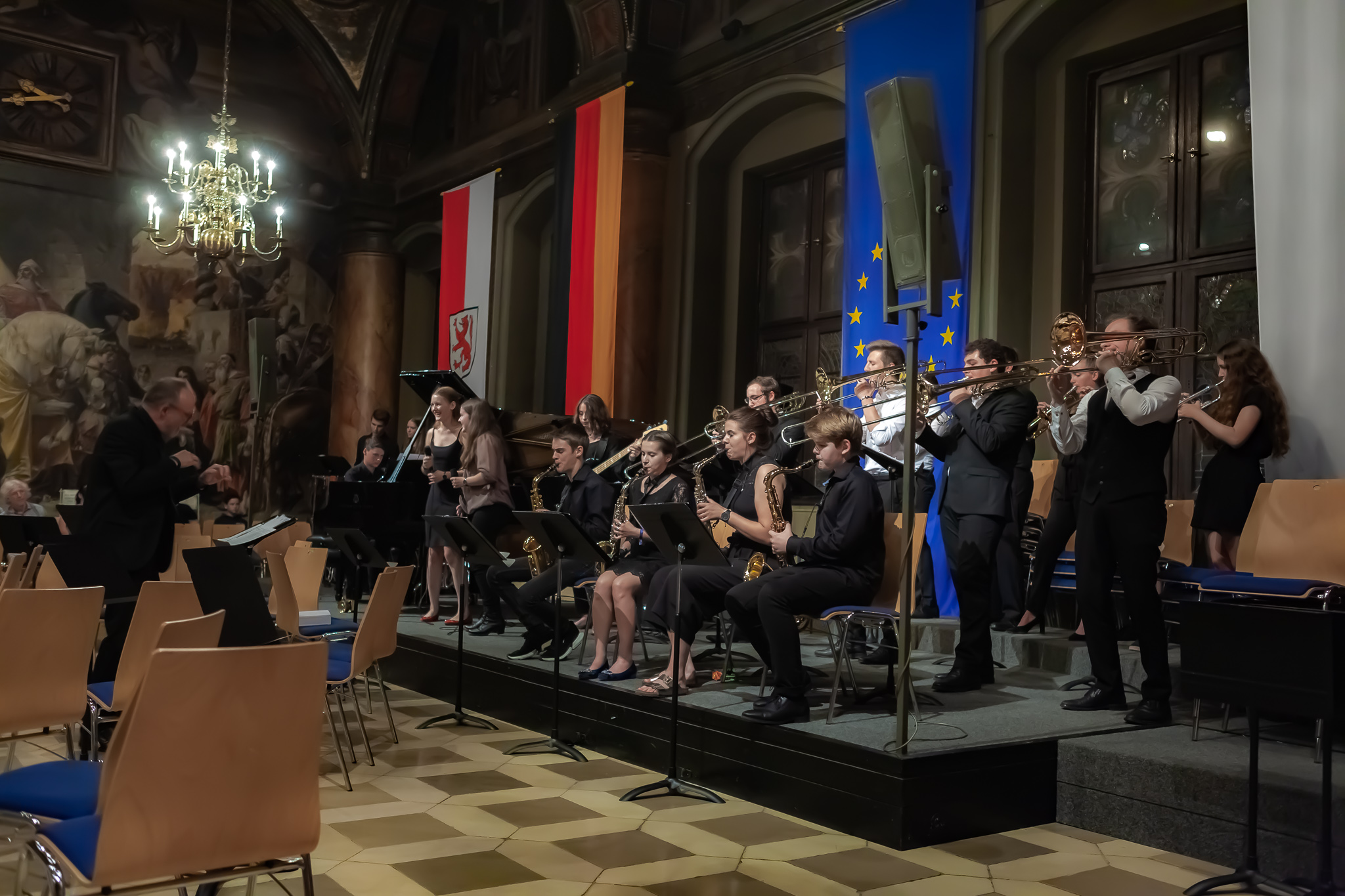 Der Chor der fünften und sechsten Klassen unter der Regie von Christoph Rose erfreute mit einem traditionellen bayerischen Lied und regte mit dem „Earth Song“ von Michael Jackson zum Nachdenken an. Maximilian Weiß beeindruckte mit einem Basssolo von Johann Sebastian Bach und der Mittelstufenchor unter der Leitung von Claudia Seibold brachte zeitgenössische Titel und „On the sunny side of the street“ zu Gehör. Das Querflötenensemble unter der Regie von Elisabeth Thoma ließ südländische Rhythmen von Astor Piazzolla erklingen und die Jazz-Combo 12 lud mit Duke Ellington zum Swingen ein. Die Bigband unter der Leitung von Christoph Rose brachte die Besuchermit den herrlichen Solostimmen von Alina Striedl und Antonia Lerchl zum Jubeln und die Rathauswände zum Zittern. Auch sie erntete nach der Zugabe „Birdland“ als „Rausschmeißer“ stehende Ovationen.