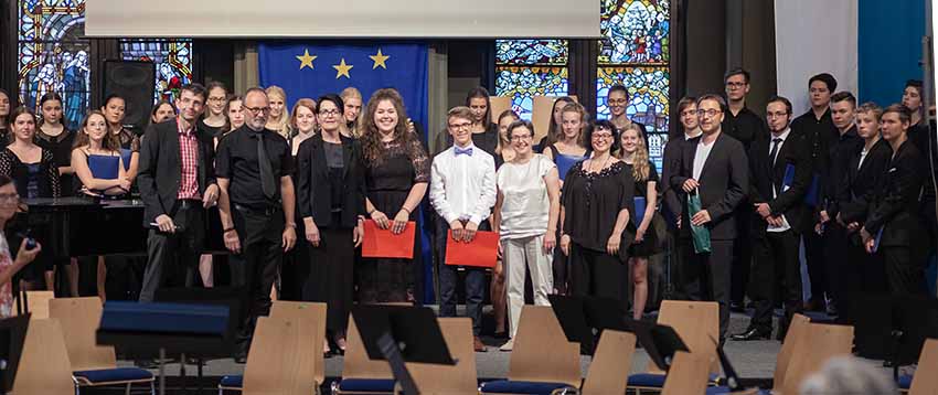 Zwei herausragende junge Interpreten nahmen eine besondere Ehrung entgegen. Schulleiter Christian Zitzl verlieh an Jennifer Schäfer und Korbinian Seibold den Musikpreis 2019 der Schule. Ein Gymnasium definiere sich über das Abitur, sagte der Schulchef bei der Preisverleihung. Ein musisches Gymnasium definiere sich aber auch über musische Leistungen. Er sei stolz darauf, Jennifer Schäfer und Korbinian Seibold mit dem Musikpreis auszuzeichnen. Dank ging auch an die Lehrer: Vor dem faszinierenden Bild des riesigen Oberstufenchors holte er Brigitte Glas, Margit Weinberger, Claudia Seibold, Elmar Slama, Christoph Rose und Kurt Brunner nach vorne und hob auch Elisabeth Thoma, Miyase Kaptan und Elisabeth Immelmann sowie den früheren Musiklehrer Matthias Seibold hervor, der die Preisträger ebenfalls unterrichtet hatte.