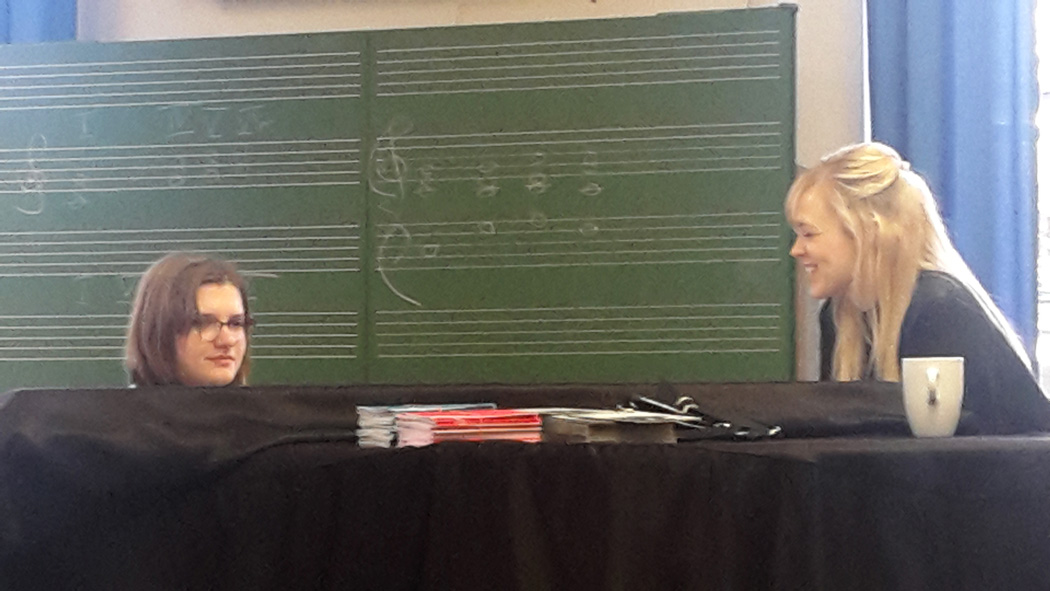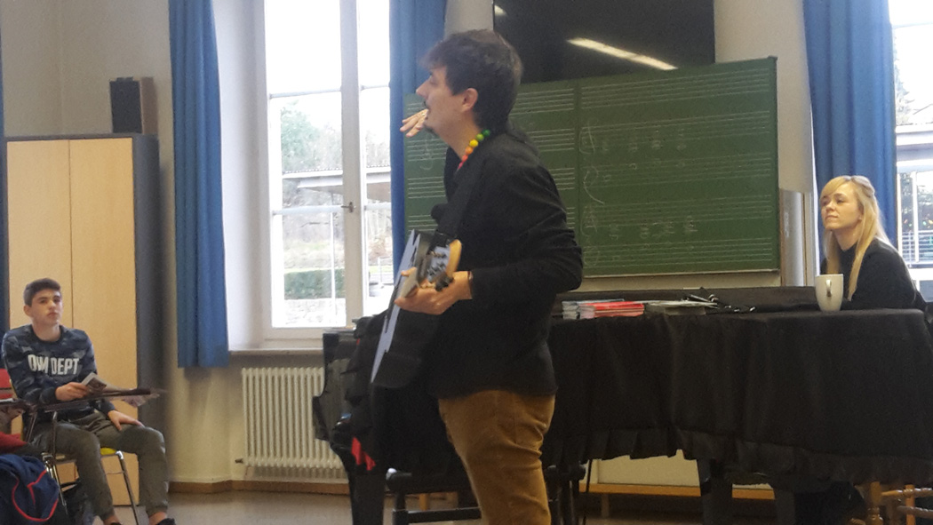 Der Song „Hände“, sehr musikalisch und stimmlich nuanciert vorgetragen von Carolin, eröffnete den Schülern die Welt der Songs, die, wie die Künstler erklärten, die Menschen ansprechen und berühren und alle Aspekte des Lebens umgreifen sollen: