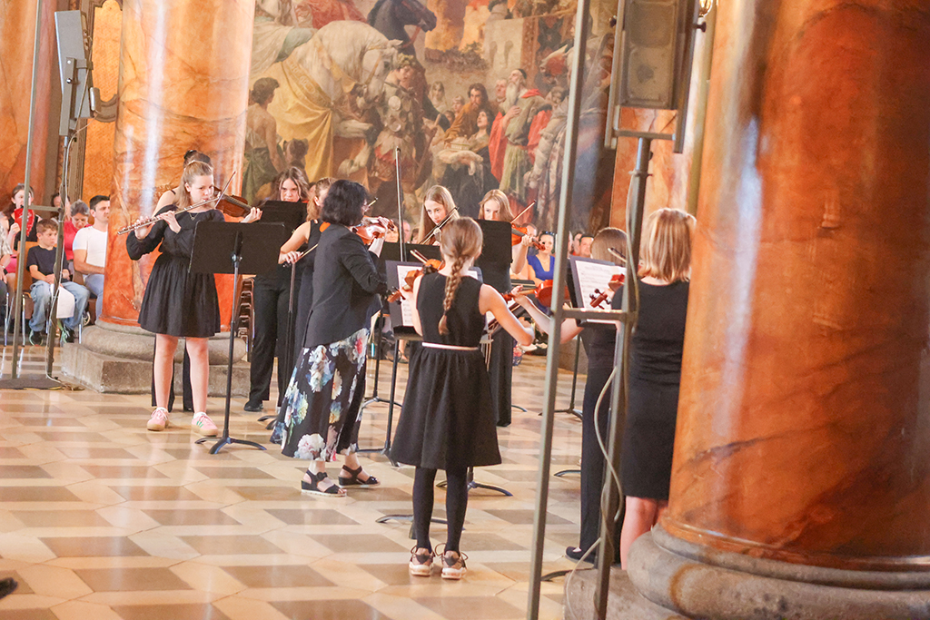 Im dichtgefüllten Rathaussaal bei geradezu tropischer Hitze zeigten alle Ensembles des Auersperg-Gymnasiums ihr Können. Eingeleitet wurden beide Abende durch das Unter- und Mittelstufenorchester, das dieses Jahr mit vielen engagierten jungen Musikern von der 5.-8. Klasse ein erfrischendes Repertoire spielte, geleitet von Brigitte Glas. Das Medley „Phantom der Oper“, ebenso „Shake it off“ von T. Swift erklangen zupackend und ausdrucksvoll am ersten Abend, am zweiten überzeugte die Gruppe vor allem mit einem intonationssicheren, energischen Antonio Vivaldi und C. Caballos „Havana“, nun unterstützt von einer Schülertanzgruppe, die sich sehr bewegungssicher und homogen mit einer schönen Choreografie in die Herzen der Zuhörer tanzte.