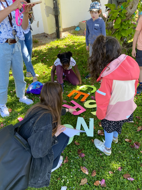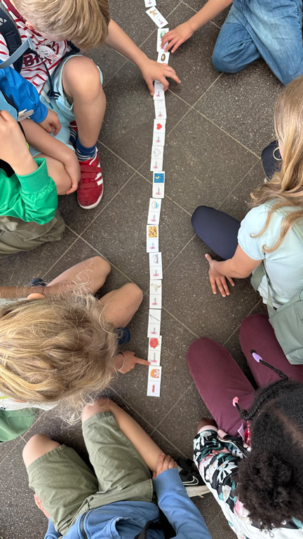 Zuallererst wurde die Geschichte vom Schlossgespenst Kasper vorgelesen, welche den Einstieg in die Idee der Buchstabenrallye darstellte. Danach teilten die Seminarler die Kinder in zwei Gruppen auf. Jede Gruppe wurde von zwei Schülern des P- Seminars geführt und an die einzelnen Stationen geleitet. Das Ziel an den Stationen lag darin, dass die Erstklässler bei jeder Station, an der sie ihre Leseaufgabe erfolgreich lösen konnten, einen Buchstaben erhielten. Diese angesammelten Buchstaben ergaben zum Schluss das Lösungswort, welches einen bestimmten Ort in Freudenhain verriet. An dieser Stelle, das erfuhren die Sechsjährigen, hatte das Schlossgespenst seine Schatzkiste mit wichtigen Utensilien verlegt. An der ersten Station der Buchstabenrallye war es Aufgabe der Erstklässler, versteckte Dominosteine zu finden und dann zu erkennen, welcher Buchstabe in den abgedruckten Begriffen am häufigsten vorkam. Auch das Zusammensetzen von Wörtern eines Buchstabensalates erforderte einiges an Grips, den die Kleinen gewitzt und voller Elan einsetzten. Dass es gar nicht so einfach ist, ganz viele Nomen mit einem vorgegebenen Anfangsbuchstaben zu nennen, wenn die Zeit gegen einen läuft, war ebenfalls herausfordernd. Und das Lesen von schwierigen, langen Wörtern mit dem Anfangsbuchstaben R sollte auch noch bewältigt werden. Nach einer knappen Stunde waren die vier Stationen auch schon absolviert und die Gruppen trafen im Schulgarten wieder zusammen. Um den allerletzten Buchstaben zu erzielen, durften die Kinder mit den Schülern und Schülerinnen des P-Seminars ,,Weißer Hai“ spielen. Nach dieser sportlichen Anstrengung war es dann endlich soweit, alle Buchstaben waren ergattert und mussten nur noch zum Lösungswort verknüpft werden. Mit ein wenig Unterstützung der Elftklässler wurde das Ziel der Rallye erreicht. ,,Rosengarten“ lautete das Lösungswort und dorthin ging es auch sofort, um die Schatztruhe des Schlossgespenstes zu finden. Nachdem die Schatzkiste hinter Büschen versteckt entdeckt wurde, machten sich die Kleinen über den Inhalt her. Was genau in der Truhe versteckt war, wird ewig ein Geheimnis bleiben…
