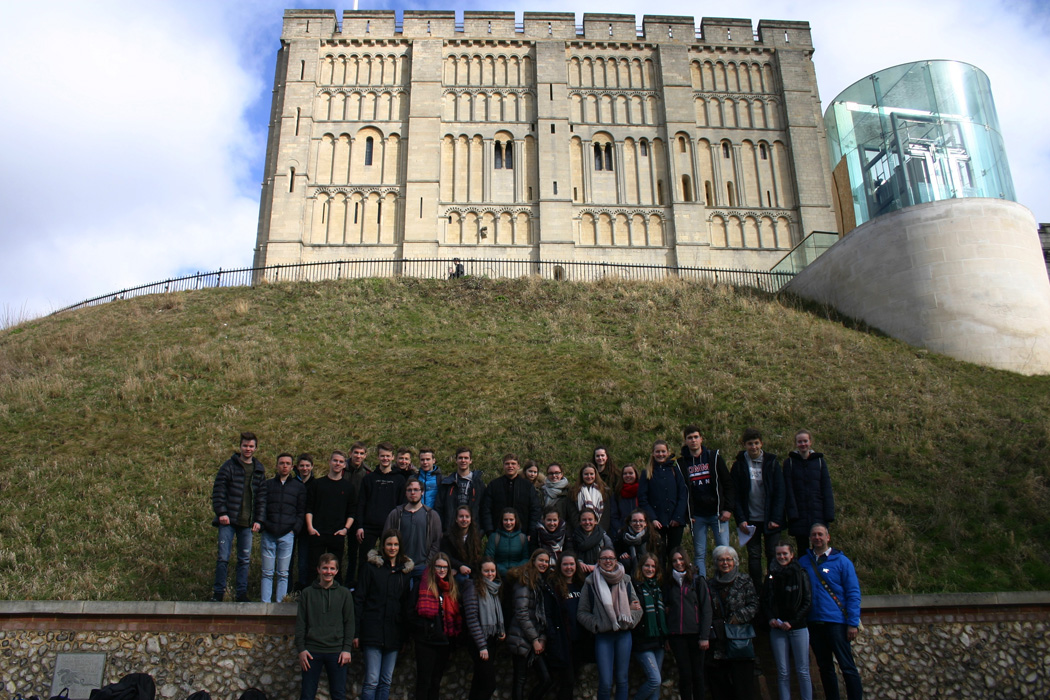 Untergebracht bei Gastfamilien in Saffron Waldon fuhren die Schüler/innen dann zu ihrem ersten Ausflug nach Norwich in Norfolk, East Anglia. Hier besuchte man das Castle Museum auf den Spuren der Normannen. In einer anschließenden Stadtführung (Herr Schöttner studierte hier ein Jahr an der University of East Anglia) besichtigte man die Norman Cathedral und u.a. Elm Hill, eine Straße aus elisabethanischer Zeit. Besonders Interessierte wandelte im Anschluss durch einen Antikflohmarkt in einer von Heinrich dem VIII. säkularisierten Kirche.