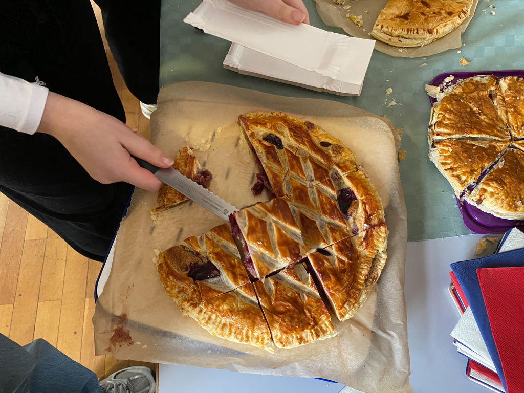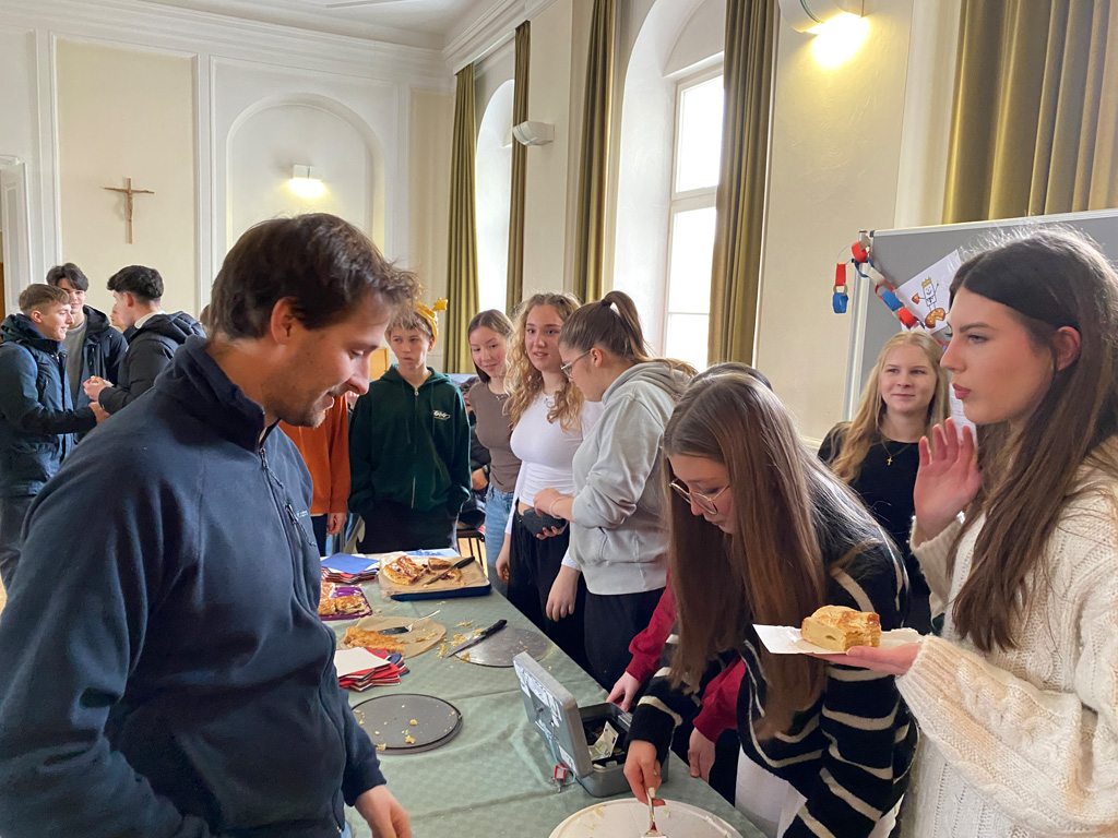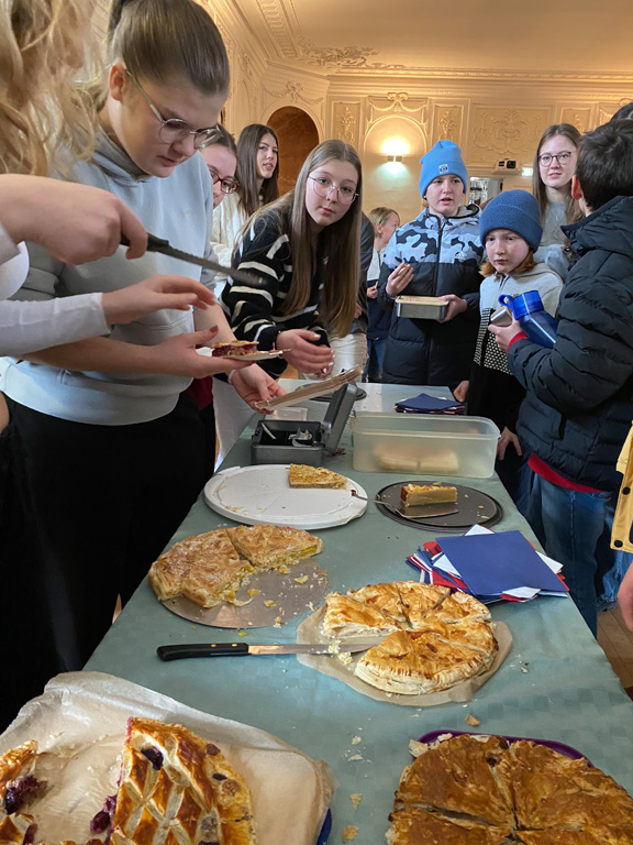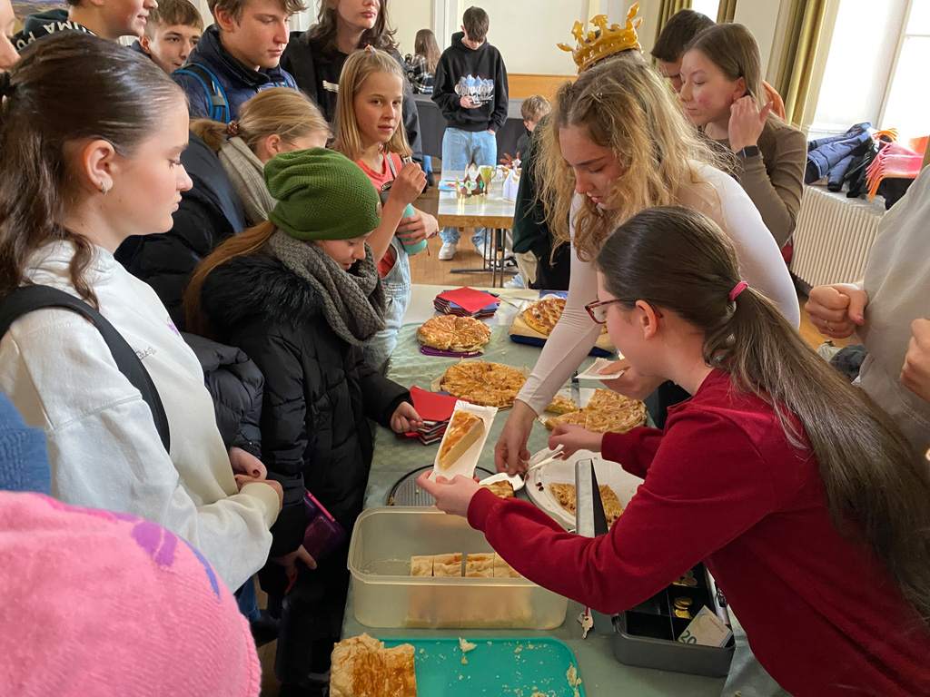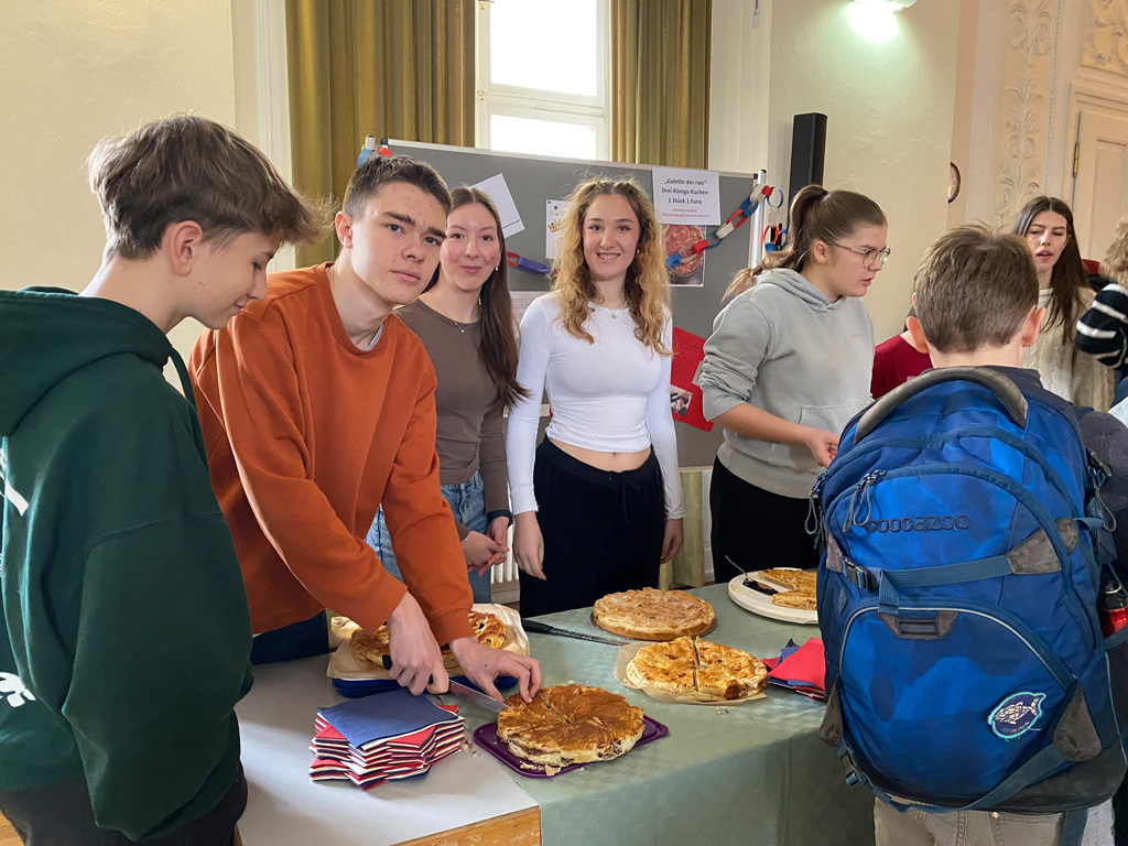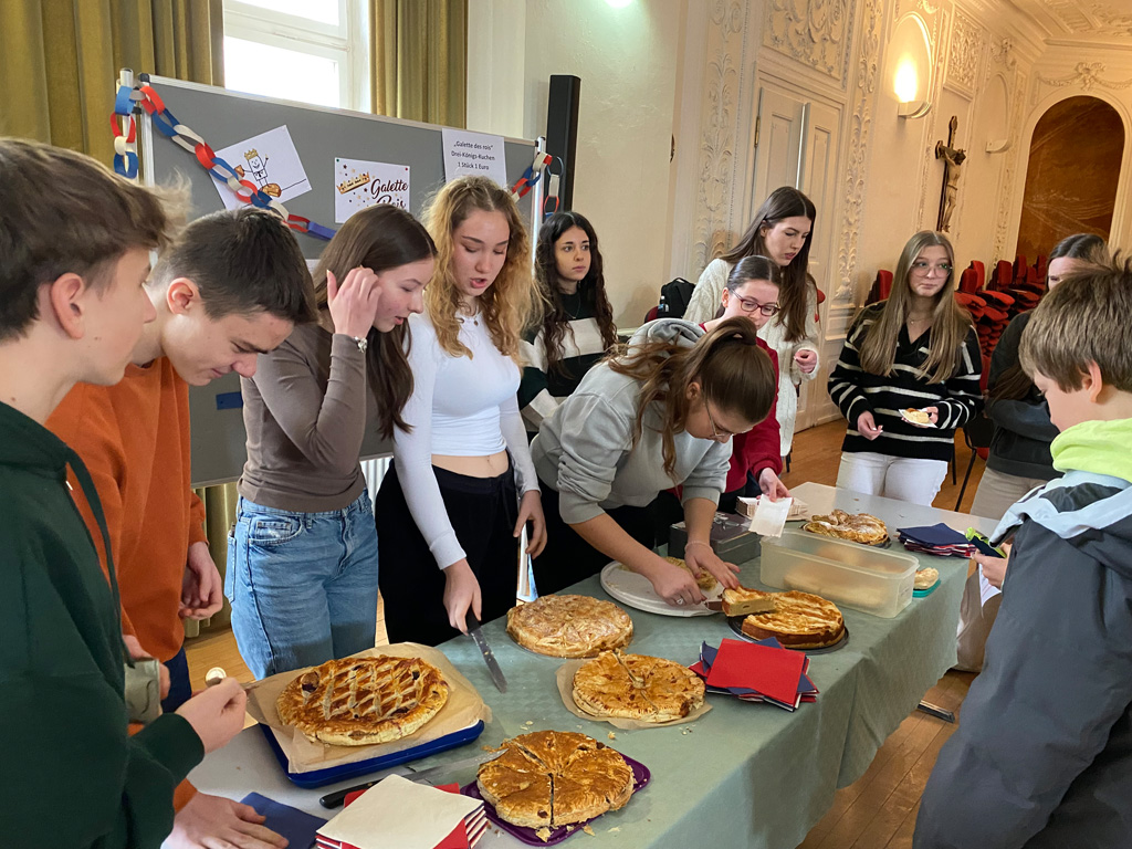 Viel zu tun hatten die Schüler/-innen der Französischklasse 10 bc von Marie-Luise Täuber am 22. Januar, dem deutsch-französischen Tag, um dem Ansturm auf ihre selbstgebackenen „Galette des rois“ Herr zu werden. Die Spendenaktion, verbunden mit einem Gewinnspiel, hat bereits Tradition am Auersperg-Gymnasium und viele hatten sich schon darauf gefreut. Sie wussten genau, worauf es bei diesem schönen französischen Brauch ankommt, nämlich möglichst schnell an ein Stück der leckeren Kuchen zu kommen und nach der darin versteckten Nuss oder Mandel zu suchen.