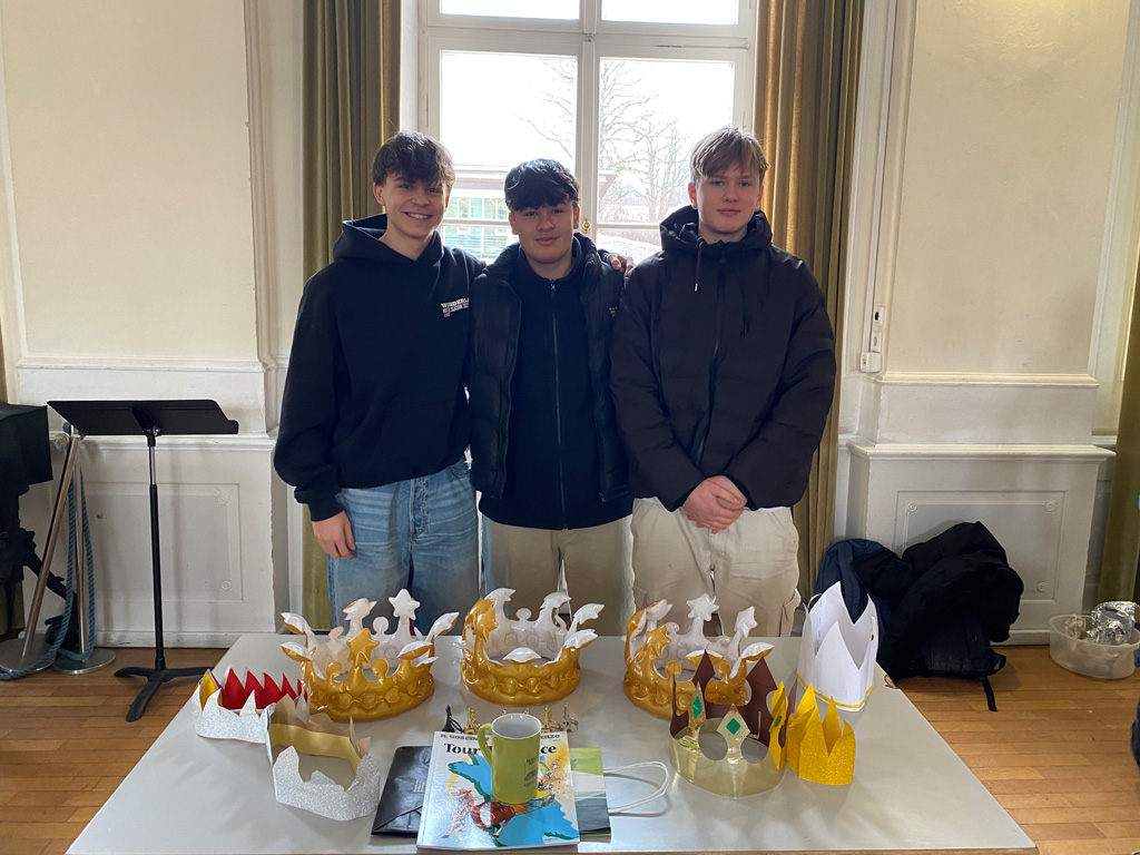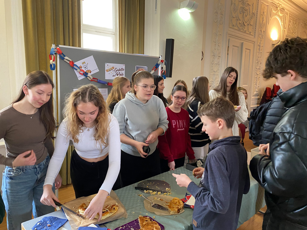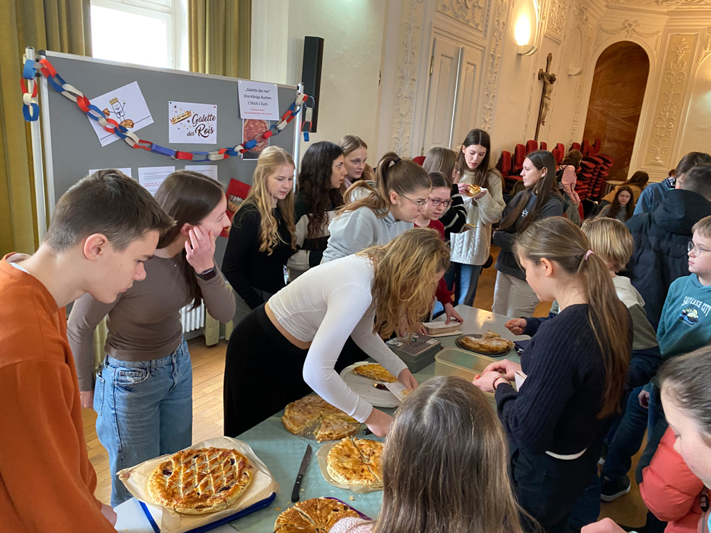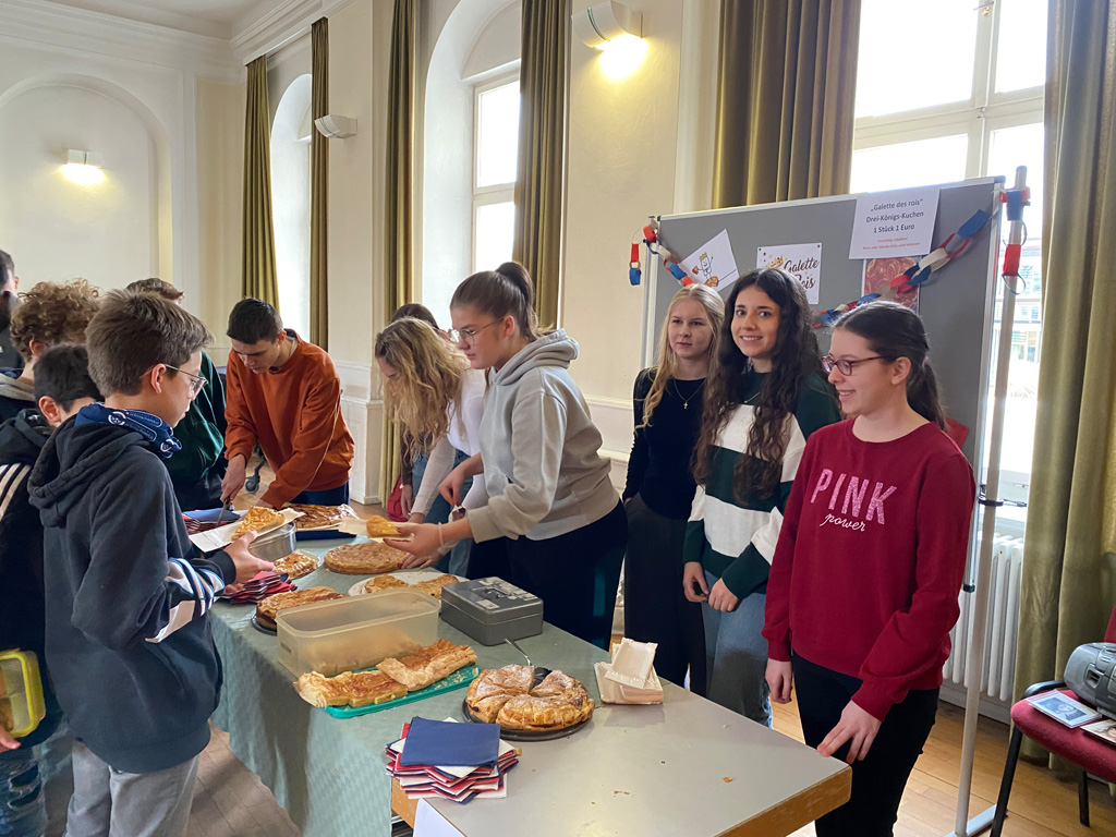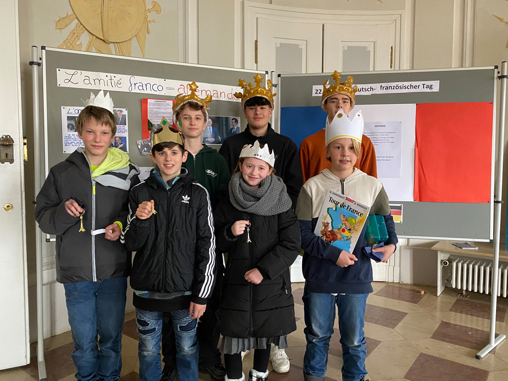 War man unter den Glücklichen, so durfte man sich sofort seine Krone abholen und war die Königin bzw. der König des Tages. Am Ende der Pause wurden unter ihnen kleine Preise ausgelost, darunter ein Asterix-Comic als Hauptgewinn und kleine Eiffeltürme für alle anderen. Über die historische Bedeutung des Tages informierten Stellwände im Foyer und eine Durchsage, gestaltet von zwei Schülerinnen, am Morgen des Tages. Zum 61. Mal jährte sich die Unterzeichnung des Elysée-Vertrages durch De Gaulle und Adenauer, der nach den drei großen Kriegen der Vergangenheit Deutschland und Frankreich in vielen politischen und gesellschaftlichen Bereichen wieder einander näherbrachte.