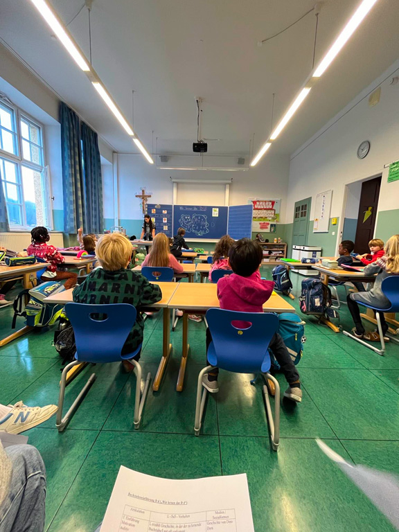 Ende November 2023 besuchte das P-Seminar Leseförderung des Auersperg-Gymnasiums Freudenhain auf Einladung der Schulleiterin Andrea Silberhorn von der Mittelschule St. Nikola die erste Klasse der Altstadtschule. Die 11 Schüler*innen durften sich eine Deutschstunde anschauen, bei der die Klassenleiterin Angelika Wildenauer den Erstklässlern den Buchstaben “D” vorstellte. Nach einer kurzen Begrüßung konnten die Seminarteilnehmer*innen zuerst den Unterricht verfolgen, dann im Lauf der Stunde aber auch selbst den Kindern helfen und mit ihnen Aufgaben bearbeiten. Im Anschluss bedankten sich die Schüler*innen mit selbstgemachten Muffins bei der ersten Klasse und es fand eine Gesprächsrunde mit Frau Wildenauer und der Schulleiterin, Frau Silberhorn, statt.