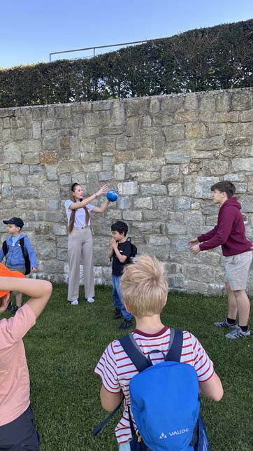 Zuallererst wurde die Geschichte vom Schlossgespenst Kasper vorgelesen, welche den Einstieg in die Idee der Buchstabenrallye darstellte. Danach teilten die Seminarler die Kinder in zwei Gruppen auf. Jede Gruppe wurde von zwei Schülern des P- Seminars geführt und an die einzelnen Stationen geleitet. Das Ziel an den Stationen lag darin, dass die Erstklässler bei jeder Station, an der sie ihre Leseaufgabe erfolgreich lösen konnten, einen Buchstaben erhielten. Diese angesammelten Buchstaben ergaben zum Schluss das Lösungswort, welches einen bestimmten Ort in Freudenhain verriet. An dieser Stelle, das erfuhren die Sechsjährigen, hatte das Schlossgespenst seine Schatzkiste mit wichtigen Utensilien verlegt. An der ersten Station der Buchstabenrallye war es Aufgabe der Erstklässler, versteckte Dominosteine zu finden und dann zu erkennen, welcher Buchstabe in den abgedruckten Begriffen am häufigsten vorkam. Auch das Zusammensetzen von Wörtern eines Buchstabensalates erforderte einiges an Grips, den die Kleinen gewitzt und voller Elan einsetzten. Dass es gar nicht so einfach ist, ganz viele Nomen mit einem vorgegebenen Anfangsbuchstaben zu nennen, wenn die Zeit gegen einen läuft, war ebenfalls herausfordernd. Und das Lesen von schwierigen, langen Wörtern mit dem Anfangsbuchstaben R sollte auch noch bewältigt werden. Nach einer knappen Stunde waren die vier Stationen auch schon absolviert und die Gruppen trafen im Schulgarten wieder zusammen. Um den allerletzten Buchstaben zu erzielen, durften die Kinder mit den Schülern und Schülerinnen des P-Seminars ,,Weißer Hai“ spielen. Nach dieser sportlichen Anstrengung war es dann endlich soweit, alle Buchstaben waren ergattert und mussten nur noch zum Lösungswort verknüpft werden. Mit ein wenig Unterstützung der Elftklässler wurde das Ziel der Rallye erreicht. ,,Rosengarten“ lautete das Lösungswort und dorthin ging es auch sofort, um die Schatztruhe des Schlossgespenstes zu finden. Nachdem die Schatzkiste hinter Büschen versteckt entdeckt wurde, machten sich die Kleinen über den Inhalt her. Was genau in der Truhe versteckt war, wird ewig ein Geheimnis bleiben…