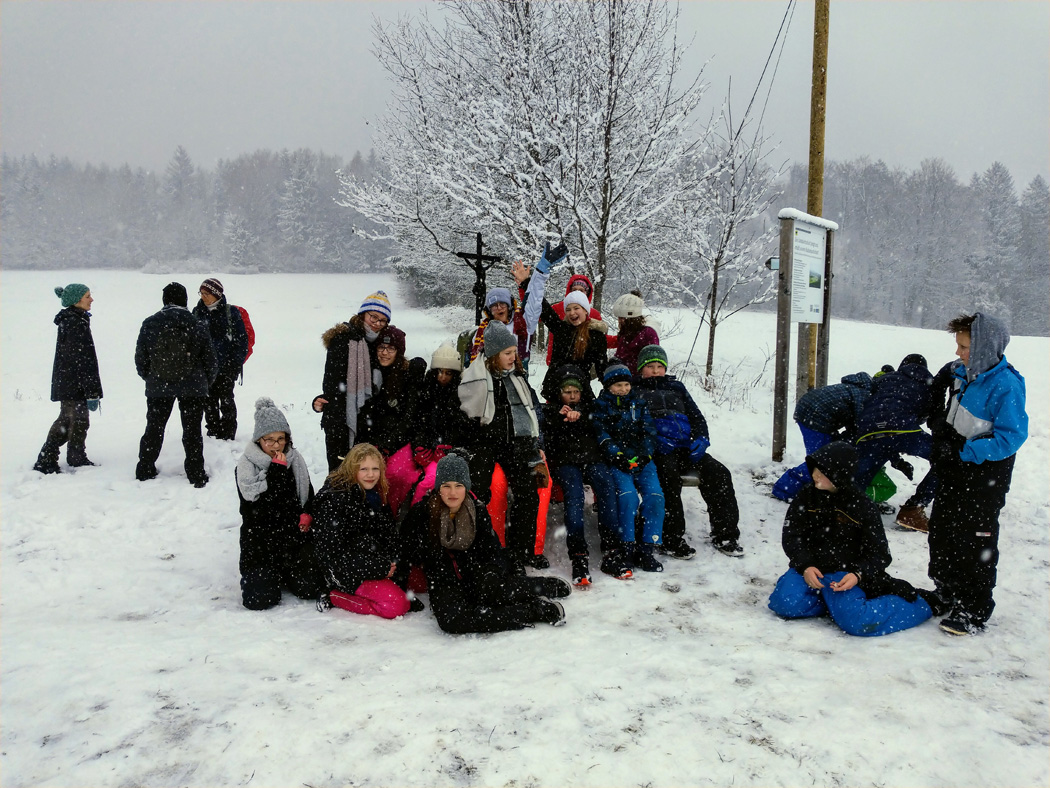 On Wednesday morning we were hiking to a church in the forest named “Ameiskappelle“ while it was snowing. After that we learned something about bionics. That’s a combination of biology and technology. That was very interesting.