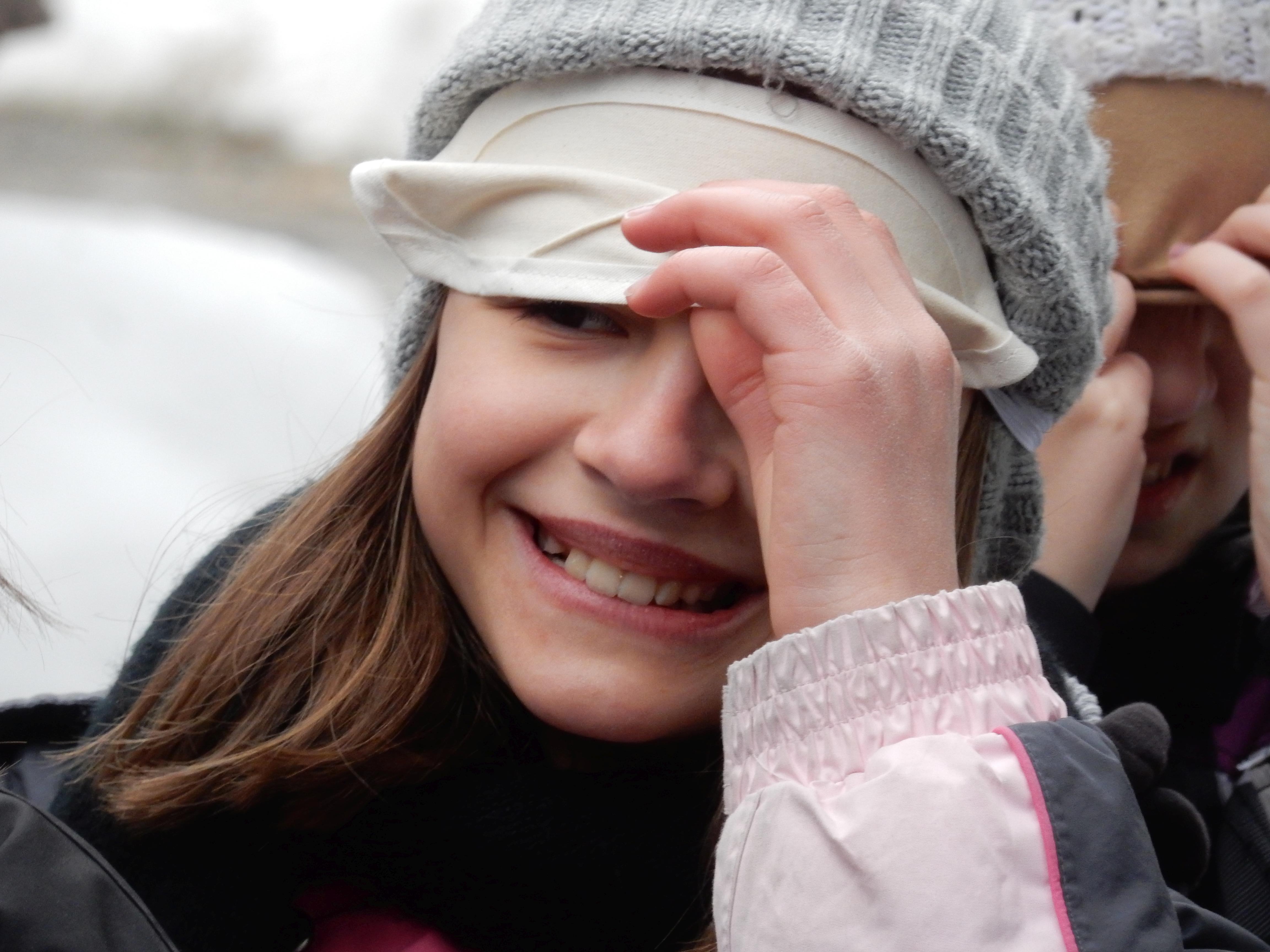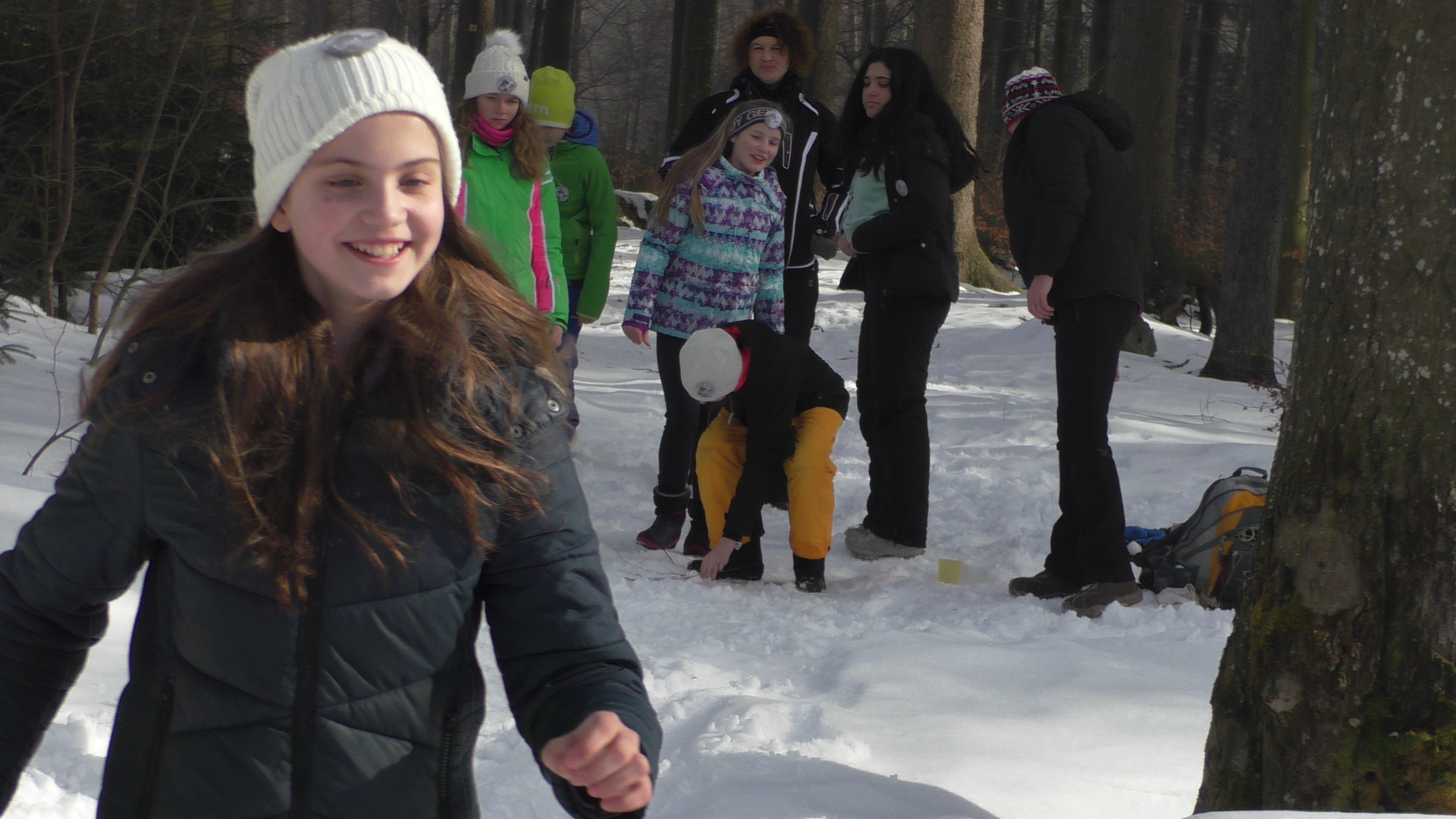 Heute war unser Tag in zwei Abschnitte geteilt. Am Vormittag erlebten wir spannende Spiele im Wald, zum Beispiel ein Versteckspiel, wobei wir unsere Sinne testeten, während der andere Teil der Klasse sich mit Schneeschuhwandern beschäftigte. Am besten war das Spiel mit dem reißenden Fluss. Man musste mit grünen Filzflecken über einen reißenden Fluss kommen. Dabei durften wir die Filzflecken nicht loslassen, sonst verschwindet der Filzflecken im reißenden Fluss.
