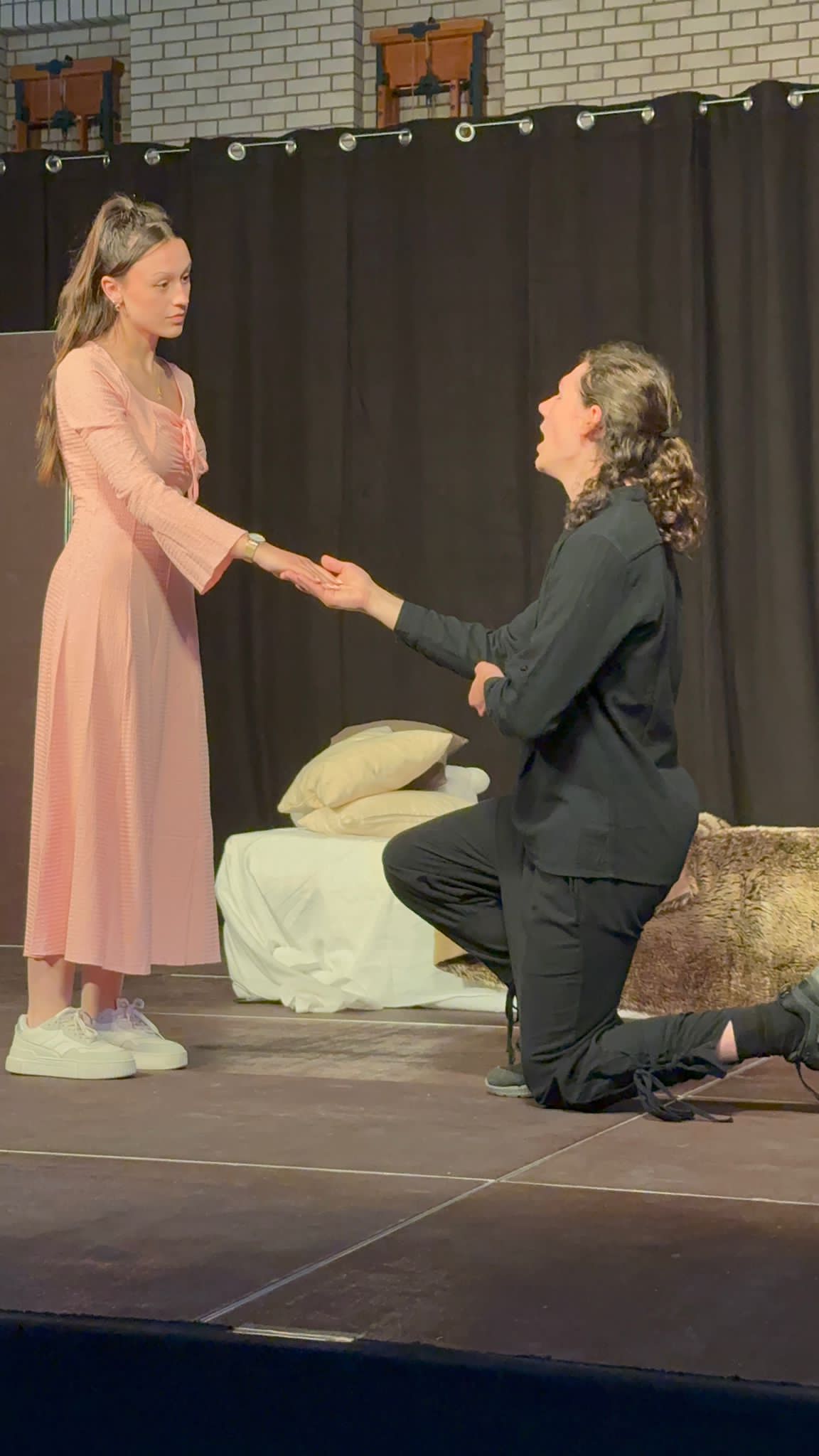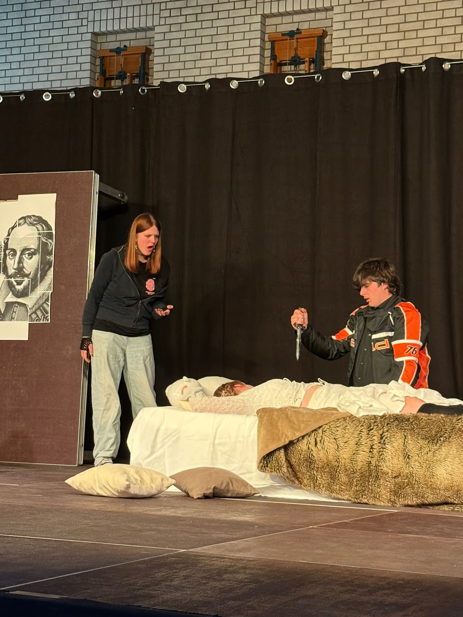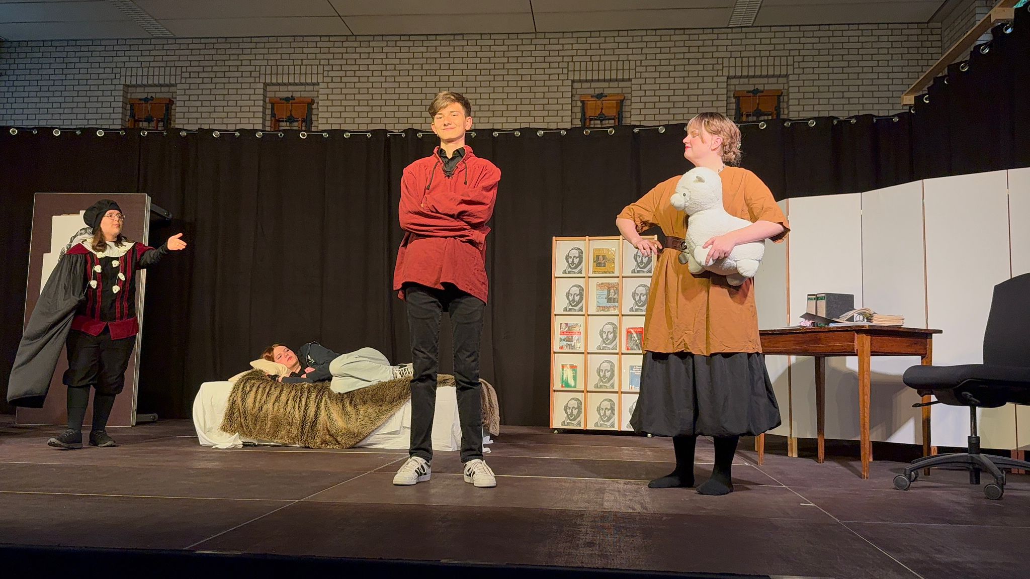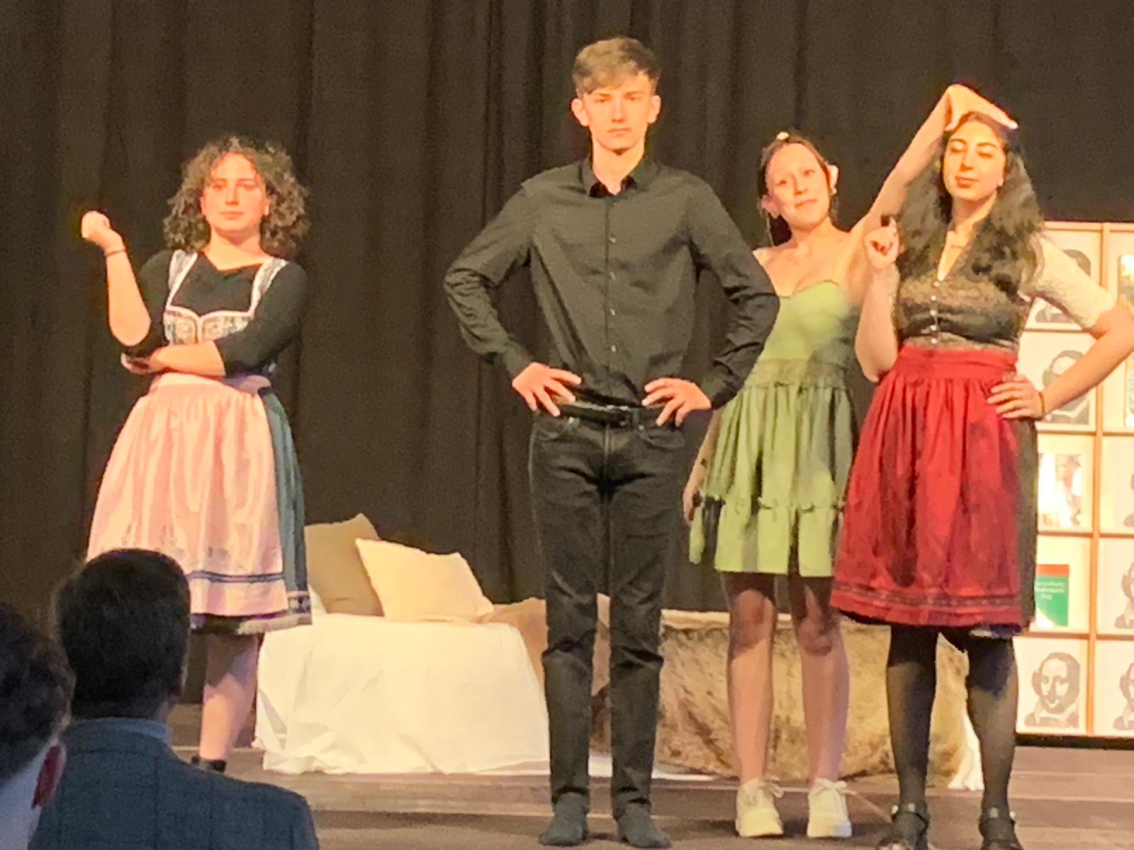 Mit einem tiefen Seufzer beginnt die Geschichte: „Shakespeare - Gerührt und nicht geschüttelt! “. Julia, verkörpert von Franziska Schubert, lässt sich erschöpft auf ihr Bett fallen. Umgeben von einem Schreibtisch, einem Bücherregal, das mit Shakespeare-Ausgaben gefüllt ist, und ihrem treuen Plüschtier, ist sie sichtlich genervt. Sie hat Sport geschwänzt, daraufhin eine Strafarbeit aufgebrummt bekommen und soll nun ausgerechnet über Shakespeare ein Referat halten. „Als ob das heute noch jemanden interessiert“, murmelt sie und wirft das Buch weit weg von sich. Das Publikum lacht, denn Franziskas Darstellung ist nicht nur überzeugend, sondern auch unglaublich gegenwärtig und spricht viele Jugendliche direkt an. Doch dann geschieht das Unfassbare als der Meister selbst erscheint. William Shakespeare, gespielt von Luisa Winter, betritt die Bühne in einem langen Mantel und einer Totenkopfkette, die zu leuchten beginnt, wenn er seine eigenen Werke zitiert. „Wenn die Seele bereit ist, sind es die Dinge auch“, sagt er, und mit diesen Worten beginnt eine fesselnde Reise durch Sprache, Drama, Liebe, Intrige und Komik. Franziska Schubert verkörperte die Hauptrolle der Julia mit einer Intensität, die das Publikum förmlich in ihren Bann zog. Sie bewegte sich mühelos zwischen Sarkasmus, Wut, jugendlicher Überheblichkeit und echter Verzweiflung und vermittelte jede Emotion mit glaubwürdiger Authentizität. Das Publikum lachte mit ihr, litt mit ihr und glaubte ihr jede einzelne Sekunde. Ihr Dialog mit „Shakespeare“ war immer schnell, pointiert und tiefgründig. Als Julia sich über Machtgier und Intrigen in seinen Stücken beschwerte, entgegnete der Dramatiker: „An sich ist nichts weder gut noch böse, das Denken macht es erst dazu“. Das Besondere an dieser Inszenierung war, dass Julia nicht nur in Gedanken zwischen den Szenen springt, sondern tatsächlich mitten hinein. Mal beobachtet sie „Romeo und Julia“, mal steht sie zwischen Hexen aus Macbeth oder mitten in einem Wortgefecht aus „Der Widerspenstigen Zähmung“. Die Übergänge waren fließend, das Spieltempo rasant und der Humor Gold wert. Alessio, Julias Freund, gespielt von Adrian Heinrich, trug mit seiner Hipsterkleidung, seinem Selfiestick und seinen großen Sprüchen zur Unterhaltung bei. Das Publikum reagierte begeistert, als es schließlich zu einem wortwörtlichen Fechtduell zwischen ihm und Shakespeare kam. Was es aber wirklich außergewöhnlich machte, war die bemerkenswerte Fähigkeit des Ensembles, eine breite Palette von Charakteren zu verkörpern. Im Laufe des Abends schlüpften viele der Darstellerinnen und Darsteller mühelos in verschiedene Rollen, jede mit ihrer eigenen einzigartigen Tonlage und Persönlichkeit. Von düsteren Hexen und schwärmenden Elfen bis hin zu verzweifelten Liebenden und machtbesessenen Intriganten verliehen die Darsteller jeder Figur eine lebendige und unverwechselbare Farbe. Einer der kraftvollsten Momente der Aufführung war zweifellos die Auseinandersetzung mit den Themen Wahrheit und Liebe. Shakespeare selbst verkörperte diese Emotionen, als er die berühmten Worte sprach: „Lieb’ ist ein Rauch, den Seufzerdämpf’ erzeugt… Was ist sie sonst? Verständ’ge Raserei.“ Julia, mit Tränen in den Augen, erzählte von ihrer zerbrochenen Beziehung und vermittelte dem Publikum die Tiefe ihrer Emotionen. Am Ende des Stücks hatte Julia nicht nur ihre Präsentation abgeschlossen, sondern auch eine tiefere Wertschätzung für die Weisheit und die zeitlosen Themen, die in klassischen Geschichten verborgen sind, entwickelt. Doch kaum hatte sie eine Herausforderung gemeistert, stand schon die nächste vor der Tür: die bevorstehende Physikprüfung und die Komplexität von Einsteins Theorien. Der letzte Lacher gehörte dem Genie selbst, der von Michael Augustin als krönender Abschluss geseilt wurde. Nun blieb also offen, wie es mit Julia und ihrer nächsten Prüfung weiterging. Nach der Aufführung wandten sich die Darstellerinnen und Darsteller nochmal direkt an das Publikum und insbesondere an ihre Regisseurin. Unter Applaus drückten sie ihre Dankbarkeit aus und bezeichneten die Erfahrung als das Highlight ihrer Schulkarriere. Es war offensichtlich, dass Theater für diese jungen Menschen mehr ist als nur eine Pflichtveranstaltung im Schulkalender. Es bietet nämlich eine Plattform, auf der sie sich kreativ ausdrücken, über sich hinauswachsen und ihre Talente einem breiteren Publikum präsentieren können.