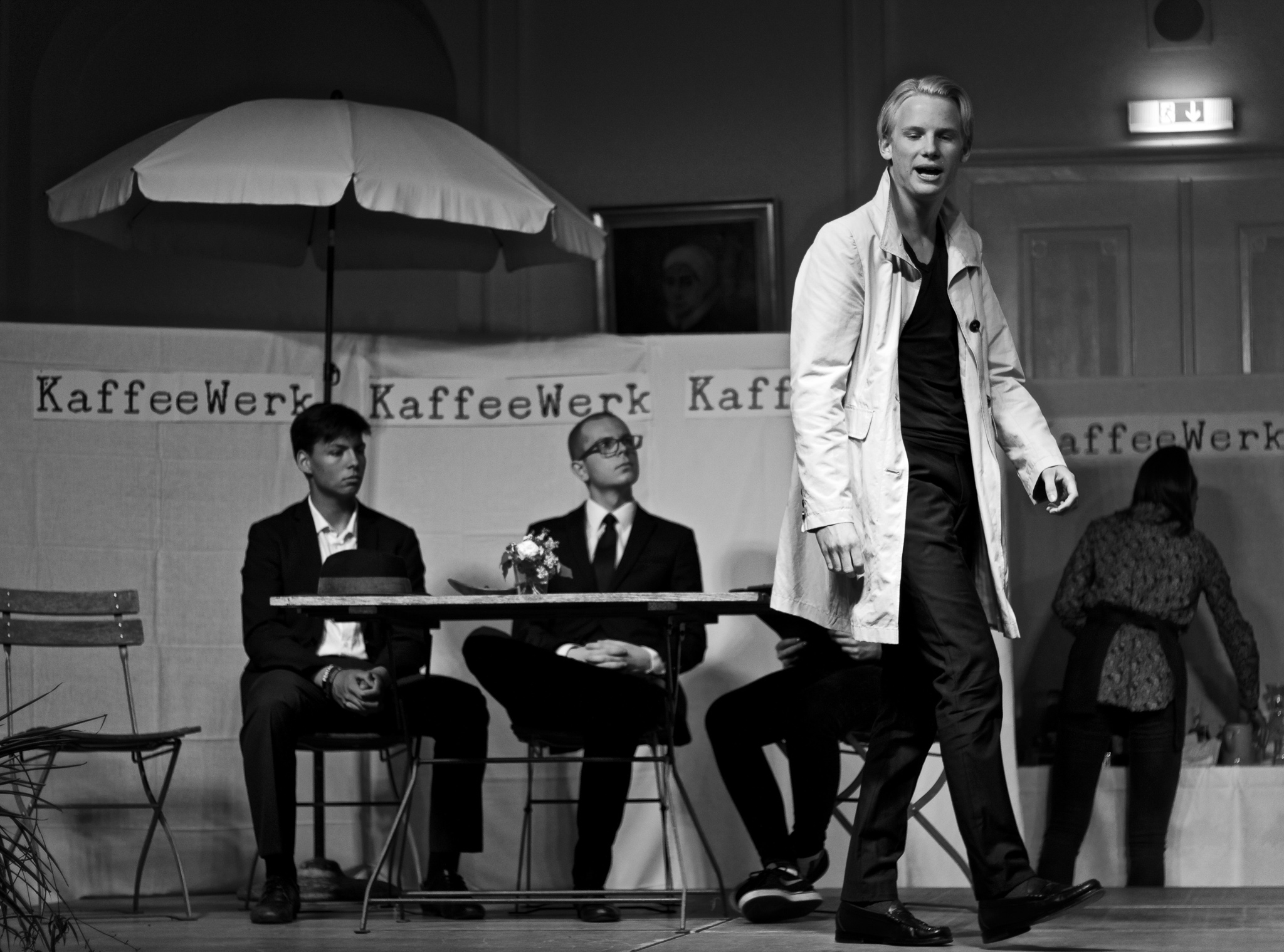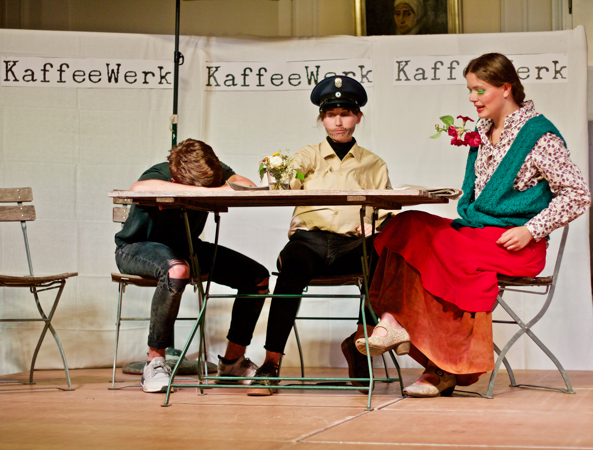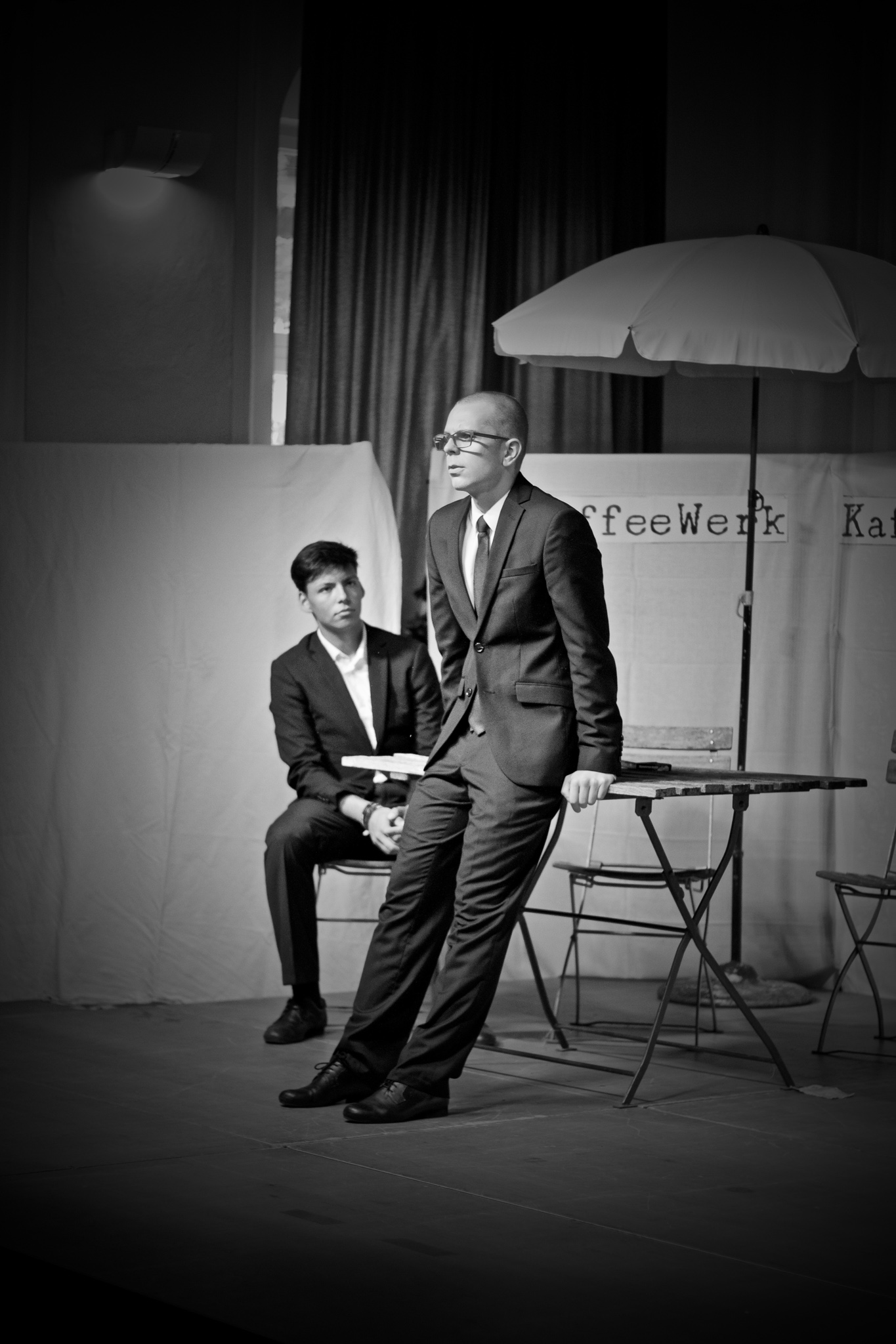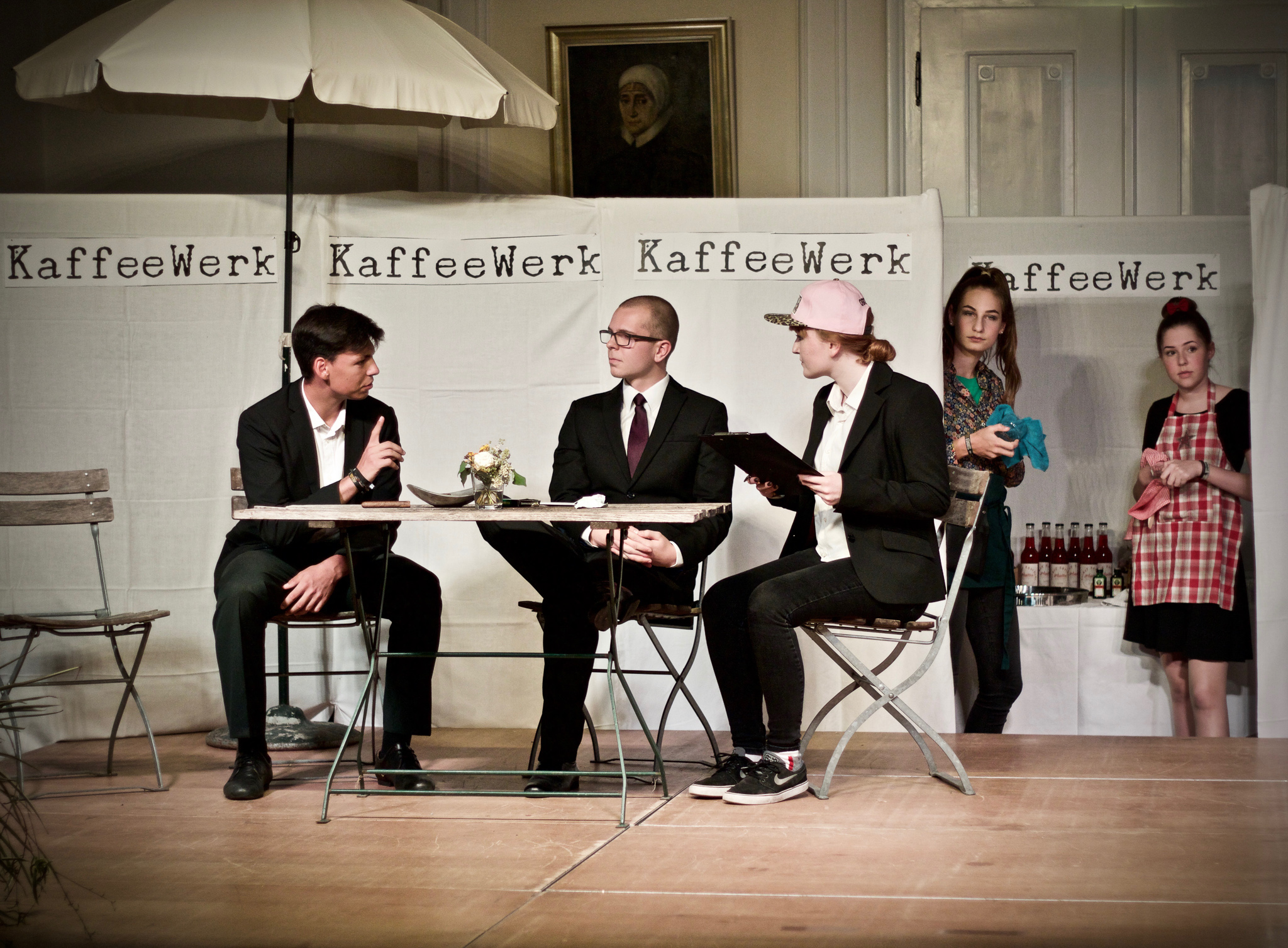 Die Q11 bringt den ersten Akt auf die Terrasse des Kaffeewerk in der Innstadt. Hier verhandeln skrupellose Geschäftsleute über neue Geld- und Ölquellen. Zu ihnen zählen der mafiöse, einflussreiche Präsident, den Patrick Herre gelungen als geldgierigen Unsympathen gibt, der von den miesen Touren nicht ganz so überzeugte Baron (Arian Zacher), der korrupte Börsenmakler (Felix Hollube) und der keineswegs vertrauenswürdigere Prospektor (Paul Färber). Die hohen Herren, alle also Gauner, wollen eine Aktiengesellchaft gründen und dabei auch das Publikum übers Ohr hauen.