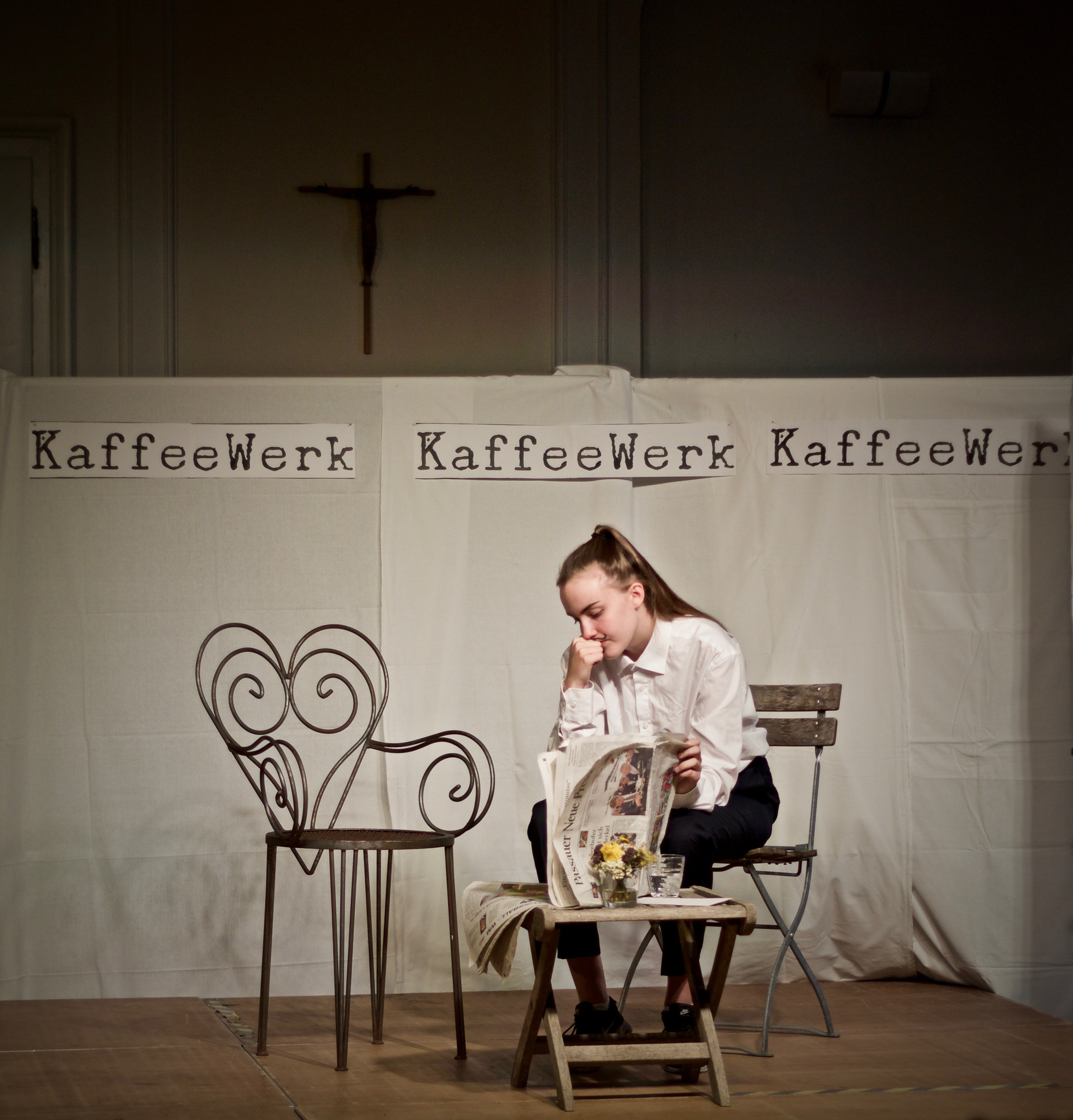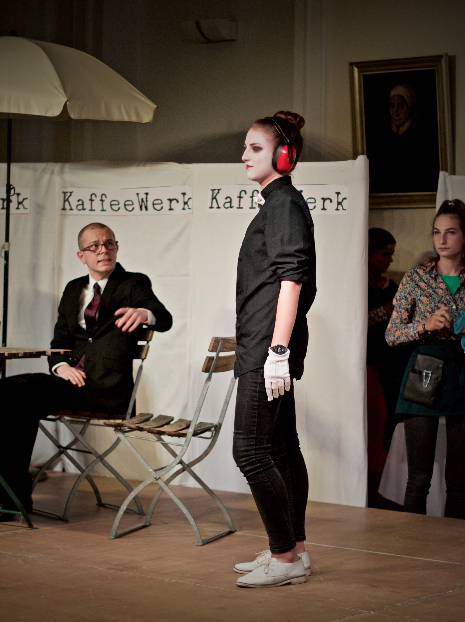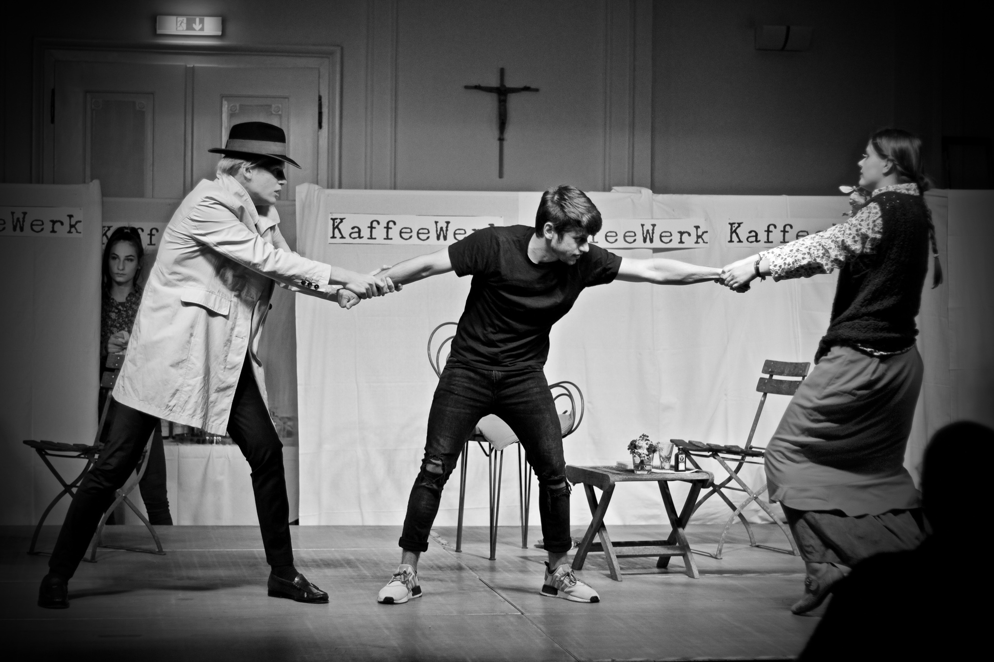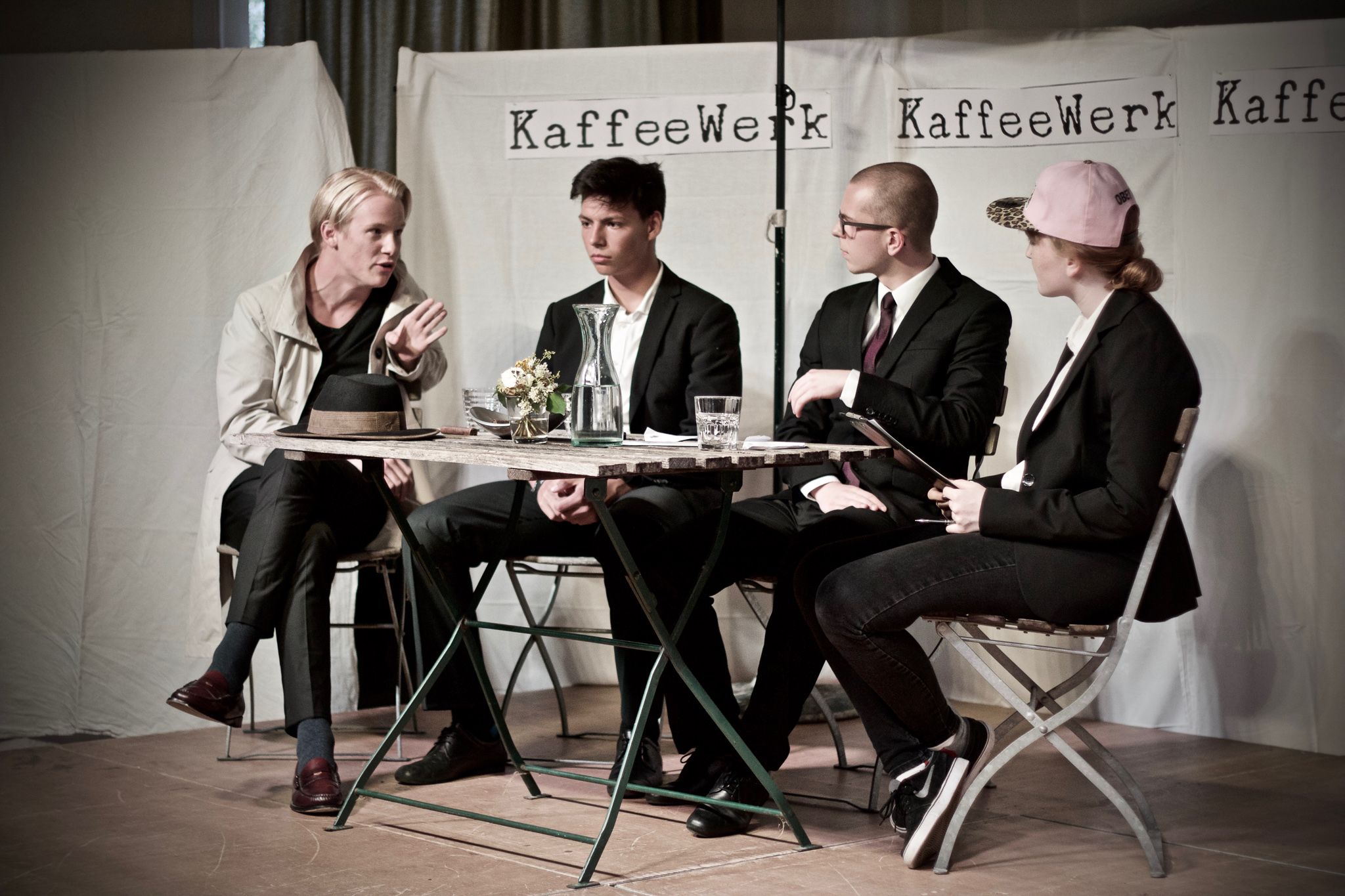 Die Q11 bringt den ersten Akt auf die Terrasse des Kaffeewerk in der Innstadt. Hier verhandeln skrupellose Geschäftsleute über neue Geld- und Ölquellen. Zu ihnen zählen der mafiöse, einflussreiche Präsident, den Patrick Herre gelungen als geldgierigen Unsympathen gibt, der von den miesen Touren nicht ganz so überzeugte Baron (Arian Zacher), der korrupte Börsenmakler (Felix Hollube) und der keineswegs vertrauenswürdigere Prospektor (Paul Färber). Die hohen Herren, alle also Gauner, wollen eine Aktiengesellchaft gründen und dabei auch das Publikum übers Ohr hauen.