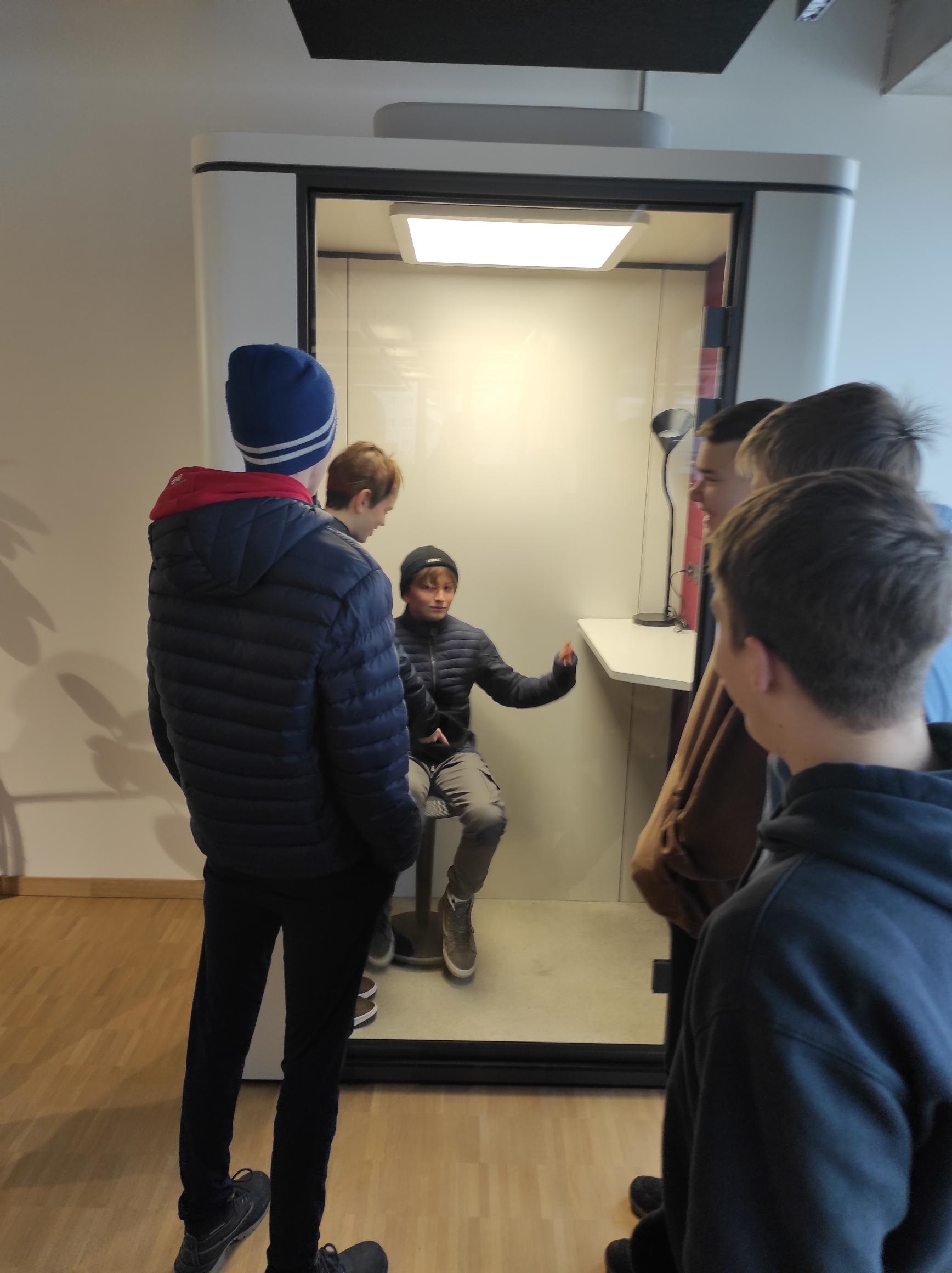 Beim anschließenden Rundgang besichtigten die Schüler:innen mitunter die große Gemeinschaftsküche, die Telefonzelle, Konferenzräume, offene und geschlossene Büros und entdeckten freilich auch einen Kicker und die Tischtennisplatte. Außerdem berichtete Fr. Schneider, die uns durch das Gebäude führte, von diversen Geschäftsideen, die hier erfolgreich umgesetzt werden.