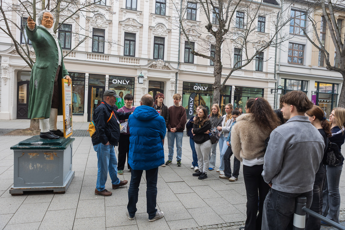 In Weimar bot das Goethehaus den Schülerinnen und Schülern die Möglichkeit, in die "Privatsphäre" des berühmten Schriftstellers einzutauchen. Die lebendige Führung durch die Ausstellung hinterließ bei den Teilnehmern bleibenden Eindruck. Unvorstellbar, womit sich dieser Mensch an der Wende zum 19. Jahrhundert alles beschäftigte. Auf dem Stadtrundgang stand dann Anna Amalia, eine Vertreterin der Aufklärung und Grande Dames in Weimar im Zentrum der Aufmerksamkeit und die Gruppe erfuhr auch, was das Bauhaus mit Demokratie zu tun hat.