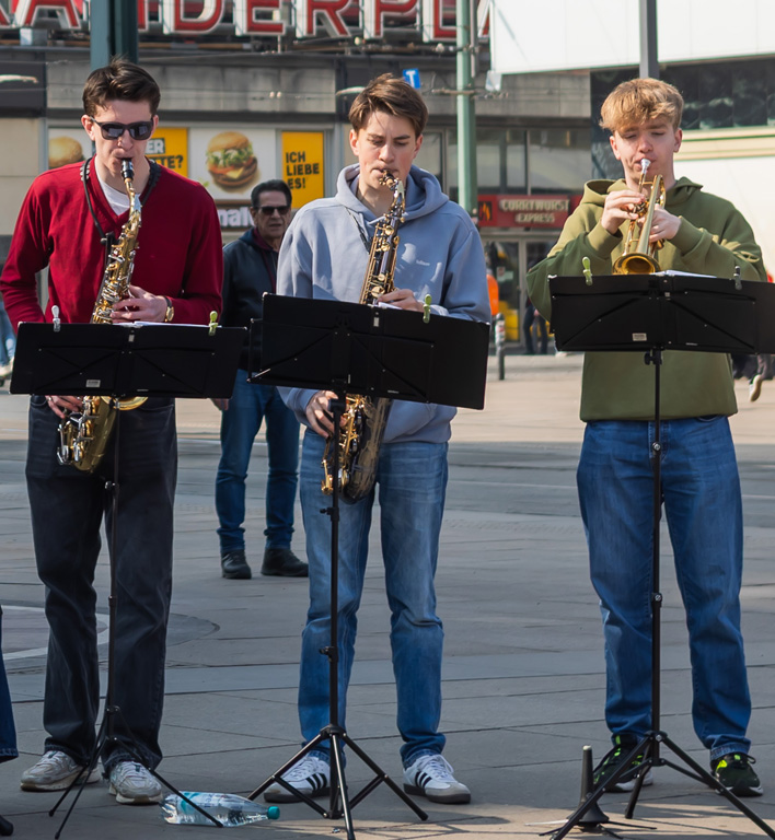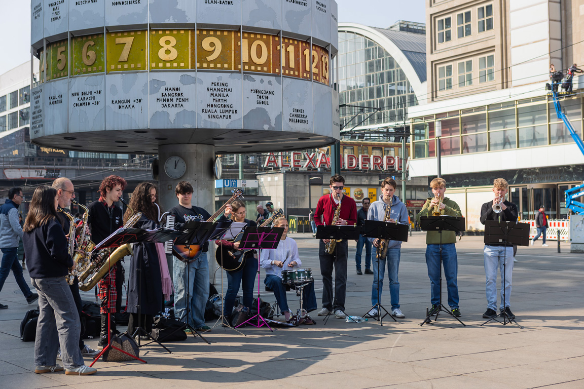 Am nächsten Tag stand der Alexanderplatz in Berlin auf dem Programm. Die Big Band gab dort ein mitreißendes Konzert, das nicht nur Passanten anzog, sondern auch die Polizei mobilisierte. "Es war ein Nervenkitzel, doch zum Glück durften wir weitermachen", berichtet Julieta. Die musikalischen Darbietungen erzeugten fröhliche Stimmung und viele Zuhörer zückten ihre Handys, um den Moment festzuhalten – einige hinterließen sogar Geld in dem aufgestellten Koffer, was die jungen Musiker besonders erfreute.