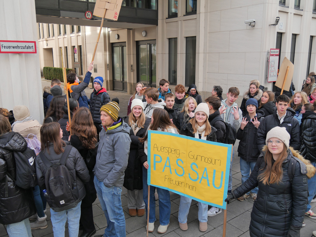 Der Rat freier Schulen (RFS), der alle Privatschulverbände Bayerns bündelt, will die permanente Benachteiligung privater Schulen gegenüber staatlichen Schulen nicht mehr mitmachen. Eine große Kundgebung letzten Mittwoch auf dem zentralen Münchner Königsplatz sollte unter dem Motto „Wir melden uns“ auf die Ungleichbehandlung der privaten Schulen hinweisen. Das Passauer Auersperg-Gymnasium folgte dem Aufruf des RFS und fuhr mit zwei neunten Klassen in Begleitung ihrer Lehrkräfte Monika Fecher, Hans-Peter Ritzer und Markus Viol in die Landeshauptstadt. Mit Transparenten machten auch diese rund 50 Freudenhainer auf sich aufmerksam und forderten mehr Gerechtigkeit bei der Schulfinanzierung.