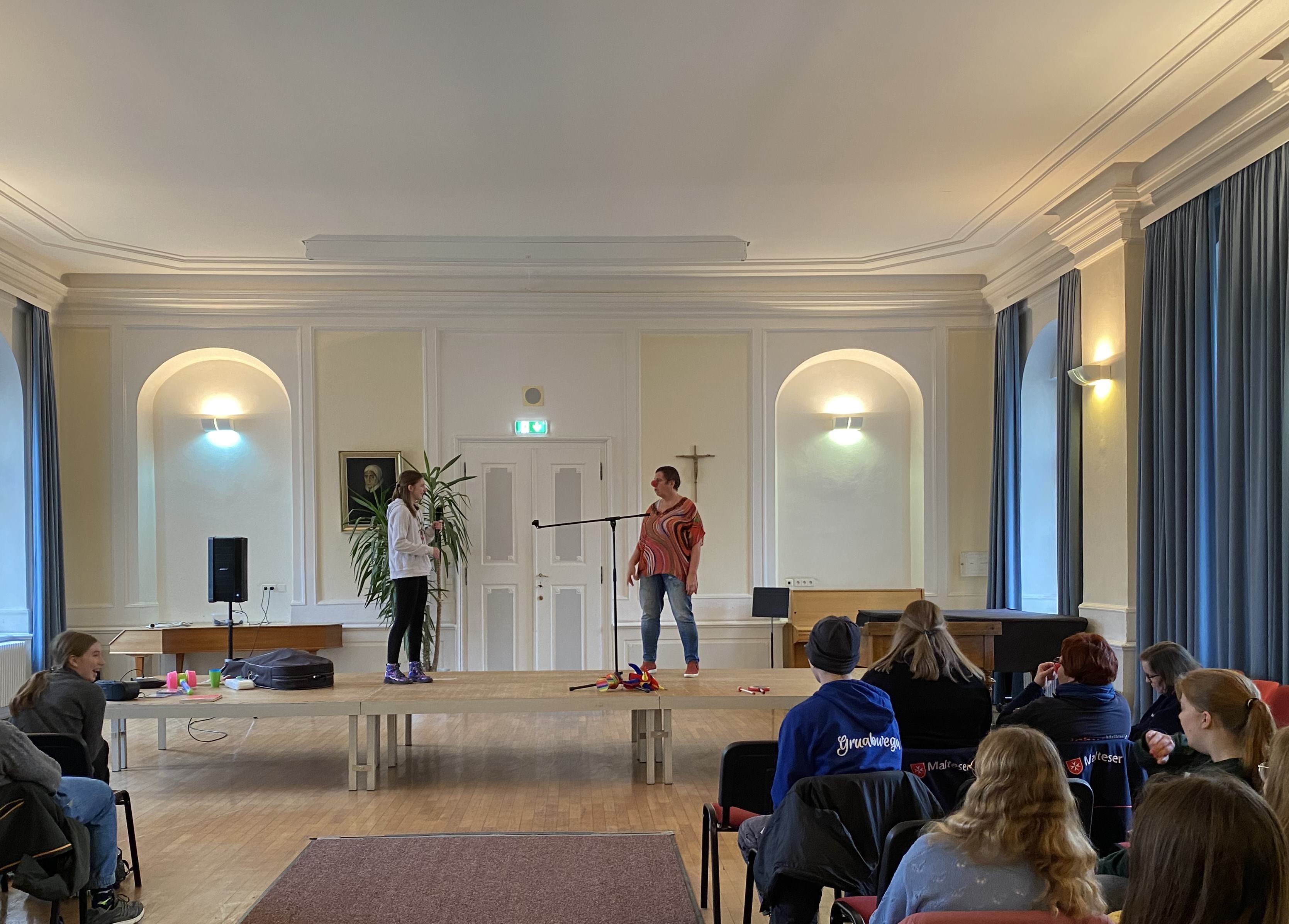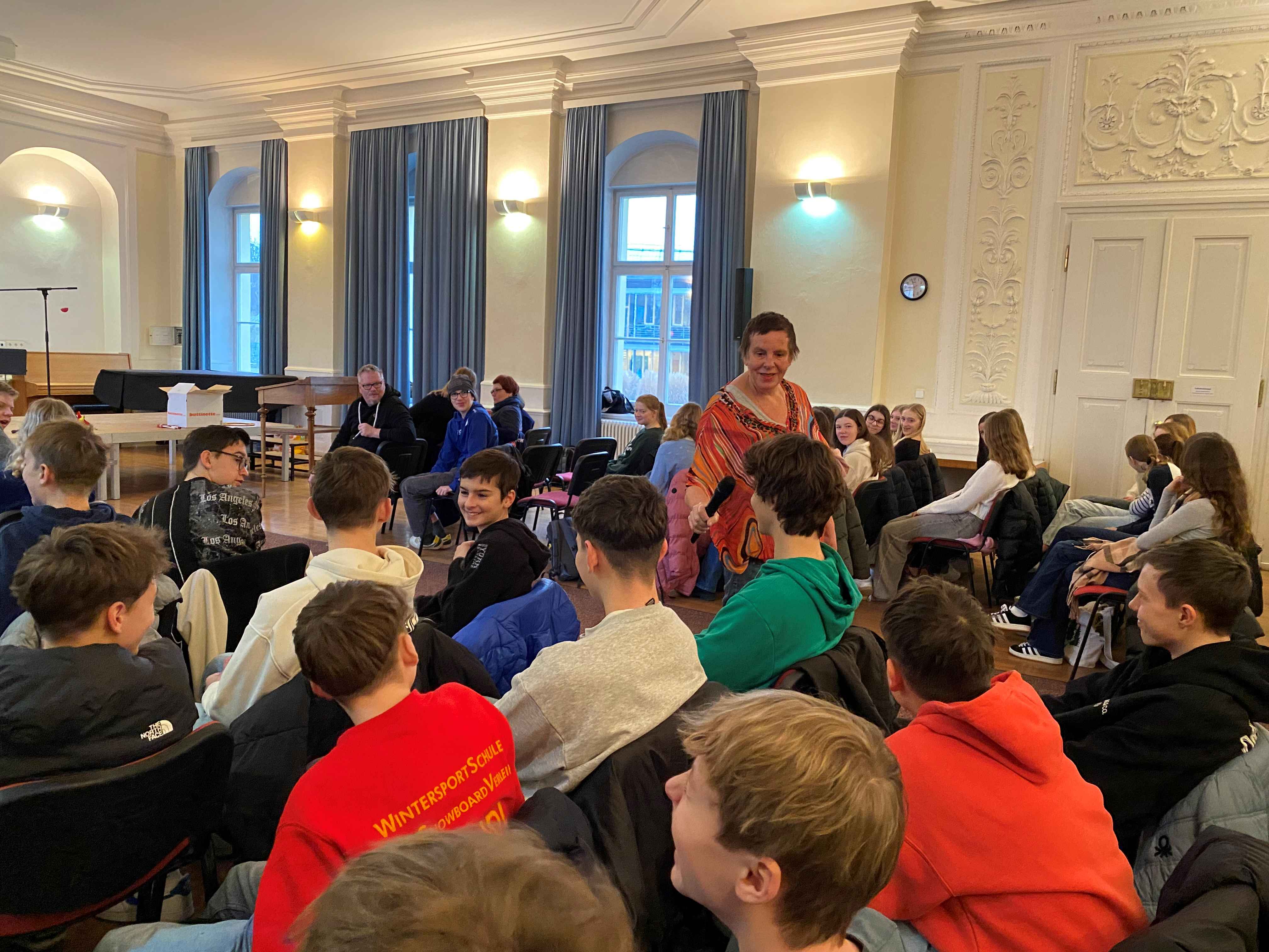 Die 8. Jahrgangsstufe konnte ein Team des Malteser Schutzbundes Passau unter Leitung von Rosmarie Friedsam begrüßen, das sich dem Thema Demenz im Rahmen von Theaterszenen anzunähern versuchte, auch wenn dabei recht klar die Grenzen für die rein künstlerische Auseinandersetzung mit diesem generationenübergreifenden Lebensproblem erkennbar wurden.