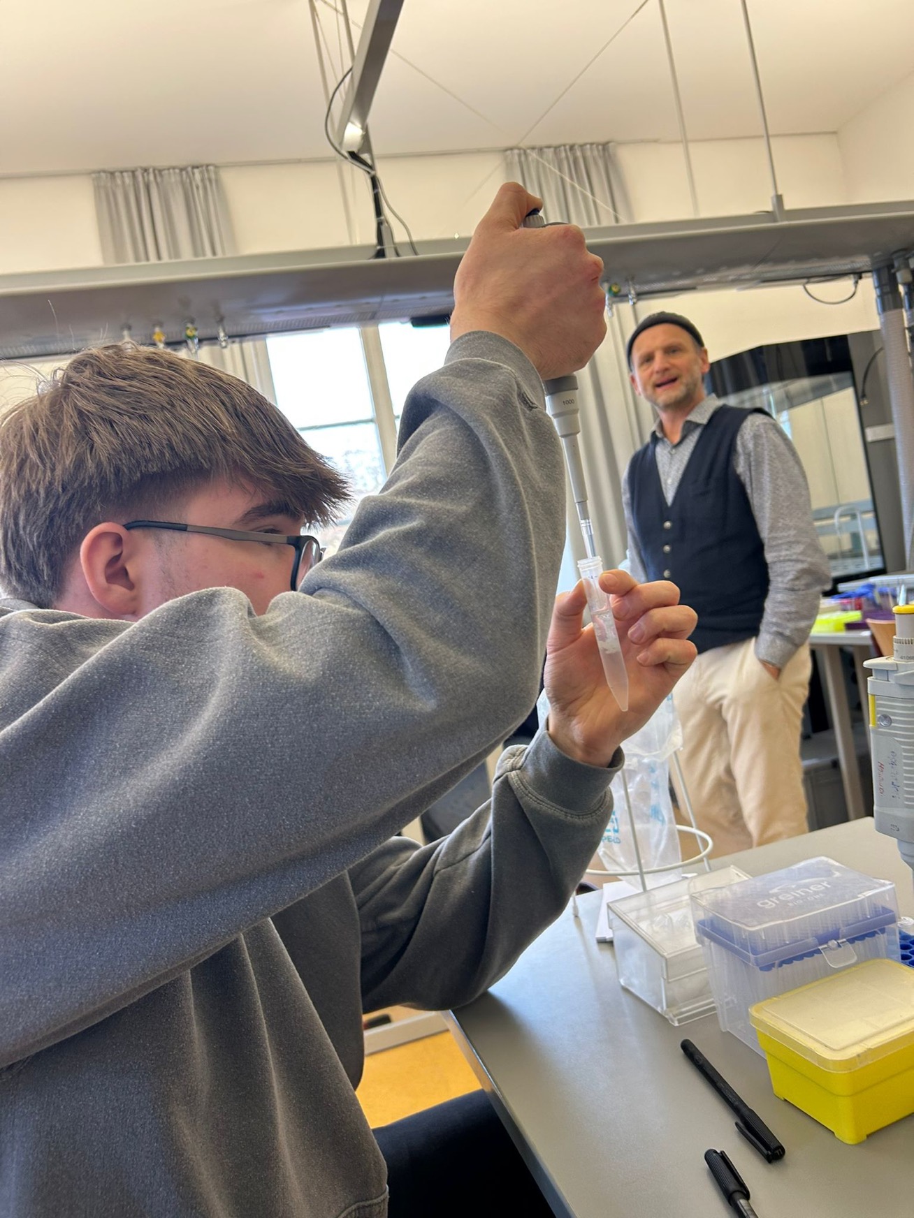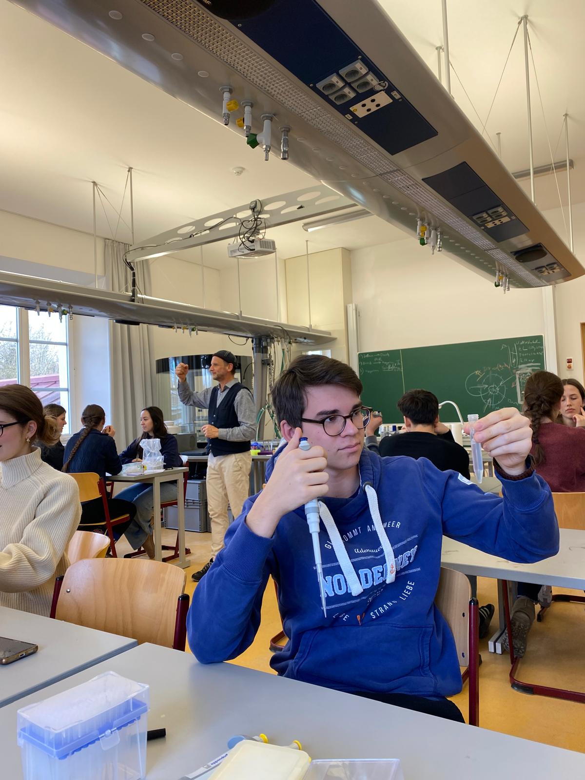 Die Q12, die sich bereits im Horizont der gymnasialen Oberstufe dem Ende ihrer Schullaufbahn nähert, durfte in kleinen Gruppen bei Yoga in Körpererfahrungen dem eigenen Ich nachspüren und wurde von Beratungslehrer Henrik von Rosenberg mit einem Lern-Coaching in die mittelfristige Abiturvorbereitung eingeführt. Die naturwissenschaftliche Perspektive im Aufspüren des eigenen Genoms hatte Biologielehrerin Astrid Liedl im schuleigenen Chemiesaal organisiert, die entsprechenden Forschungseinblicke in die Praxis der Genforschung forderten langanhaltende und intensive Konzentration.