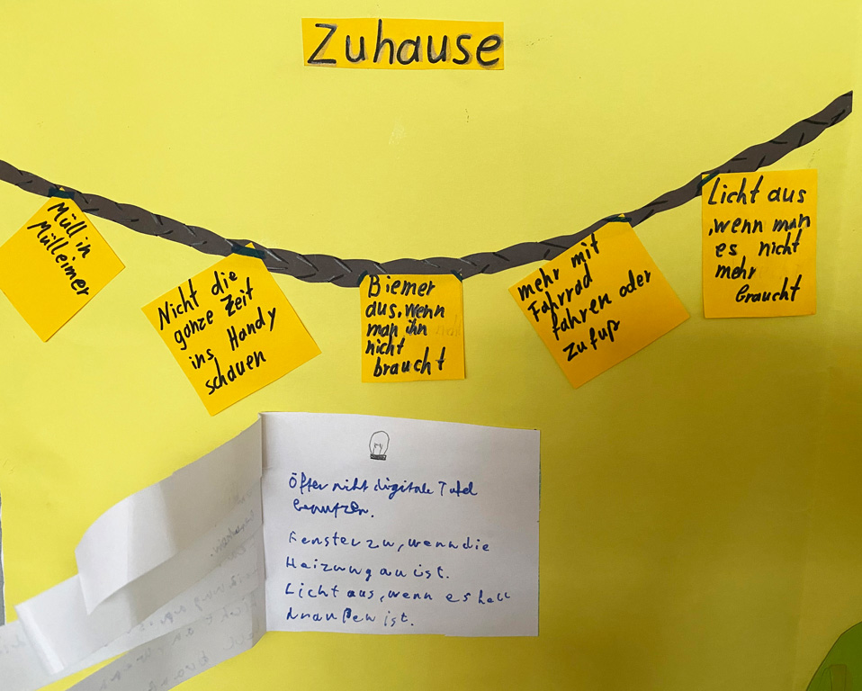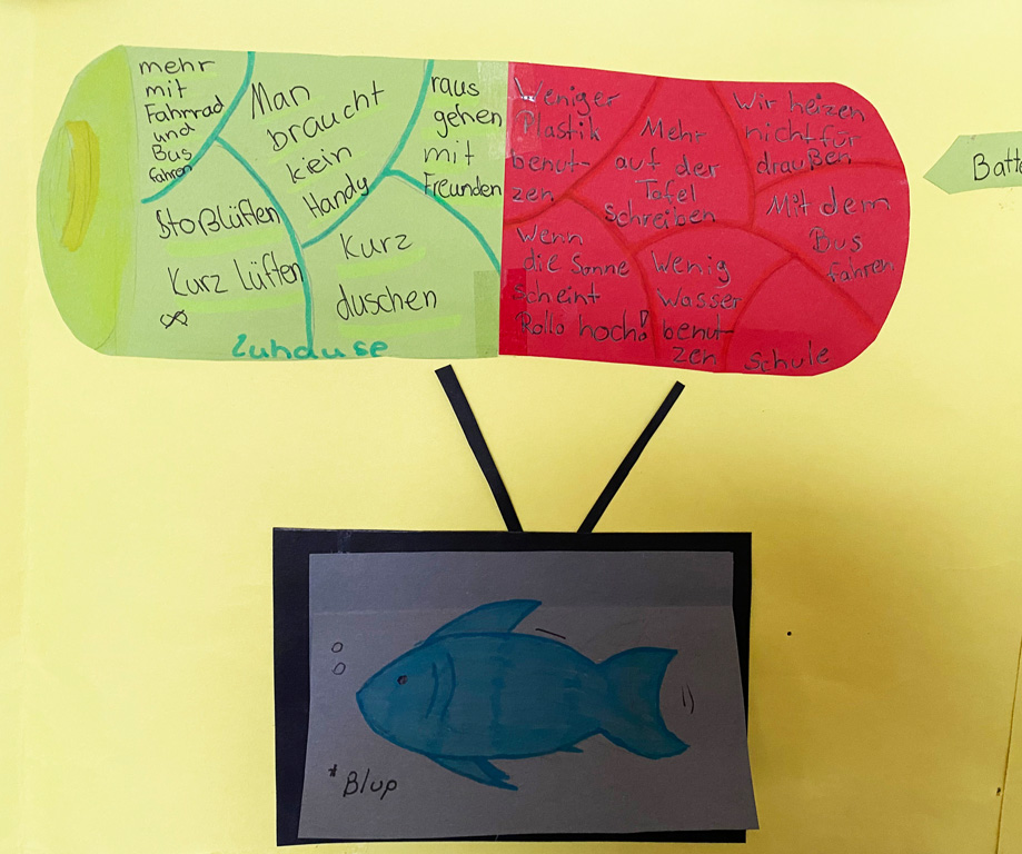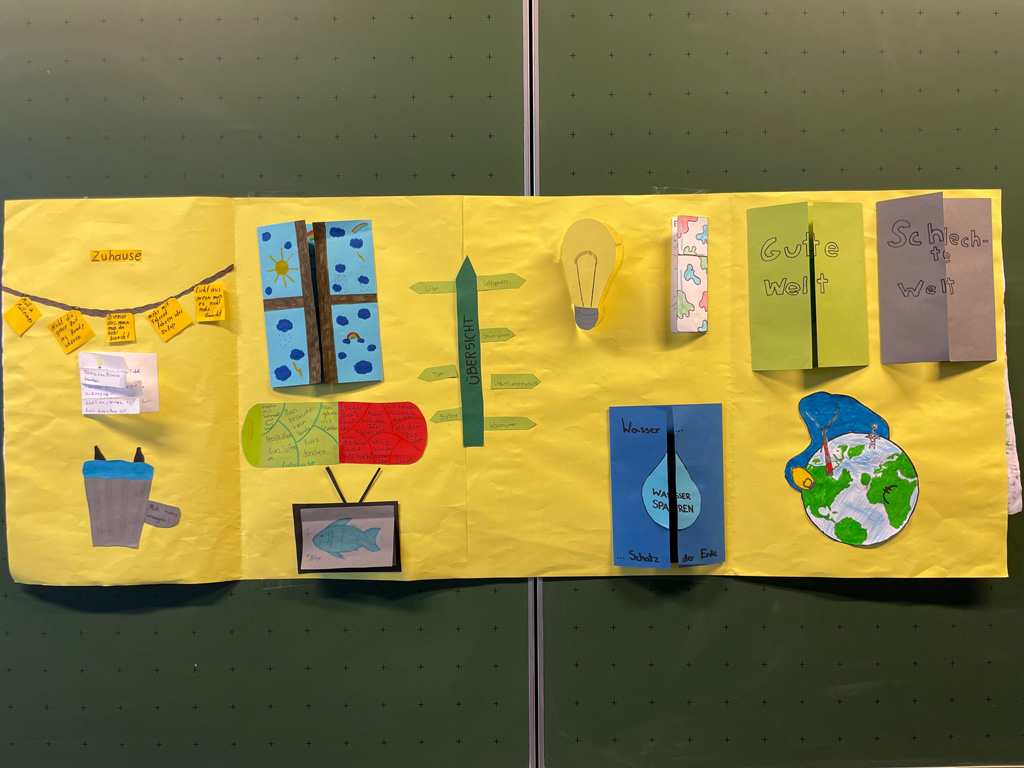 Viele Einsendungen gab es zum Energiespar-Wettbewerb, der zu Jahresbeginn von der Schulleitung ausgelobt worden war. Am originellsten und umfassendsten war der Beitrag der Klasse 6a. Sie hatte zusammen mit ihrer Klassleiterin Julia Fuchs viele Ideen zum Energiesparen gesammelt und auf einem Lapbook präsentiert, einer Art aufklappbarem Plakat. Wie ein Buch lässt es sich öffnen und unter den vielen Klappen im Inneren verbergen sich Ratschläge speziell für Nachhaltigkeit in der Schule, aber auch für daheim.