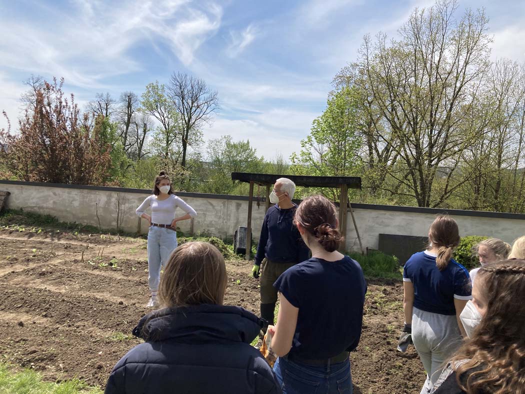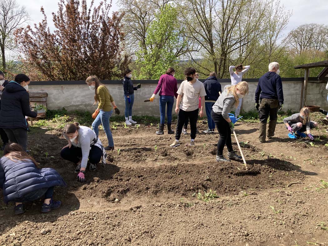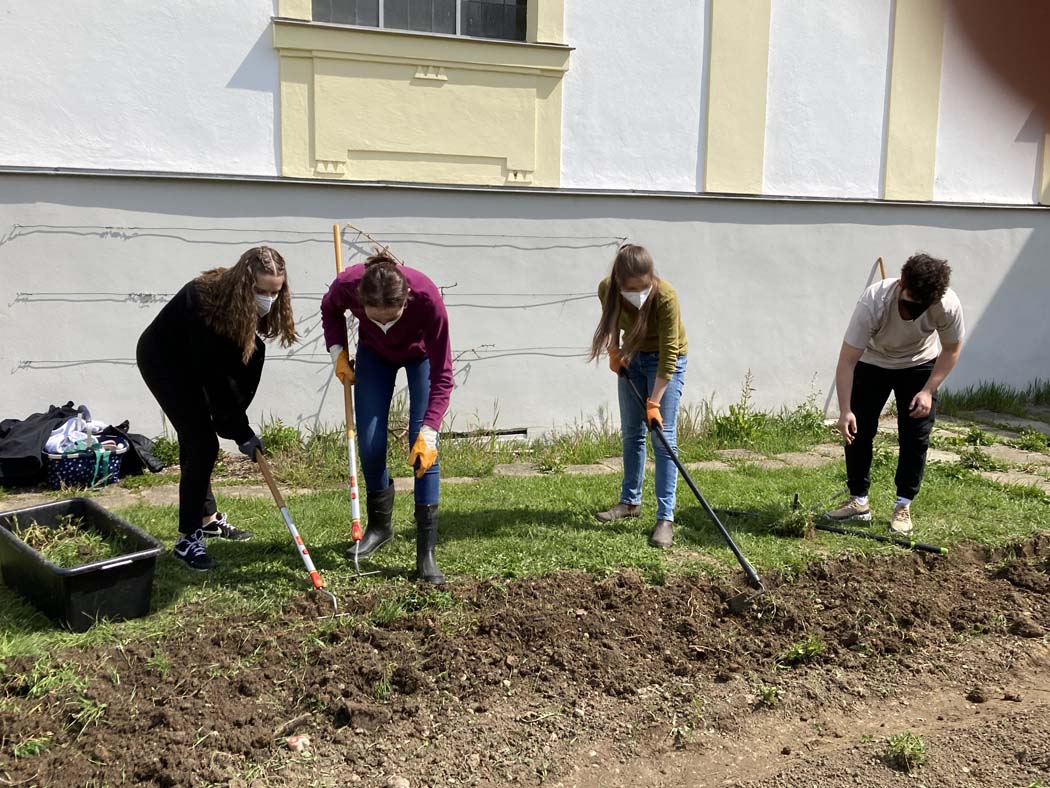 Normalerweise beginnt mit dem Umgraben und Pflanzen die Arbeit für die Schüler/-innen der 5. Jahrgangsstufe im Rahmen des Unterrichts von Natur und Technik. Leider waren diese in diesem Schuljahr aufgrund des Lockdowns noch nicht in der Schule, sodass die Schüler/-innen der Q11 mitanpacken mussten. Sie schafften es in Rekordzeit, die Beete vorzubereiten und Salat-, Rote Beete-, Kohlrabi- und Fenchelpflänzchen einzusetzen.