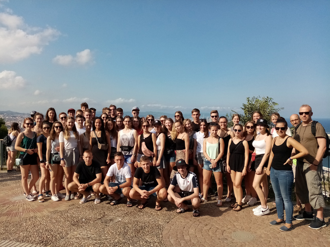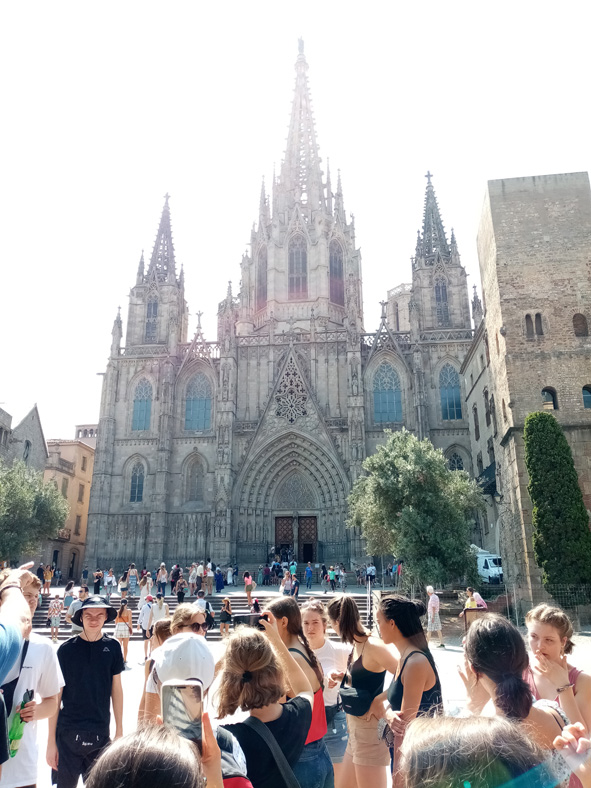 Im Rahmen der Abschlussfahrt machten sich 47 Schülerinnen und Schüler der Q11 sowie 5 Lehrkräfte auf den Weg nach Barcelona. Dort wurden sie von schönem und sehr warmem Wetter empfangen, das die Gruppe die gesamte Zeit begleiten sollte. Nach der Ankunft in Katalonien erkundeten die Schülerinnen und Schüler deren größte Stadt Barcelona auf einer Busrundfahrt. Etwas genauer wurde den Jugendlichen am Folgetag das gotische Viertel nähergebracht, das unter anderem die Überreste einer römischen Stadt beherbergt. Die Markthalle (mercat) und die Ramblas sowie die zahlreichen gastronomischen Angebote in unmittelbarer Nähe waren im Anschluss beliebte Ziele, um die freie Zeit bis zur Besichtigung der Casa Milà, eines beeindruckenden Bauwerks von Antoni Gaudí, das 1910 fertiggestellt wurde, zu verbringen. Der darauf folgende Tag begann mit dem Besuch des Hospitals de la Santa Creu i Sant Pau, das mitnichten bis 2009 einfach nur ein Krankenhaus war. Der gesamte Komplex begeisterte nicht nur die Schüler mit seiner imposanten Gestaltung und Größe. Nach diesen tollen Eindrücken folgte eine Führung im wohl berühmtesten und faszinierensten Bauwerk Barcelonas, der Sagrada Familia, die von Gaudí entworfen wurde. Am Abend zog schließlich der „magische Brunnen“ (Font Màgica) mit seinen beeindruckenden Farben und Choreographien noch einige Schüler in seinen Bann. Neben dem kulturellen Angebot wurde den Schülern auch eine Erkundung des nahe gelegenen Bergs Montserrat geboten. Neben der Besichtigung der dortigen Klosterkirche Santa María de Montserrat stand auch eine Wanderung auf dem Berg auf dem Programm. Eine Zahnradbahn brachte die gesamte Gruppe zu den Wanderwegen. Eine größere Gruppe bestieg sogar den über 1200m hoch gelegenen Gipfel. Egal ob vom Gipfel oder von weiter unten – die Aussicht war einfach wunderbar. Naturwissenschaftlich Interessierte, aber auch solche, die erst noch auf dem Weg dorthin sind, kamen im Museum Cosmo Caixa auf ihre Kosten. Außerdem konnten sich einige Schüler von der Unterwasserwelt des Aquariums in Barcelona faszinieren lassen. Der letzte komplette Tag stand den Schülerinnen und Schülern zur eigenen Gestaltung zur Verfügung. Bereits noch vor der Morgendämmerung wagten sich eine Handvoll Schülerinnen mit einer Lehrkraft zum Strand, um einem herrlichen Sonnenaufgang beizuwohnen. Noch am selben Vormittag nutzte eine Gruppe von gut ein Dutzend Schülerinnen und Schülern die freie Zeit, um den Park Güell mit seinen einzigartigen Bauten und den prächtig angelegten Grünanlagen kennenzulernen. Natürlich verbrachten sehr viele die Zeit auch am Strand oder beim Bummeln und Shoppen oder in den vielen einladenden Cafés, ehe tags darauf die Heimreise angetreten werden musste – mit schönen Erinnerungen im Gepäck.