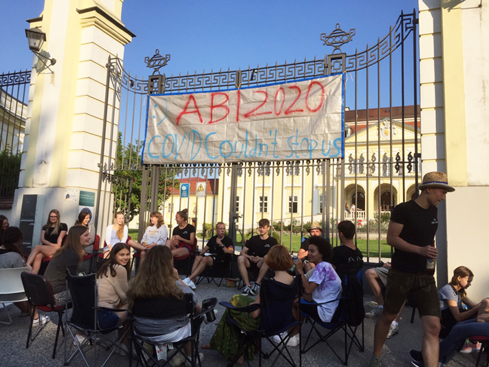 Dezimiert war die Anzahl, von gebotener Kürze die Feier, dennoch besinnlich der Rahmen. Pfarrer und Religionslehrer André Urbanczyk verwies eingangs in einem „religiösen Impuls“ auf die Unberechenbarkeit des Lebens und erteilte den Abiturient/-innen, ihren Freund/-innen und Eltern den Schlusssegen (s. Foto von Helmut Preuß). Für die Abiturienten dankte Sprecher Jonas Glotz den Eltern für ihren Beistand, den Lehrkräften – insbesondere Oberstufenkoordinatorin Claudia Breitenfellner – für das ungewöhnliche Engagement, „auf das Abitur in Chats und Videokonferenzen vorzubereiten.“ Auch wenn im Leben oftmals Zahlen dominierten, der Notendurchschnitt etwa fürs Studium oder der Verdienst beim Lebensunterhalt, so seien die individuellen Erinnerungen an die Schulzeit mehr von persönlichen Begegnungen, von Freundschaften und kurzweiligen Erlebnissen geprägt.