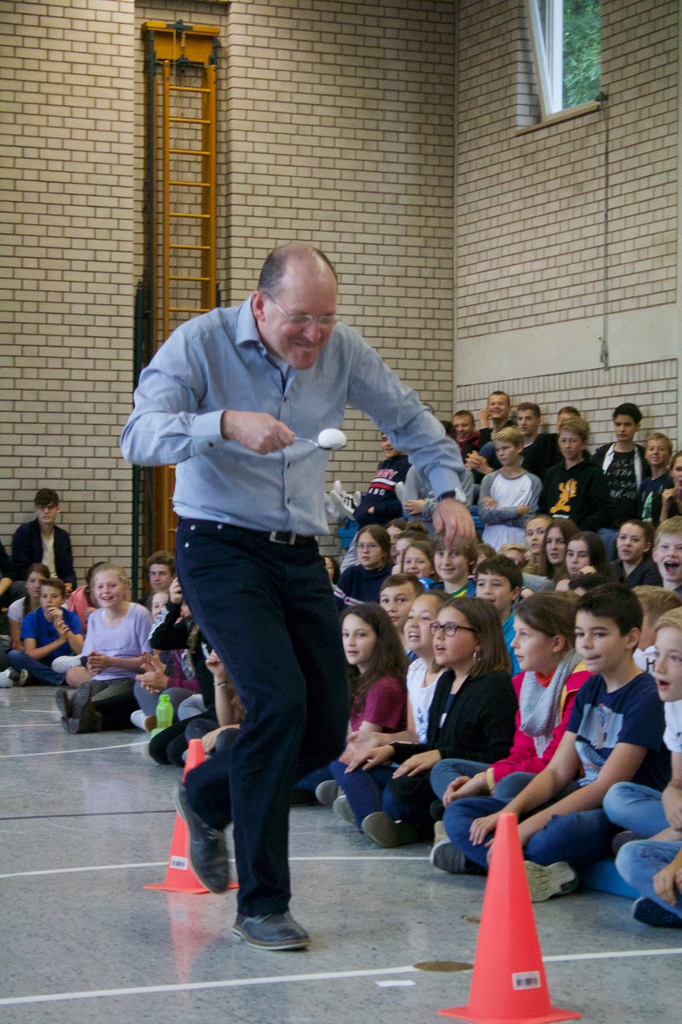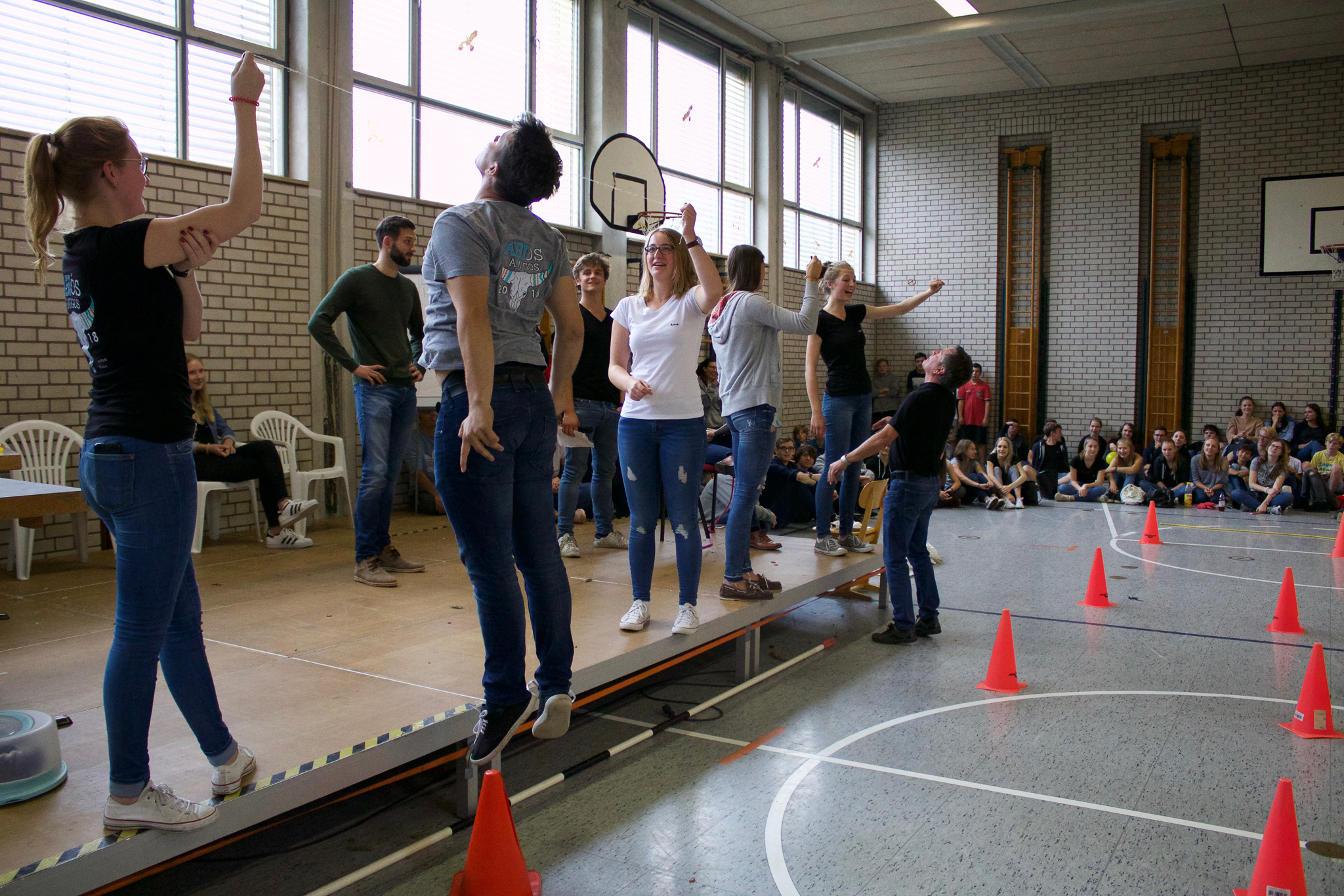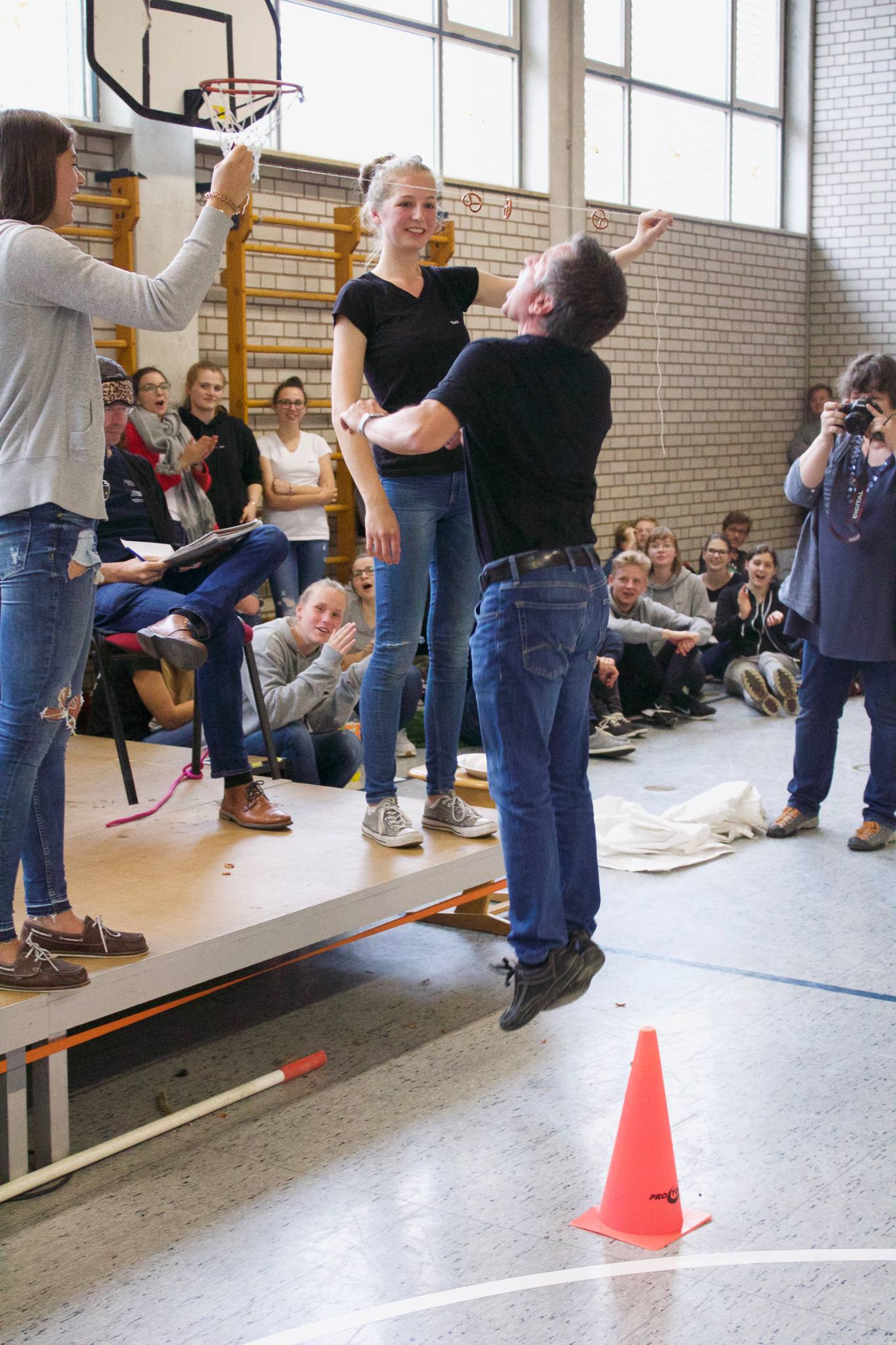 Auf dem Stundenplanbildschirm lief an diesem Morgen die Reklame für die Abizeitung und nach der Pasue wurde der Direktor in Gewahrsam genommen und in die Turnhalle abgeführt. Es war die Aufgabe des Lehrerkollegiums, ihn durch einen Parcours, bei dem die Lehrer gegen Schüler der Unter- und Mittelstufe antraten, auszulösen. Das gelang natürlich nicht, weil aus Sicht der Lehrer die Punktevergabe sehr kreativ war. Da blieb Herrn Zitzl nur noch übrig, sich durch ein selbstverfasstes Gedicht selbst zu retten. Mit einem Essen für das Lehrerkollegium endete die Aktion der Abiturienten. Insgesamt ein gelungener Streich, an dem alle Freude hatten.