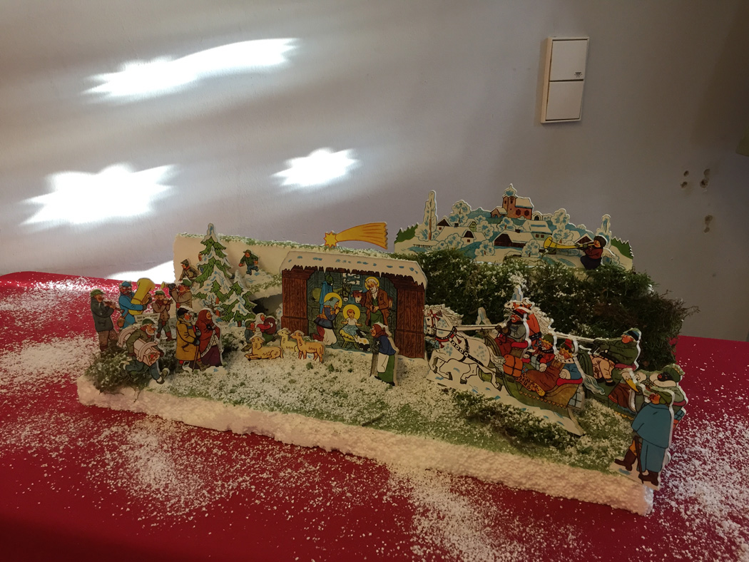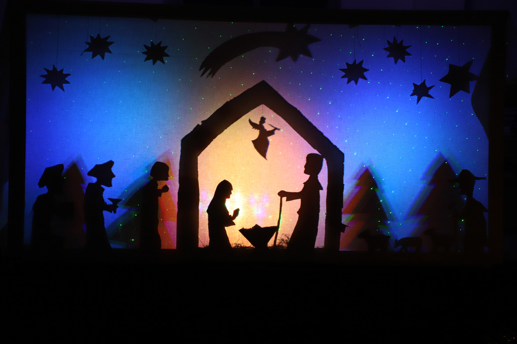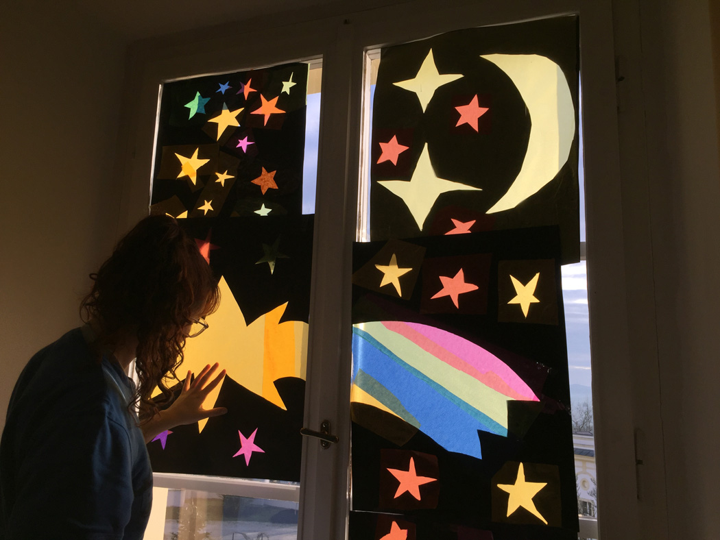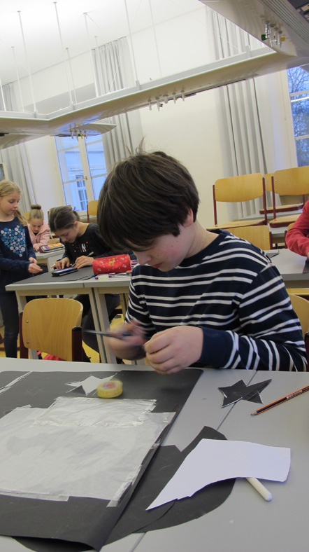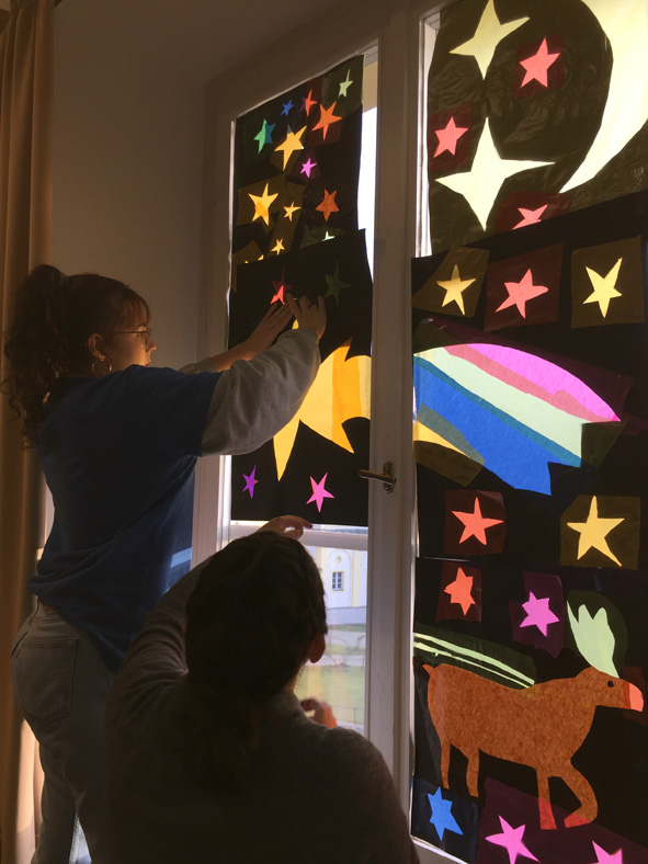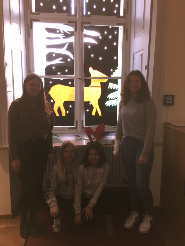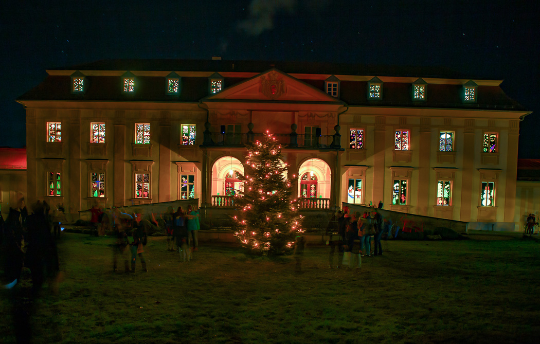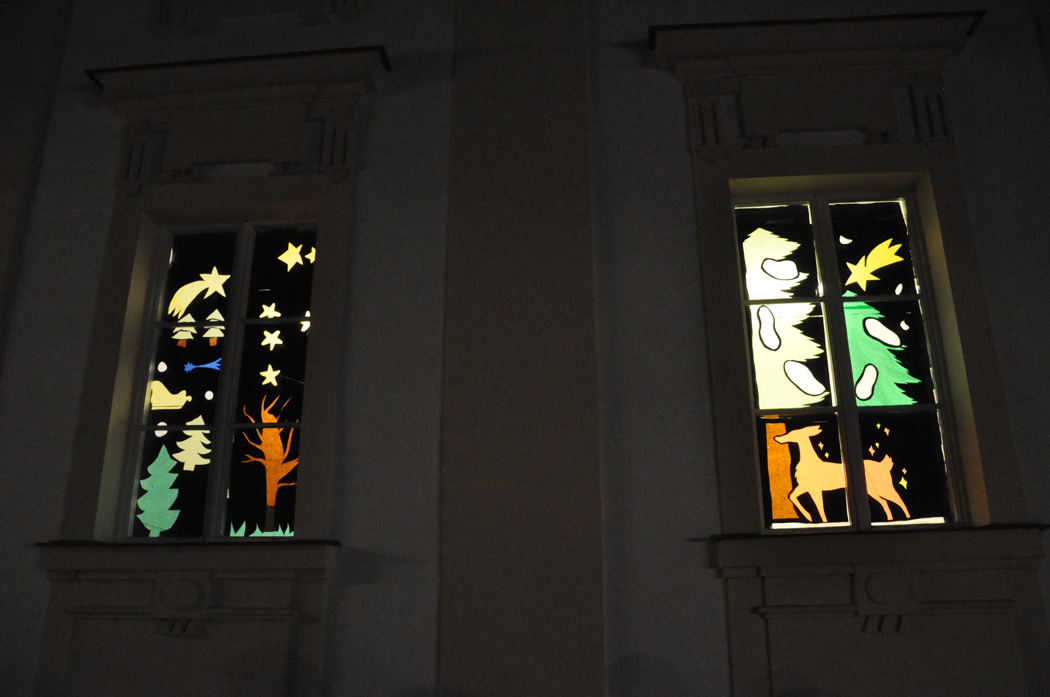 Sterntaler“ stimmte alle Besucher auf das Fest der Liebe und des Gebens ein. Dann wurden nacheinander die Fenster der Hauptfassade erhellt und zauberten Winterlandschaften, weihnachtliche Motive und einen Sternenhimmel herbei. In mühevoller Schneide- und Klebearbeit hatte jede Klasse ein Fenster des Schlossgebäudes gestaltet, das nun als Ganzes den Zusammenhalt der Schulfamilie symbolisierte, die das Weihanchtsfest freudig erwartet.