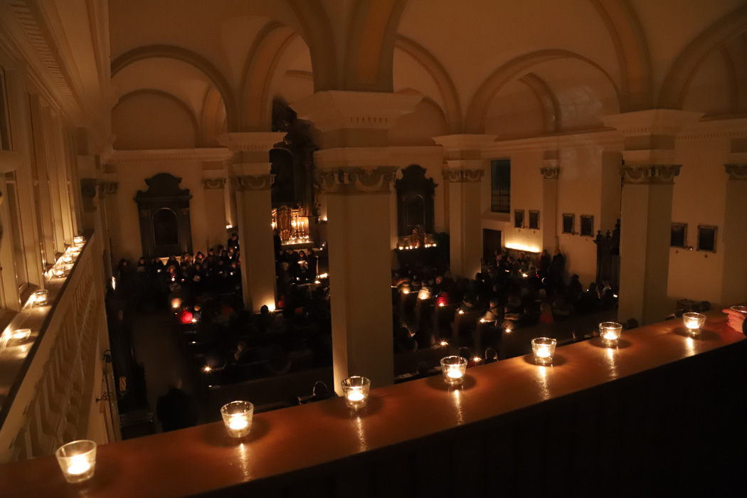 Zweimal an diesem Abend gab es die Gelegenheit zu einem besinnlichen Gottesdienst in der Schlosskirche, wo meditative Texte abwechselnd mit englischen Christmas-Carols vorgetragen wurden, arrangiert von Theresia Kollmann und André Urbanczyk. Den Höhepunkt bildete aber die festliche Illuminierung der Hauptfassade, die die Bläsergruppe unter Leitung von Christoph Rose mit weihnachtlichen Weisen ankündigte. Das durch ein Schattenspiel veranschaulichte und von Stephanie Holly mit der Theatergruppe einstudierte Märchen „Die